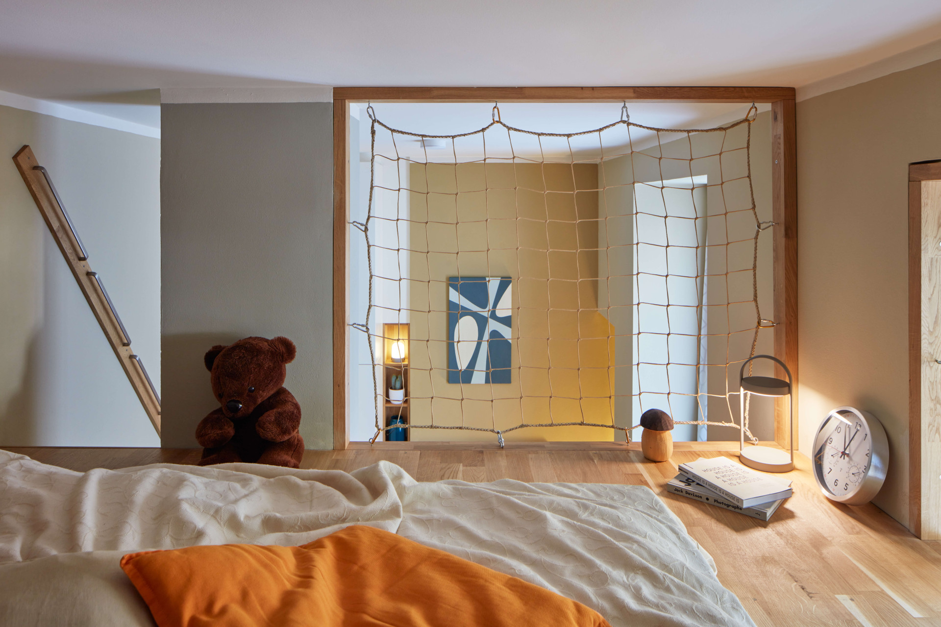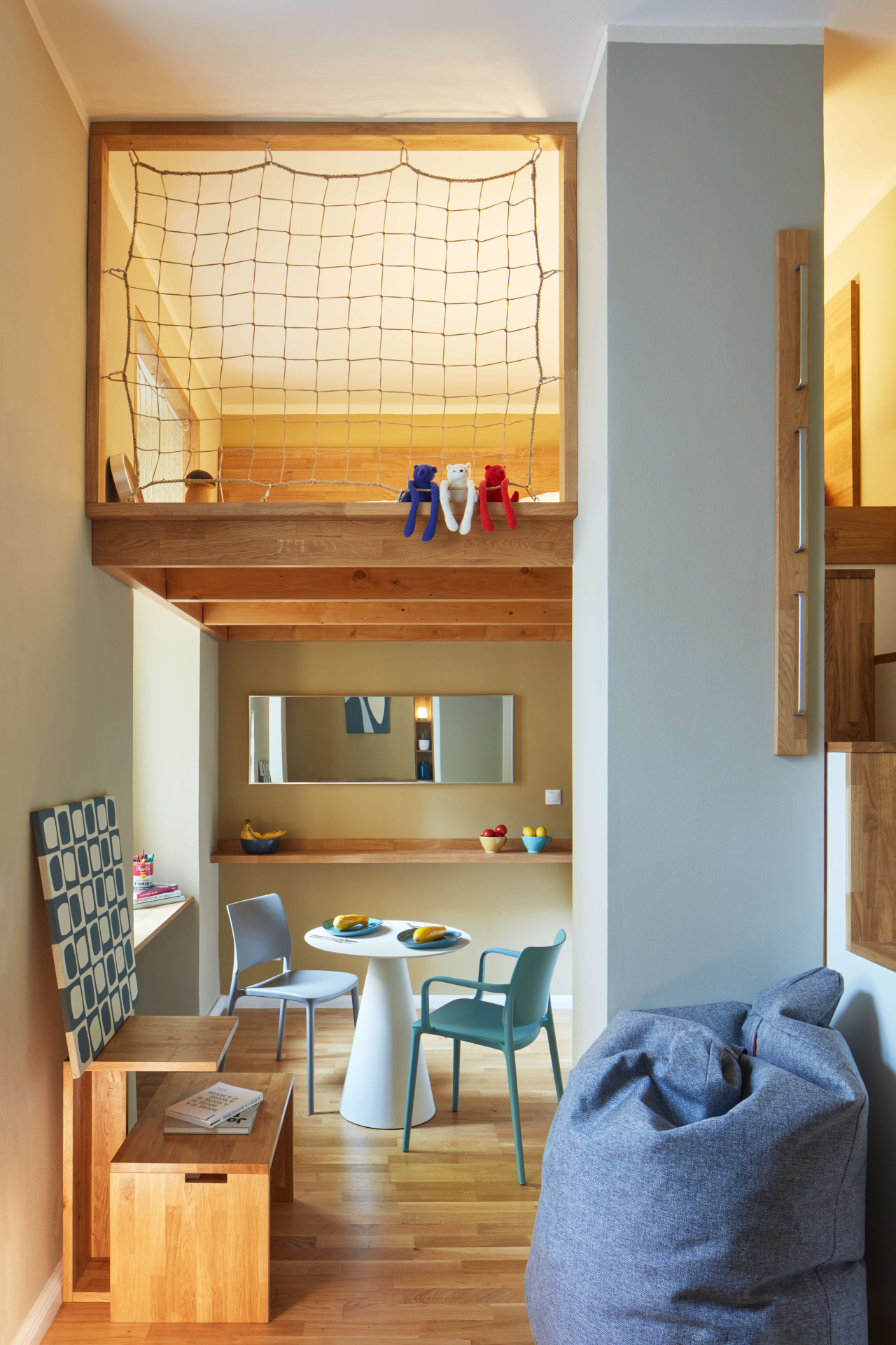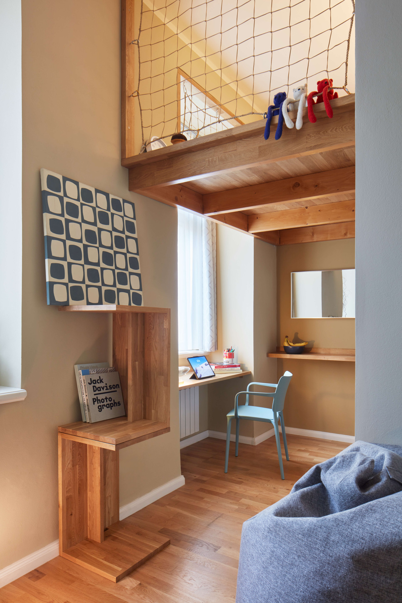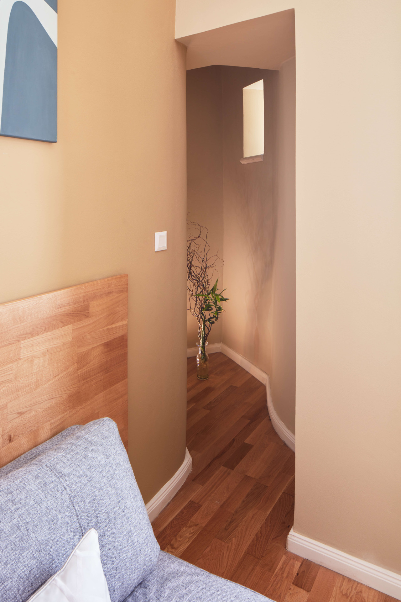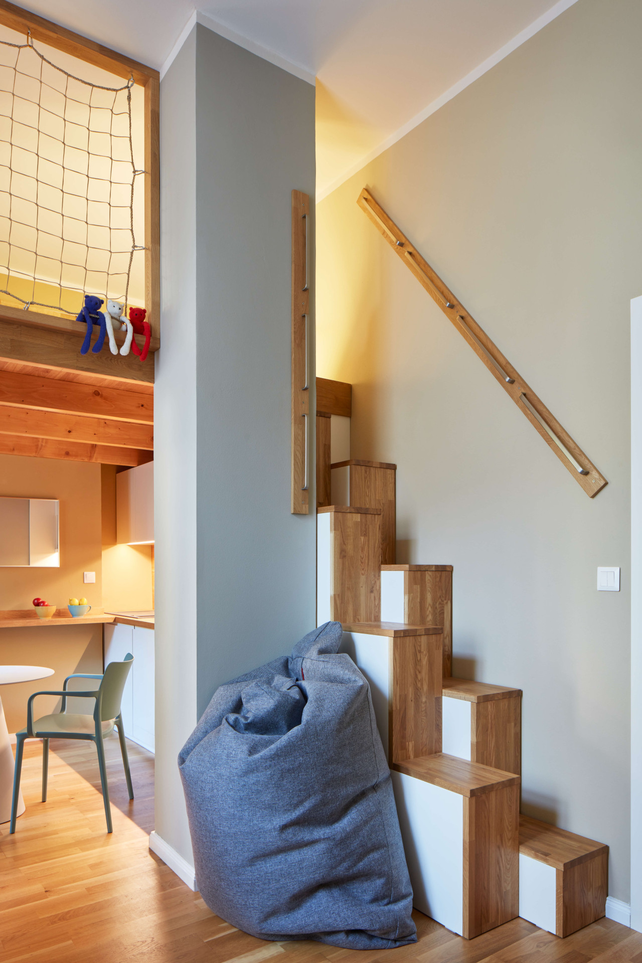 Obvyklé dilema při zařizování malých bytů je, kam umístit spaní. Tady však nebylo na výběr, prostor je malý, ale vysoký skoro 3,5 metru. Galerie na spaní byla tedy logickým řešením. Bylo ovšem potřeba se vypořádat se sloupem, který v místnosti stál. Výstup na patro se kvůli němu musel vejít na 56 cm šířky. Architekt to vyřešil variací na takzvané „mlynářské schody“, které se tradičně používají všude tam, kde by klasické schodiště bylo příliš úzké a strmé.