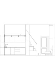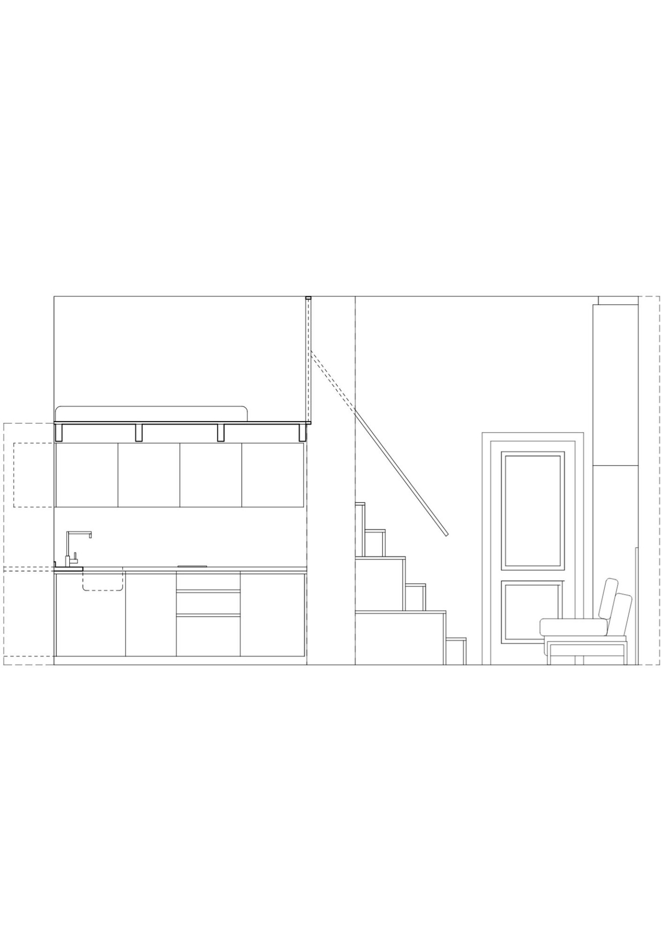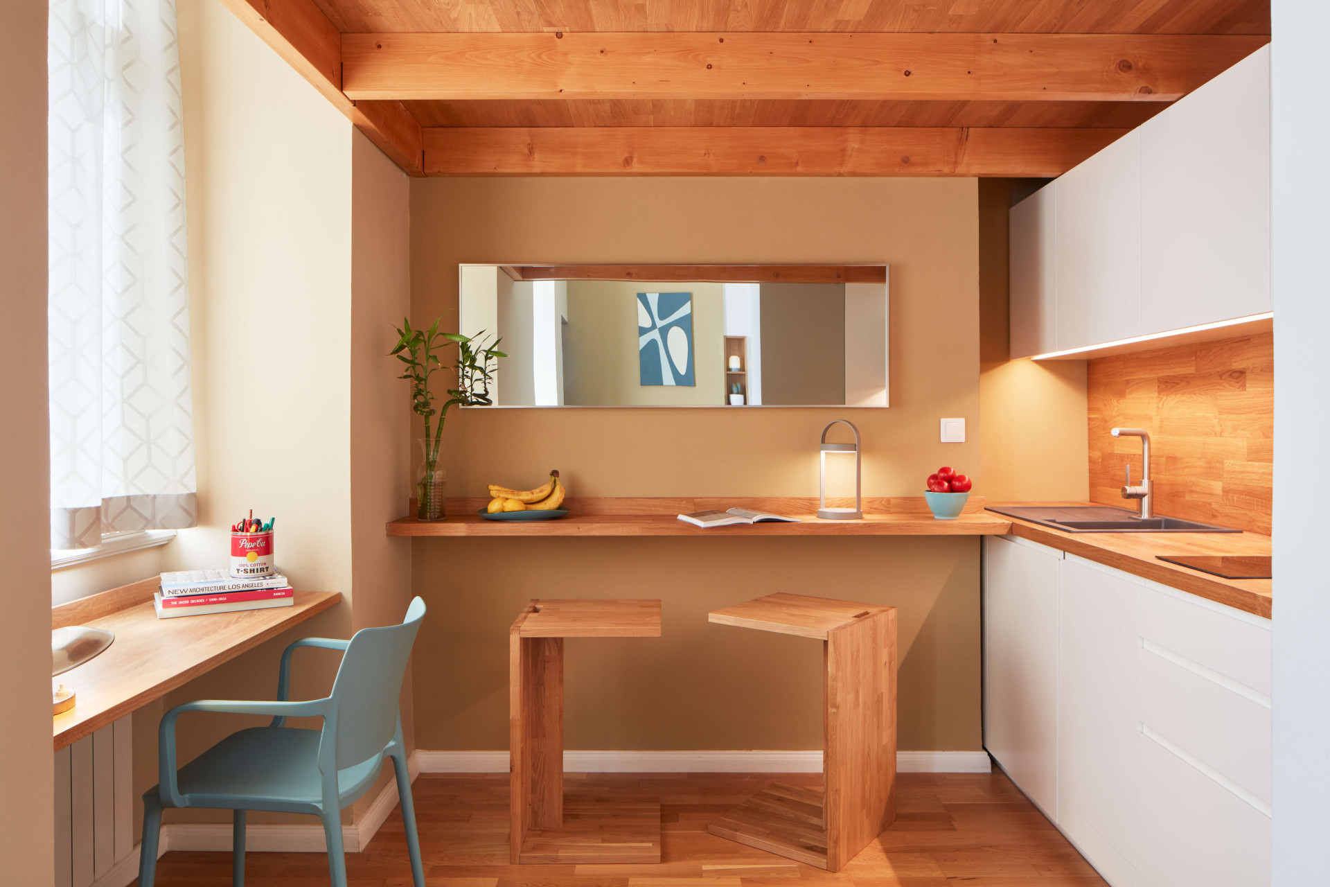 Tuhle myšlenku důsledně uplatnil. Křeslo je rozkládací, takže může posloužit jako lůžko pro návštěvu. V nice pod oknem na místě parapetu vznikl malý pracovní stůl. Minimální kuchyňskou linku doplňuje deska na zdi, která může sloužit jako rozšíření pracovní plochy na vaření, ovšem při večírku se může proměnit v barový stůl. A dále je tu ještě jeden mnohoúčelový kus vybavení, „Zacharův C stolek“, jak si architekt pojmenoval svůj skladný a multifunkční autorský nábytek.