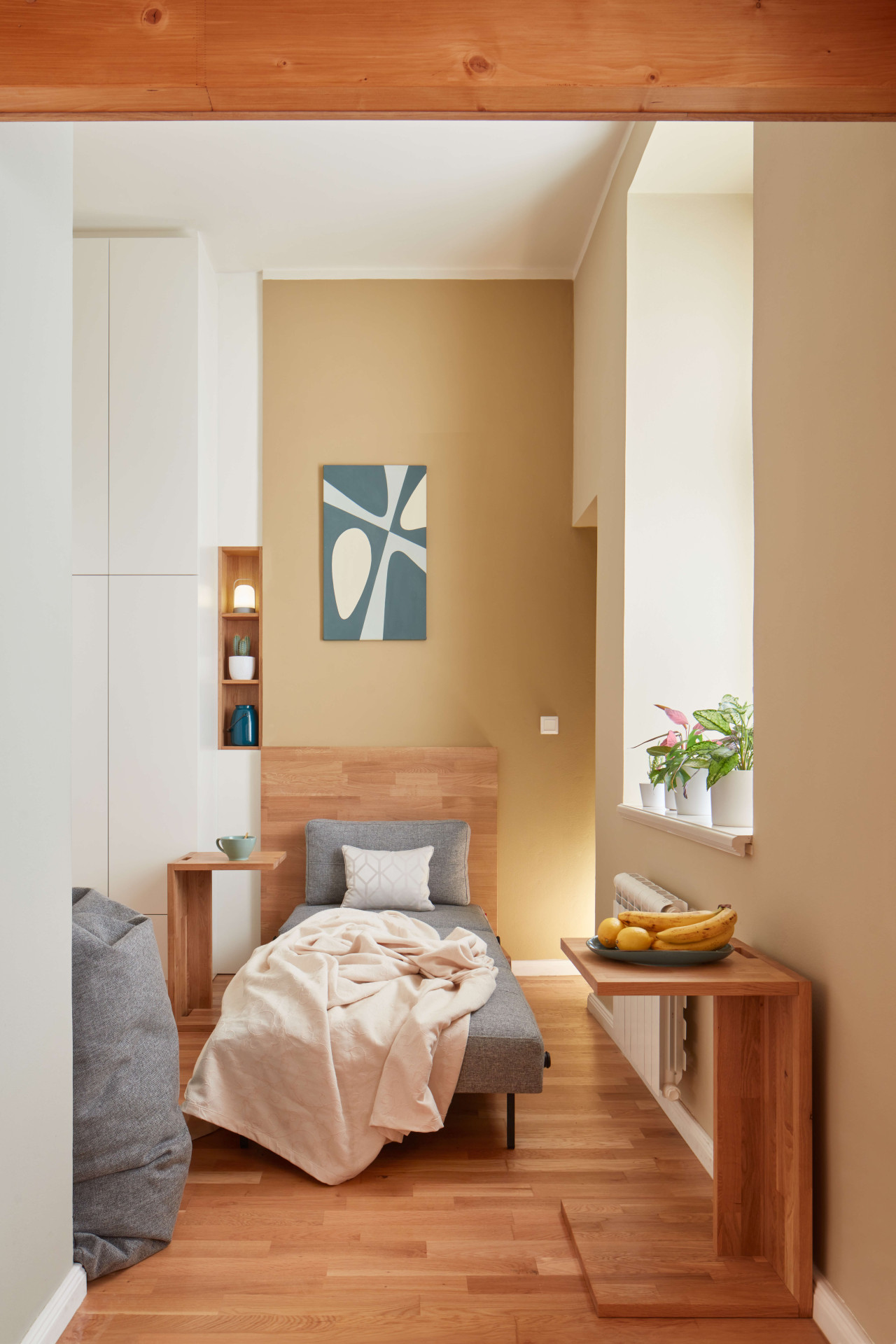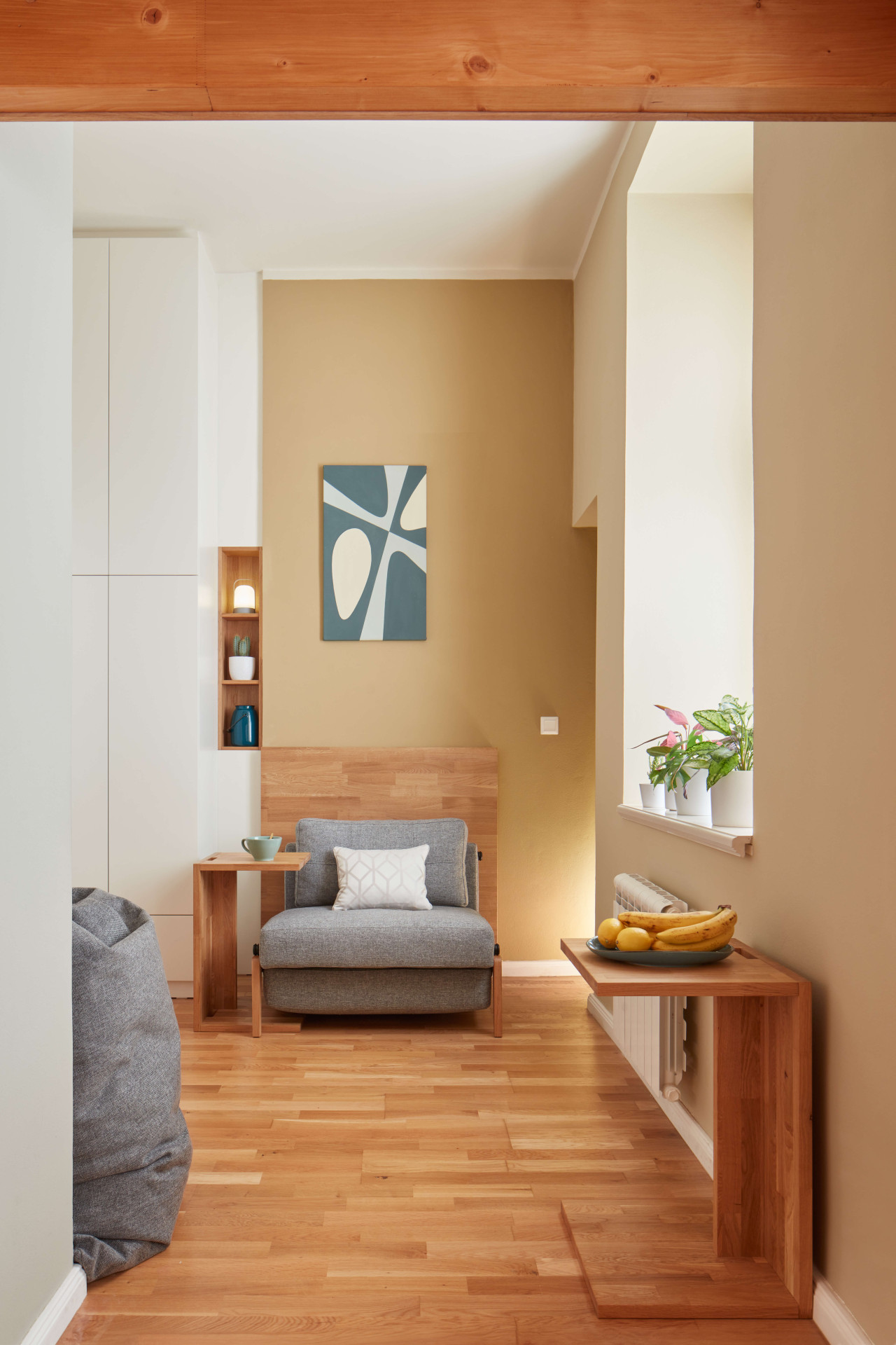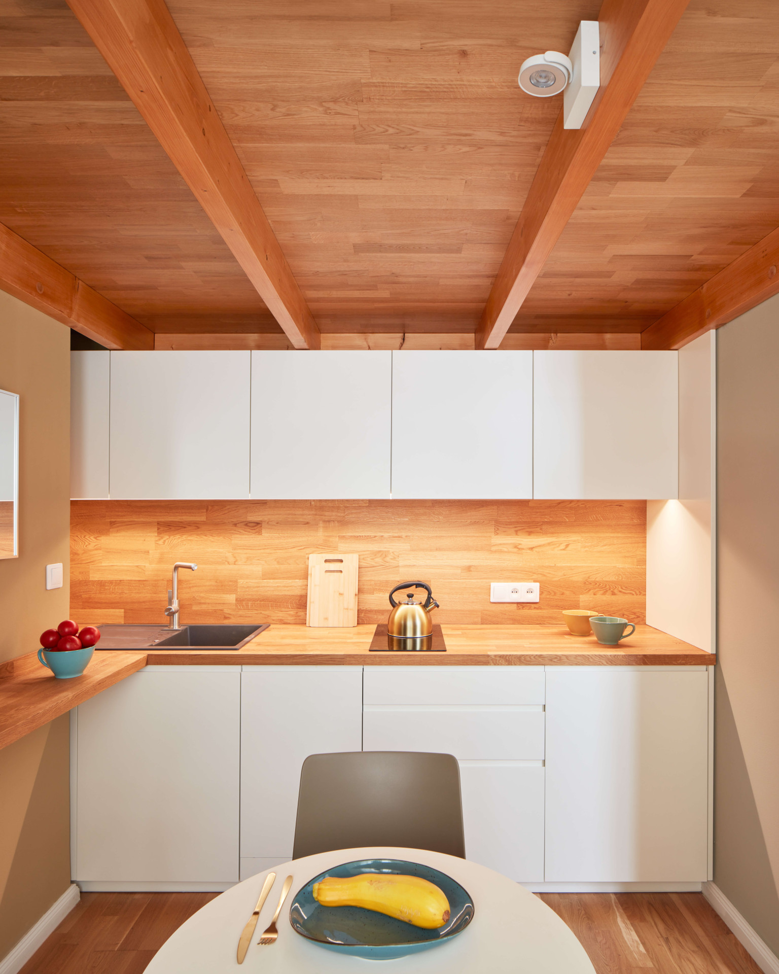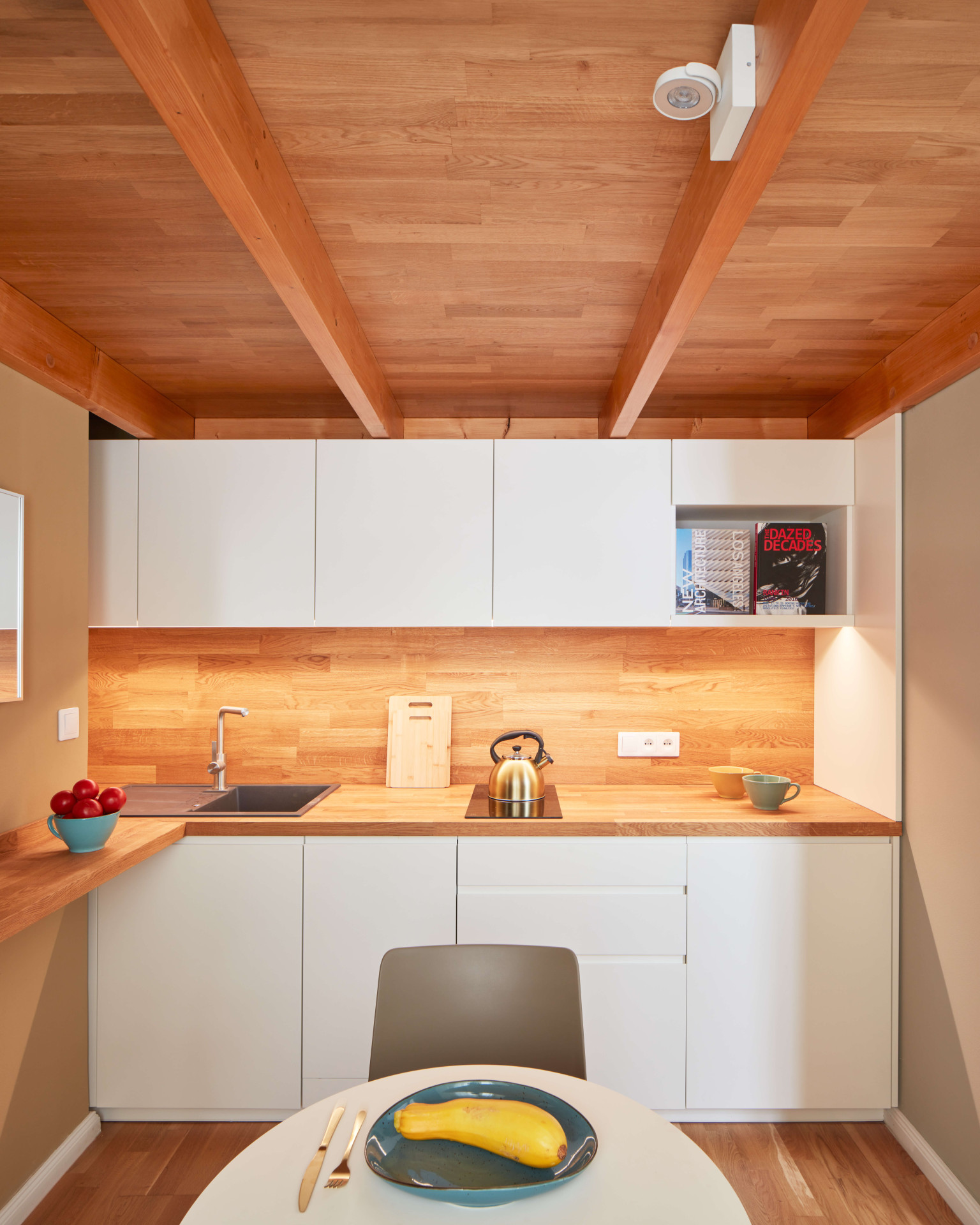 Byt je v přízemí s okny do dvora, a světla je tu málo. To byla konstanta, s níž bylo potřeba se smířit. Aby byt nepůsobil ponuře, využil architekt zemité tóny na stěnách a přírodní dřevo. Z dubu je podlaha, nábytek i spací patro. „V malém bytě je důležité, aby byl interiér jednoduchý a vizuálně klidný a používalo se co nejméně materiálů. Prostor to harmonizuje,“ vysvětluje architekt. Proto udělali ze dřeva i obklad za kuchyňskou linkou. Je to namáhané místo vystavené vlhku a kuchyňské špíně. „Časem ten obklad ztmavne. Ale podle mé zkušenosti to nevadí. Dřevo stárne hezky a i poškrábaná architektura je pořád architektura,“ říká Ivan Zachar. A když je něco kvalitně navrženo a provedeno, stopy stárnutí nevadí.