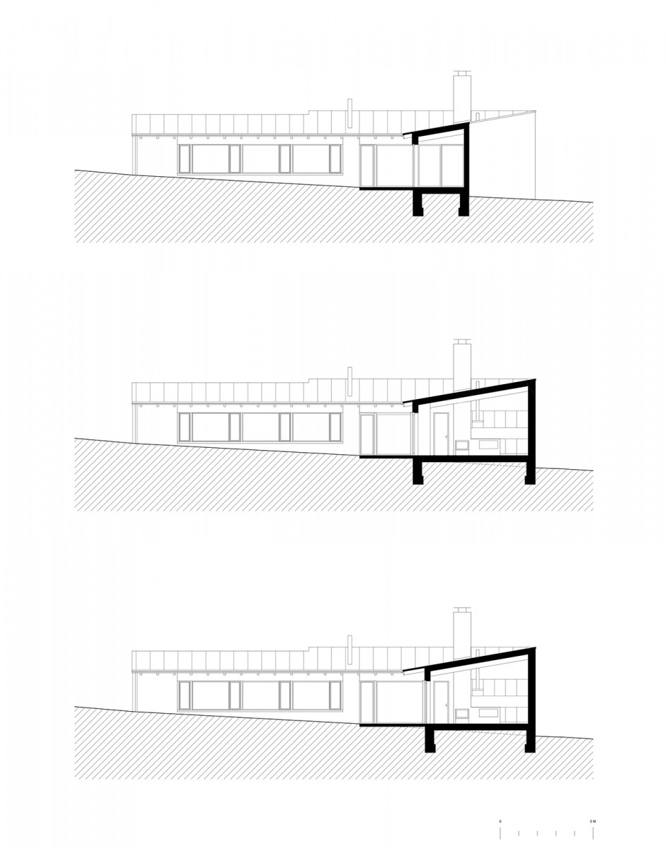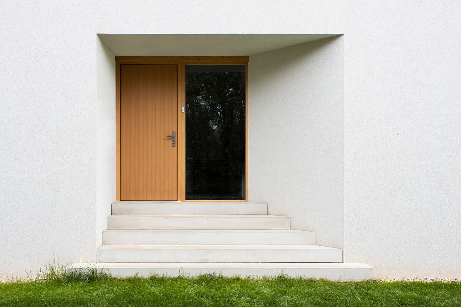 Nízká stavba byla koncipována tak, aby majitelům poskytla patřičnou míru soukromí. Směrem k příjezdové cestě a dvorku se proto obrací fasádou s malými okny. Do velké zahrady se naopak otevírá pomocí posuvných oken. „Zatímco ke dvorku na severu se dům staví hladce omítnutou zdí s minimem otvorů, směrem na jih do zahrady se maximálně otevírá prostřednictvím rozměrných prosklených ploch s bohatou tektonikou subtilních prvků dřevěné konstrukce, okenních rámů či roletového stínění,“ přibližuje Vít Podráský.