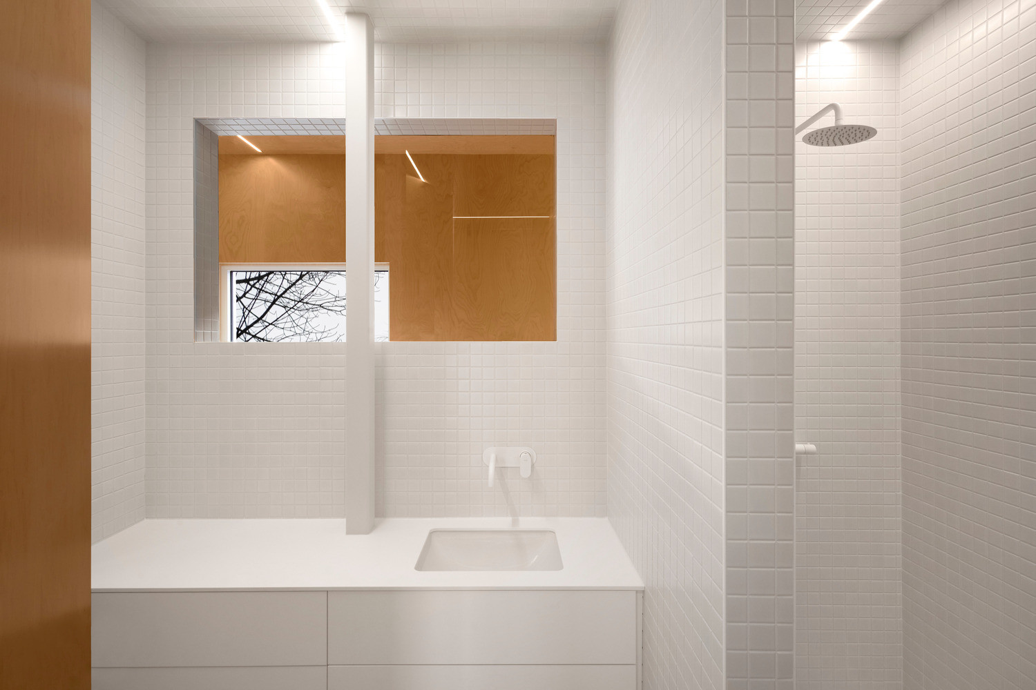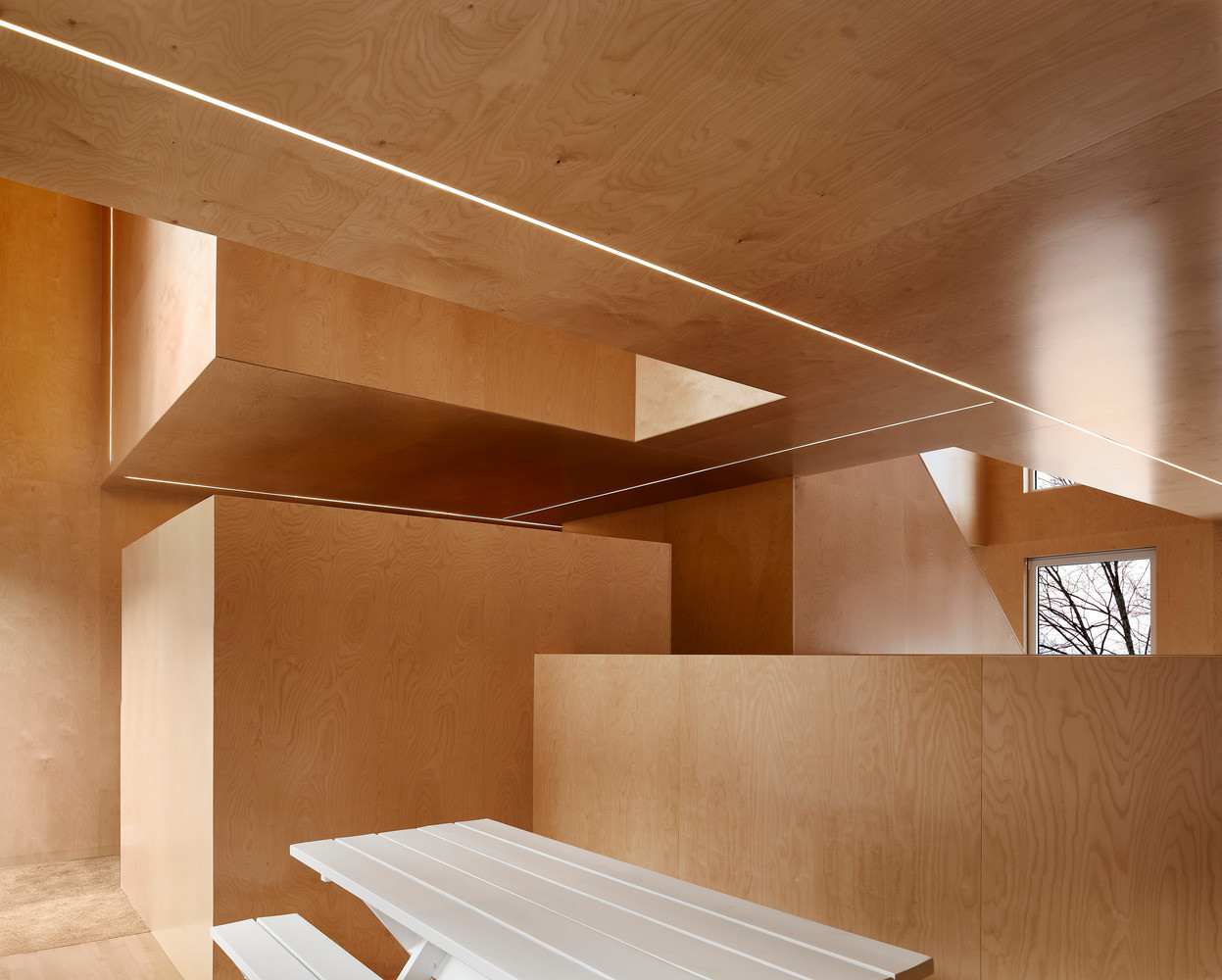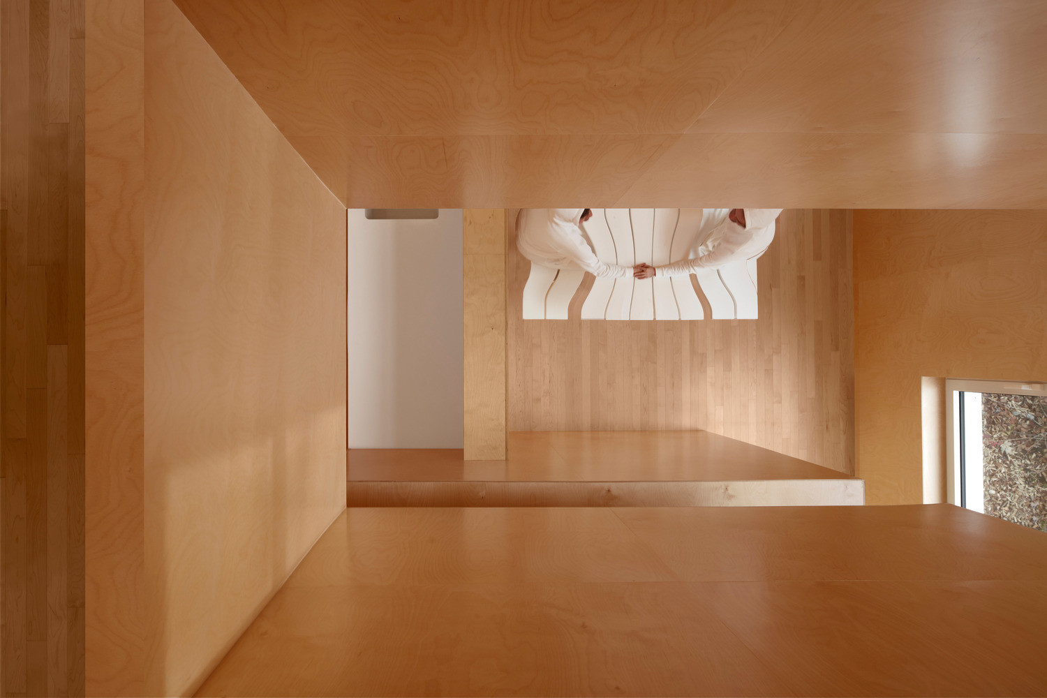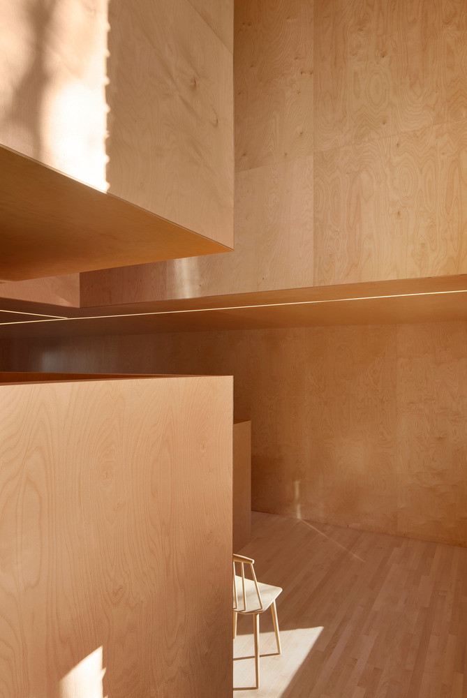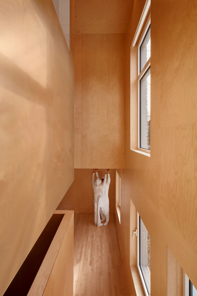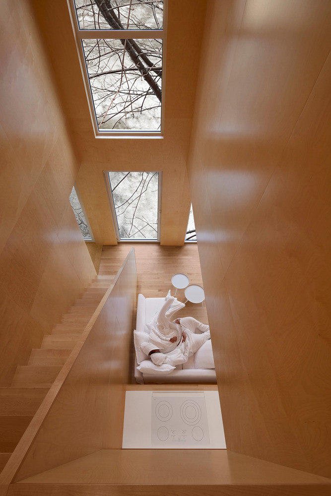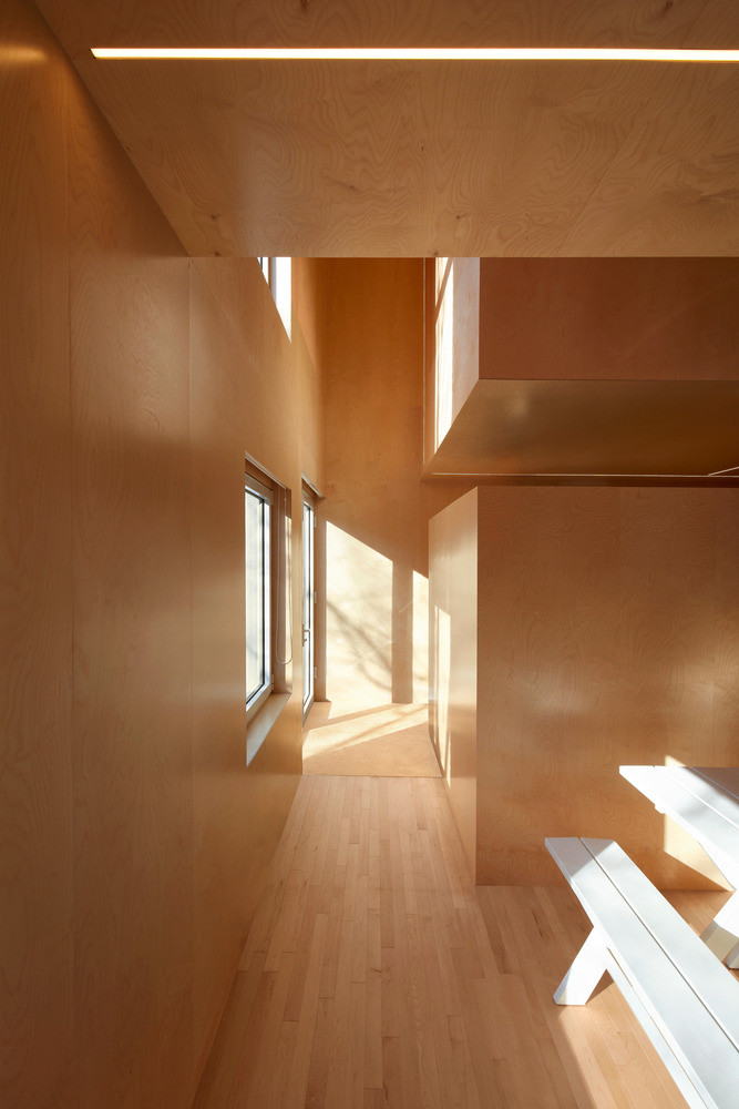 Vzhledem k jasnému ortogonálnímu rozvrhu fasád domu interiér působí až krystalicky. Architekti nechali všechny stěny, příčky i stopy pokrýt obkladem z dřevěné dýhy a vytvořili tak zcela monochromní prostor. S barvou dřeva kontrastuje pouze bílé vybavení navazující na barvu fasády. Dům v Montrealu je skutečně plný kontrastů – prostorových i barevných.