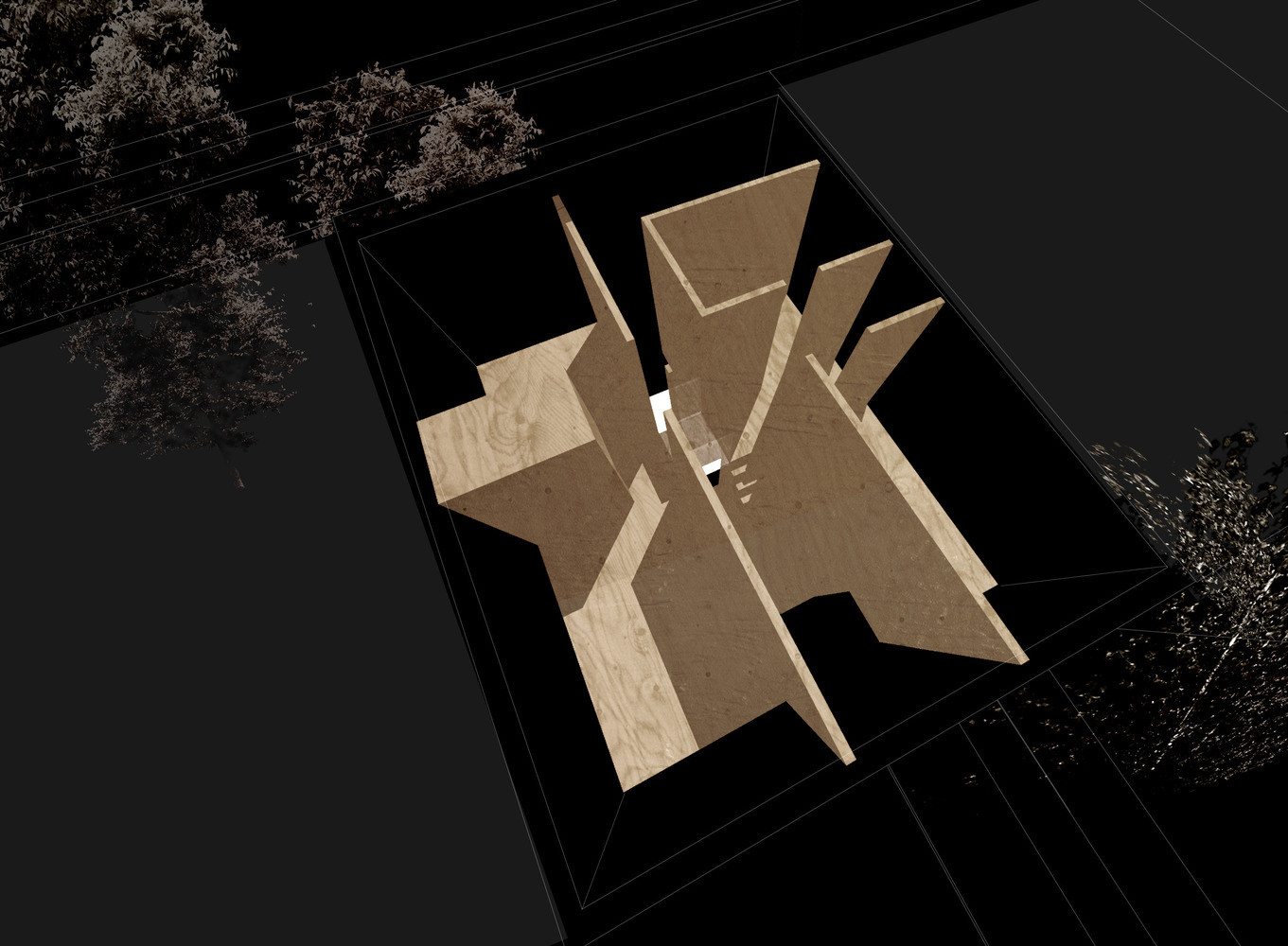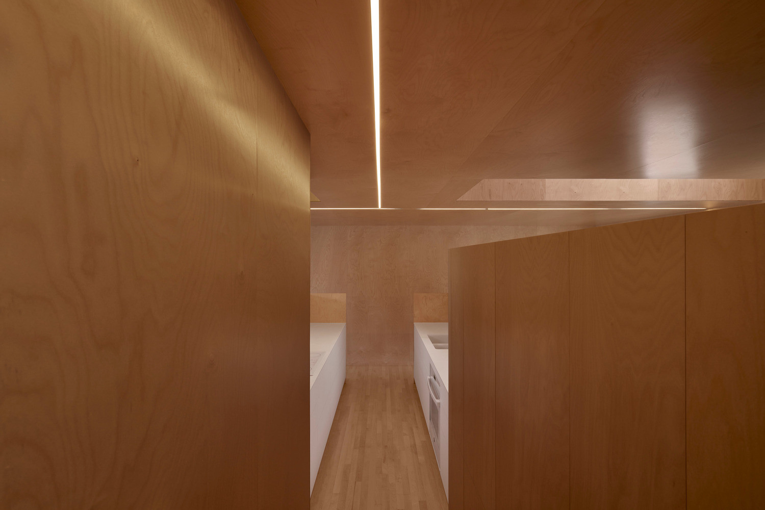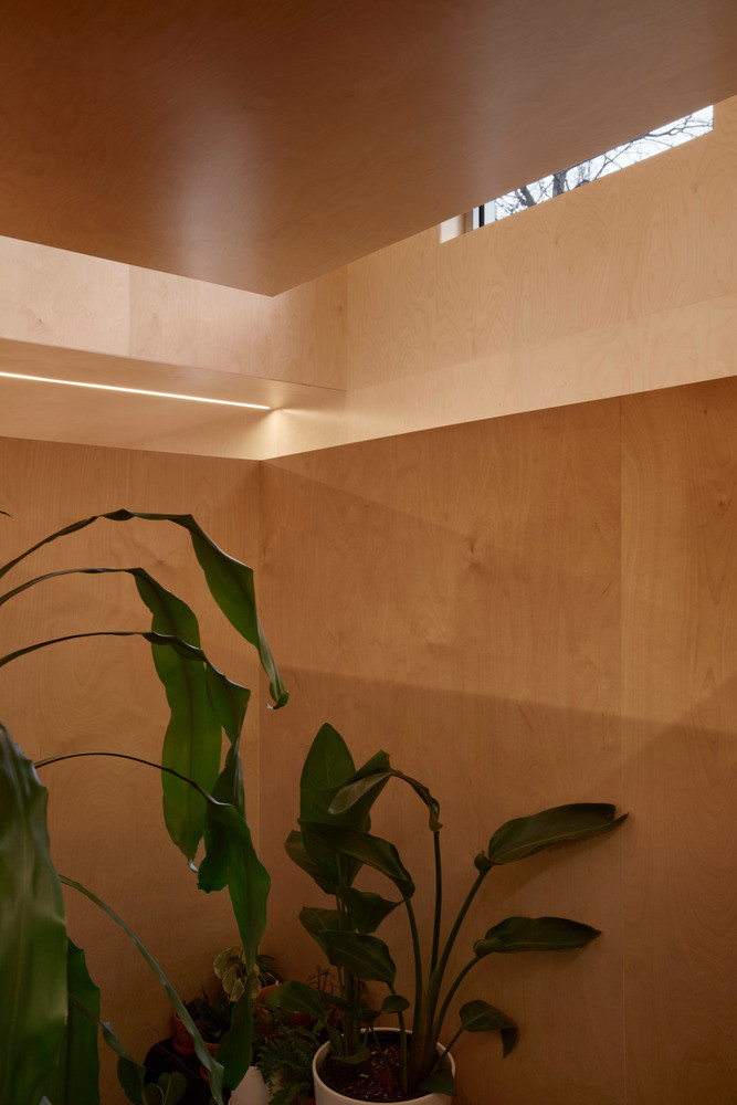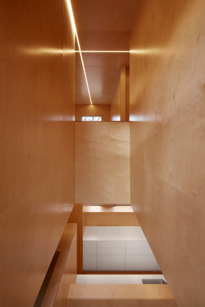 Všemi místnostmi prochází netradičně řešené osvětlení. To ve formě přímých linek připomínajících ostré laserové paprsky rozřezává dřevěné povrchy. Když se večer setmí a majitelé domu tato světla rozsvítí, vyjde netradiční řešení interiéru najevo i do ulice. Příčky dělící prostor fungují jako clony bránící průhledu do soukromých místností. Ty se naopak velkoryse otevírají směrem do malé zahrady – pro anglické řadové domky tak typické – vnitřní „atyp“ se znovu potkává s „typem“.