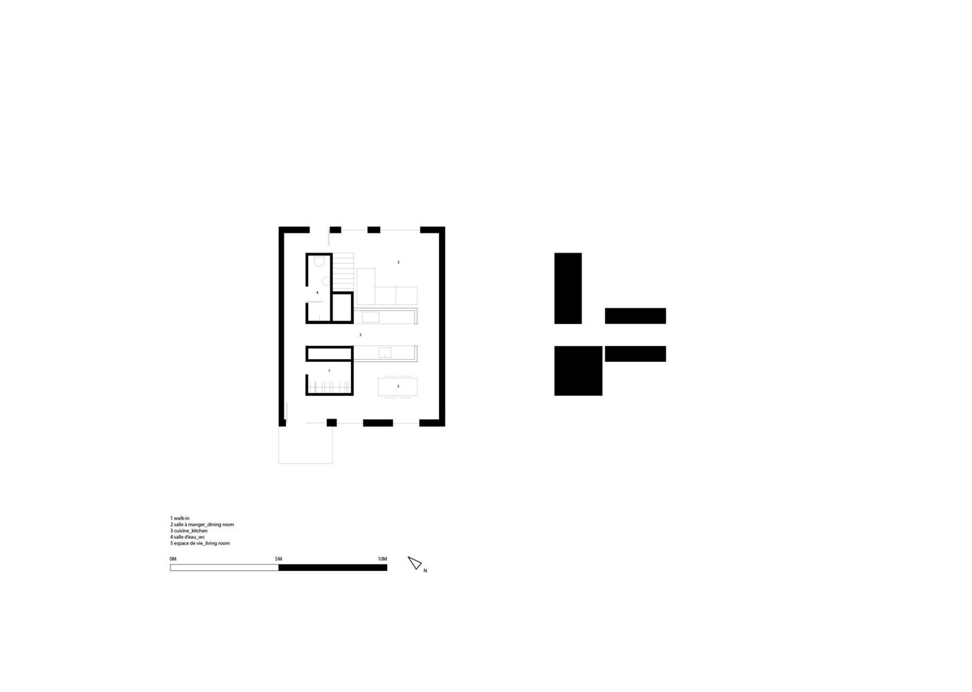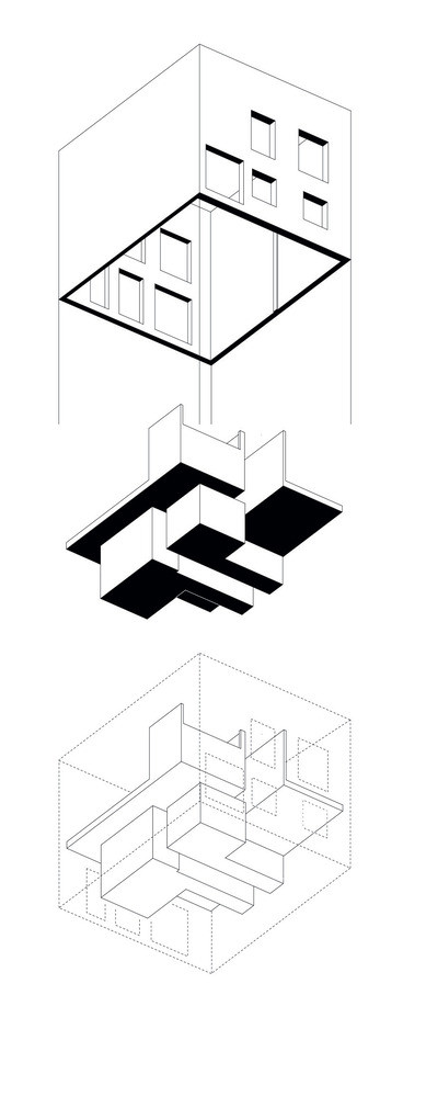 Přestavbu domu pod vedením hlavního architekta Jeana Vervilla studio navrhlo pro mladé investory Mathieua a Benjamina. Cílem bylo jim stavbu co nejvíce přizpůsobit a individualizovat. Výsledkem se stal velmi unikátní interiér s rafinovanou dispozicí. Architekti ji realizovali jako asambláž – různě do sebe zaklesli horizontální i vertikální příčky, vytvořili množství podlaží a zákoutí, které se vzájemně propojují ale i izolují. Složitě popsatelný vnitřní prostor sami architekti definují jako abstraktní. „Prostor se proměňuje od archetypu k abstrakci,“ říkají.