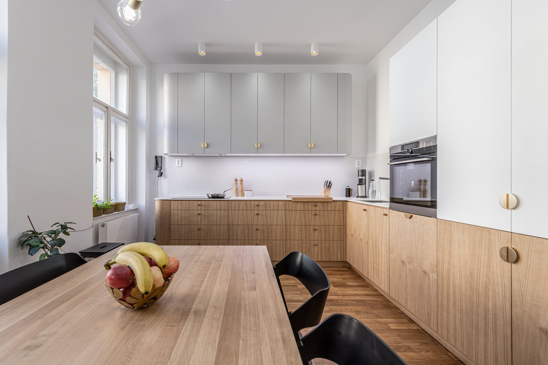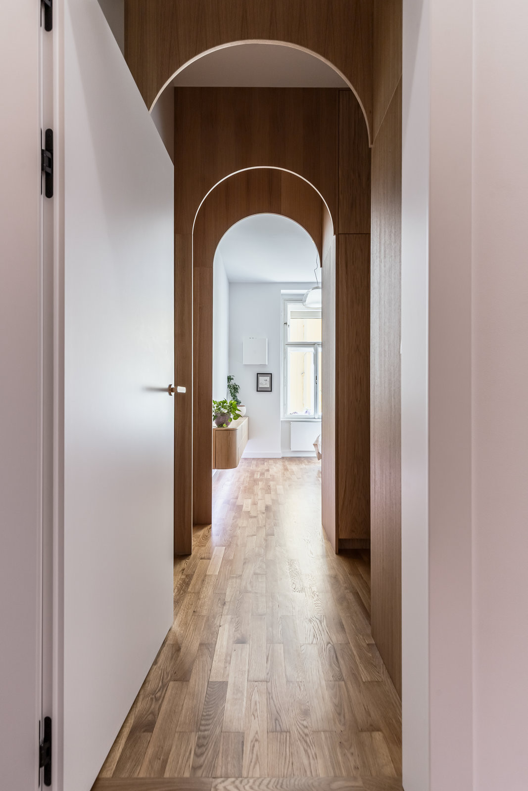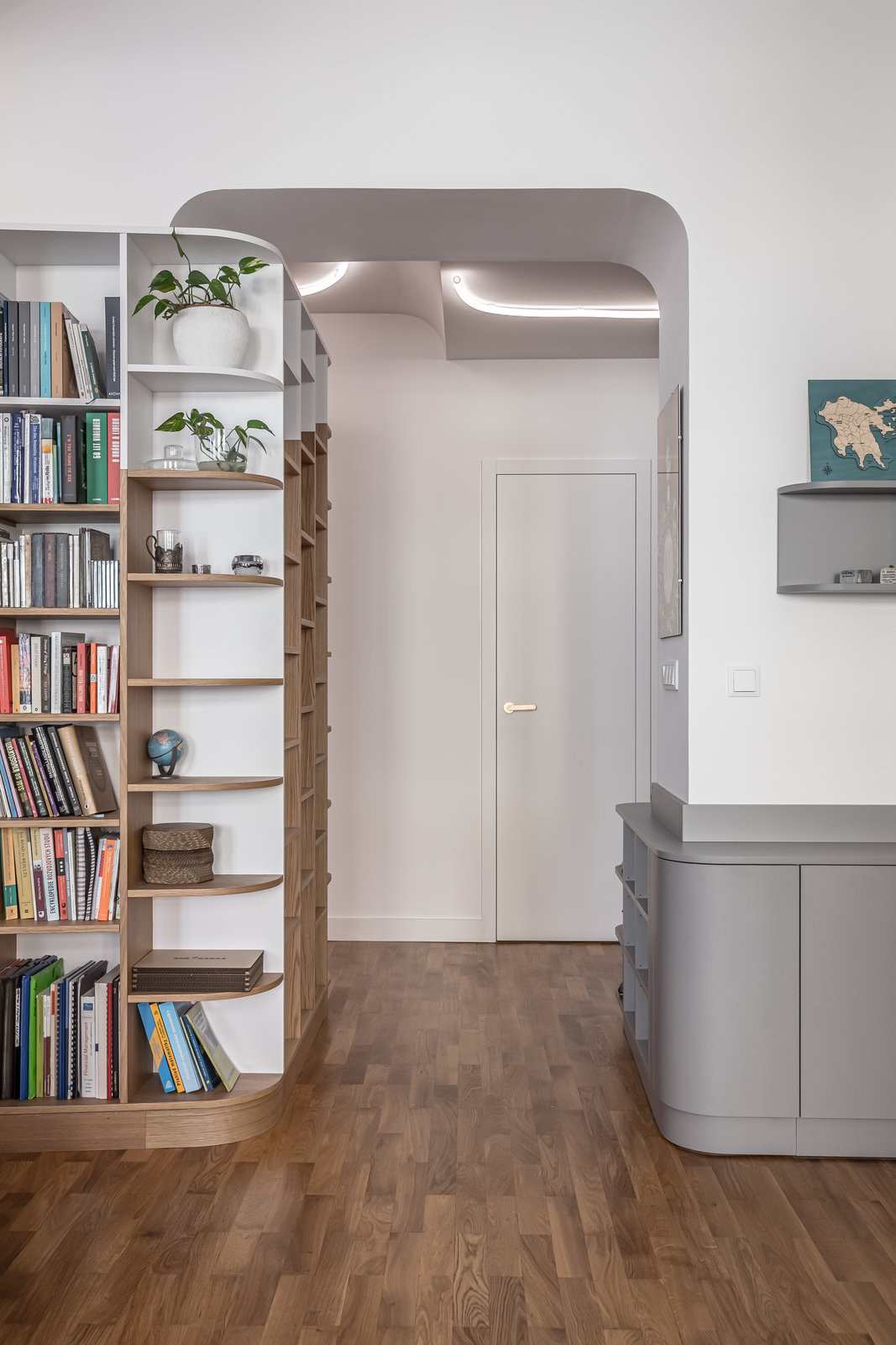 Jemné oblouky a měkké hrany jsou klíčovým sjednocujícím prvkem interiéru. Obyvatelé bytu se nemusejí bát grotesknosti štukovaných oblouků z konce devadesátých let, jelikož jemné oblouky naopak působí přirozeně. Prostor díky nim získává plynulost a nenucený šmrnc.