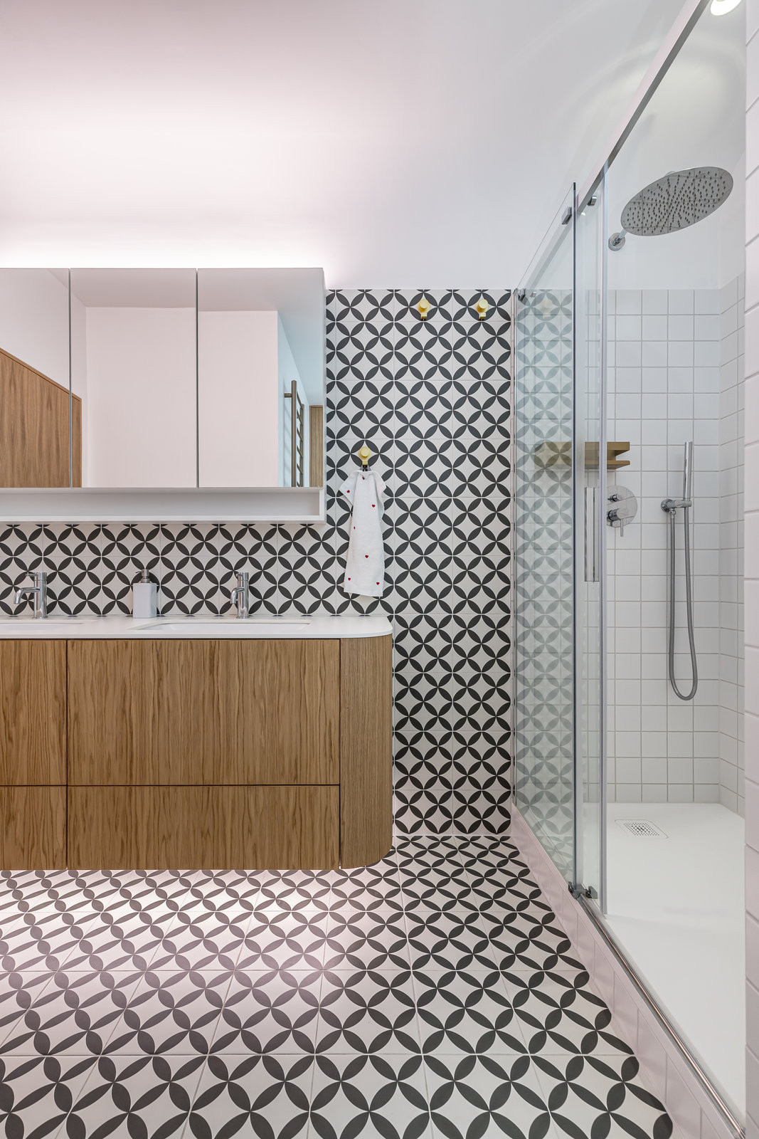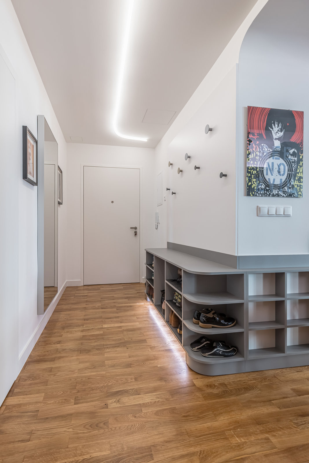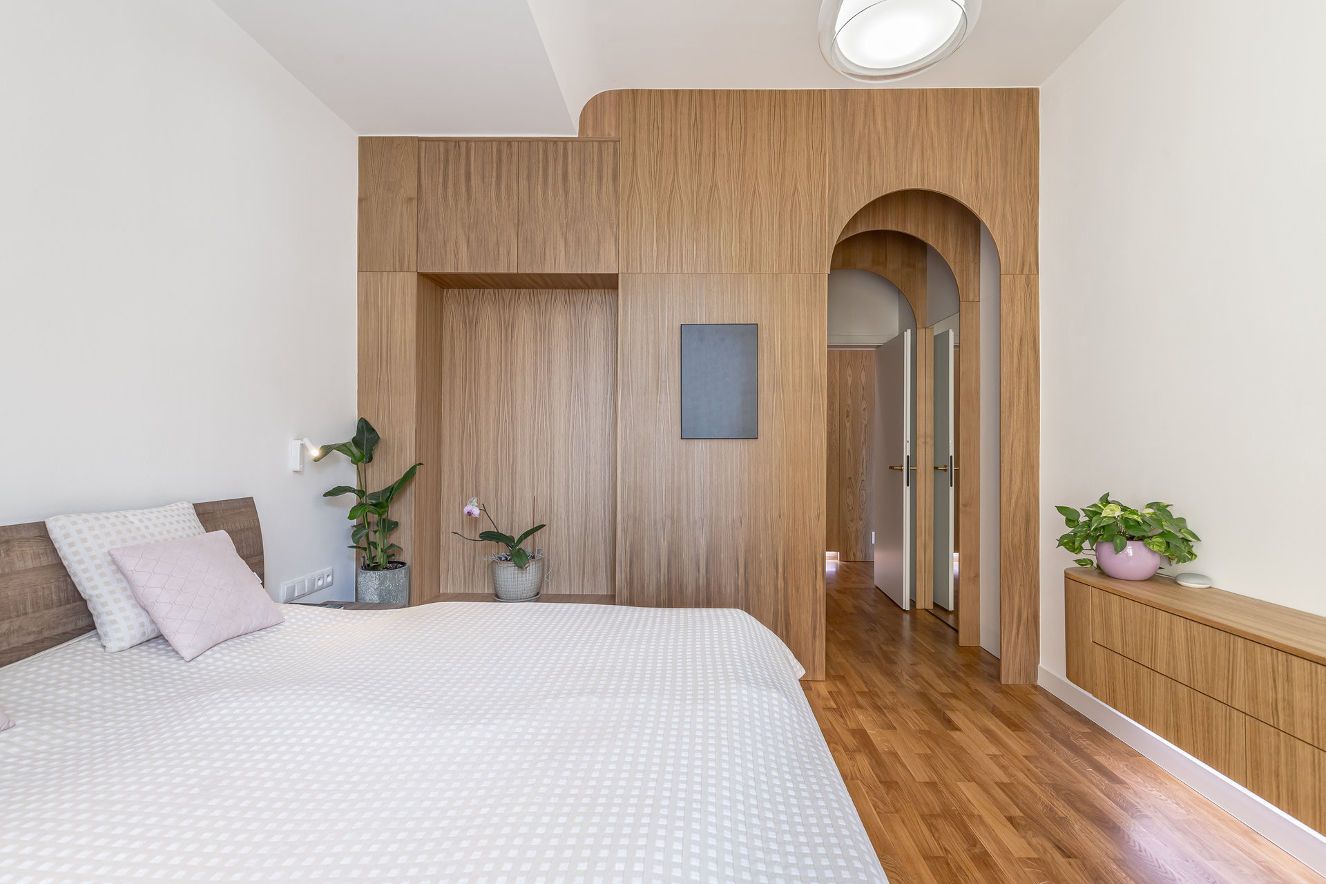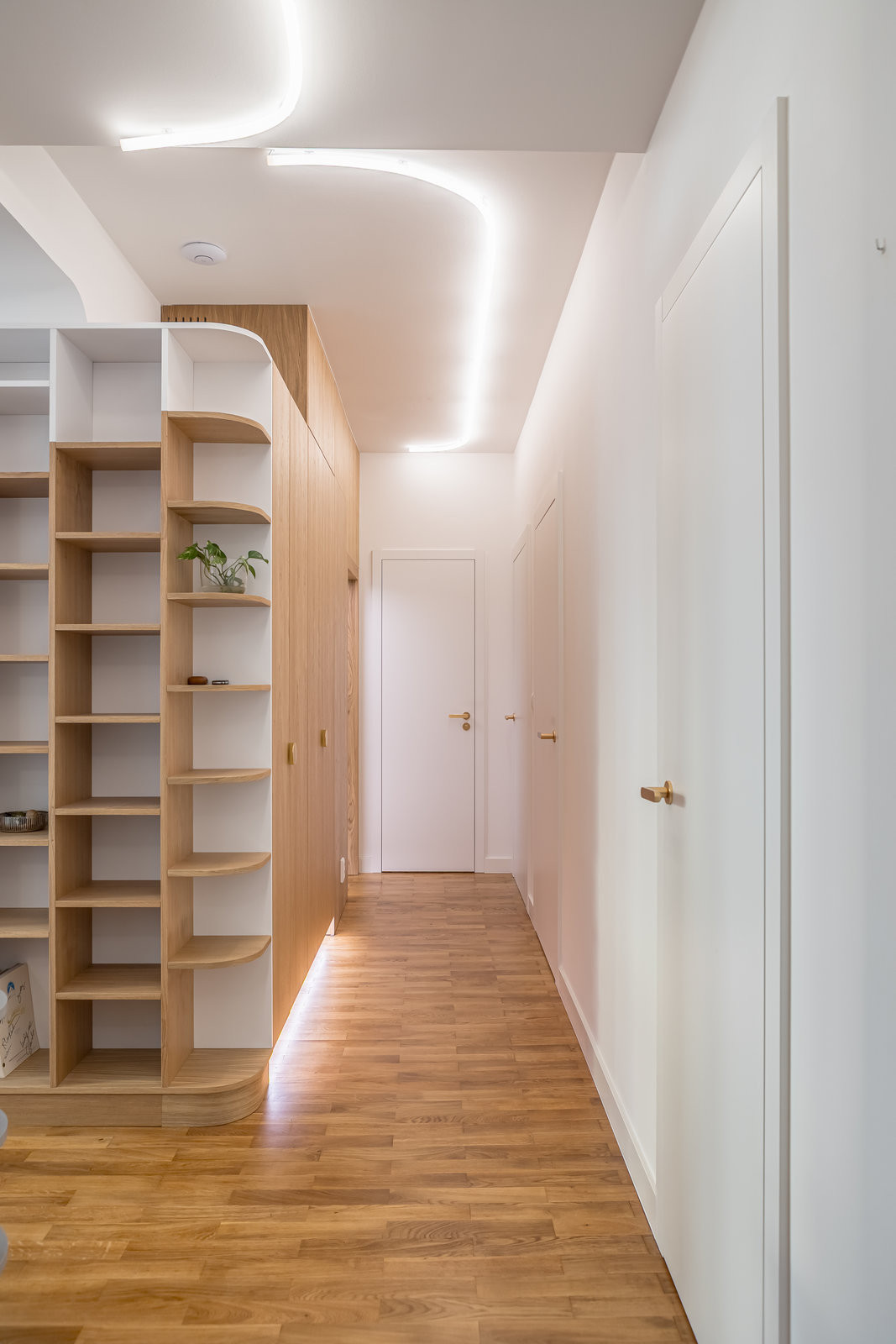 Jemné oblouky a měkké hrany jsou klíčovým sjednocujícím prvkem interiéru. Obyvatelé bytu se nemusejí bát grotesknosti štukovaných oblouků z konce devadesátých let, jelikož jemné oblouky naopak působí přirozeně. Prostor díky nim získává plynulost a nenucený šmrnc.