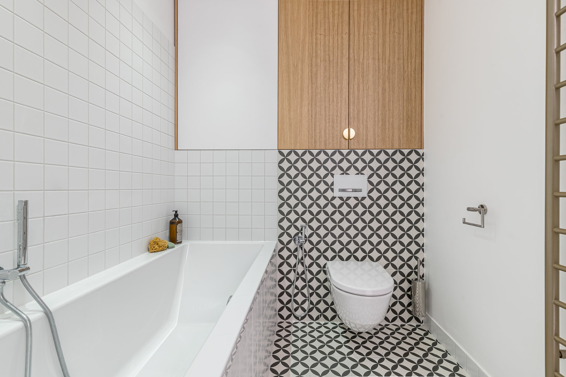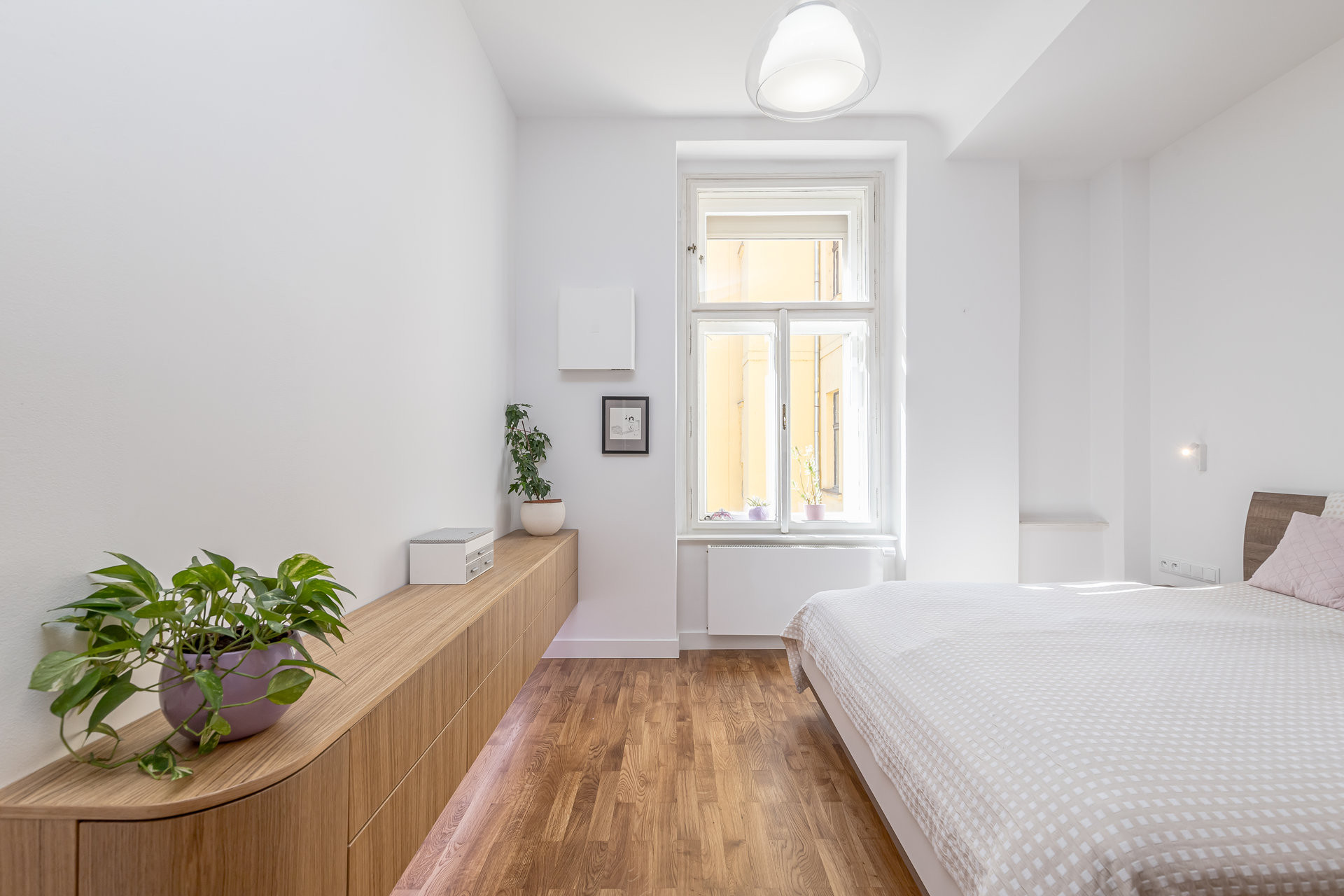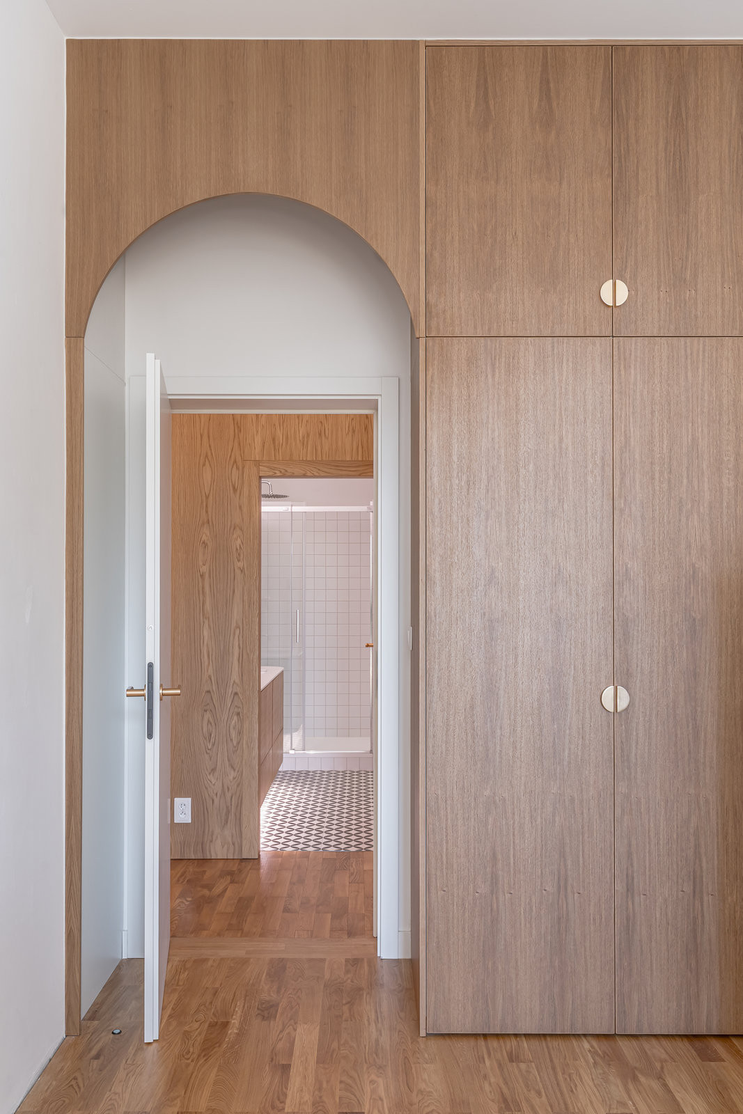 Interiér bytu stojí na kombinaci světlých barev, teplého dřeva a jemných detailů, které prostoru dodávají osobitost. Minimalismus zde není chladný ani formální, ale funkční a klidný. Každý prvek má své místo a smysl, a to i bez zbytečných gest. Nové dveře dorostly až ke stropu, aby prostor působil vzdušněji a světlo mohlo volně proudit bytem. Teplé tóny dřevěných parket odrážejí denní světlo hluboko do dispozice, až k šatně, která nahradila jednu z původních koupelen.