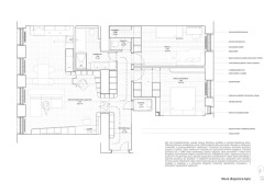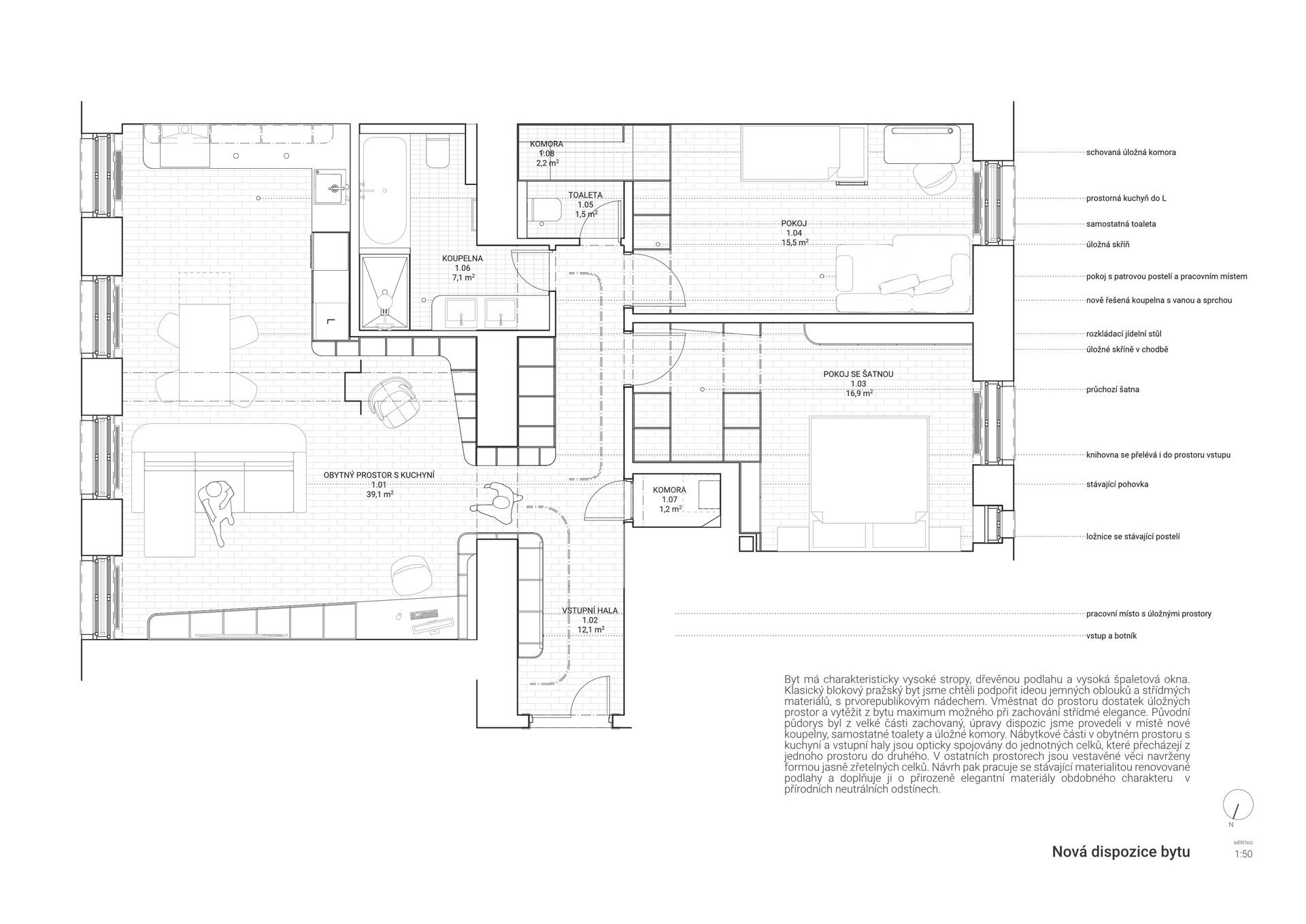 Srdcem bytu se stává obývací prostor s kuchyní, jídelním stolem a knihovnou. Místo, kde se vaří, pracuje, čte i odpočívá, a to často i zároveň, aniž by si jednotlivé aktivity vzájemně překážely. Příjemný pracovní kout pro home office, velkorysá světlá kuchyň pro kulinářské zážitky a útulná knihovna vytvářejí prostředí, které se přizpůsobuje každodennímu rytmu domácnosti 21. století. Zadání klientů bylo od začátku jasné: byt má spojovat, ne rozdělovat. Dispozice tomu odpovídá, je otevřená, velkorysá, ale stále útulná.