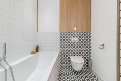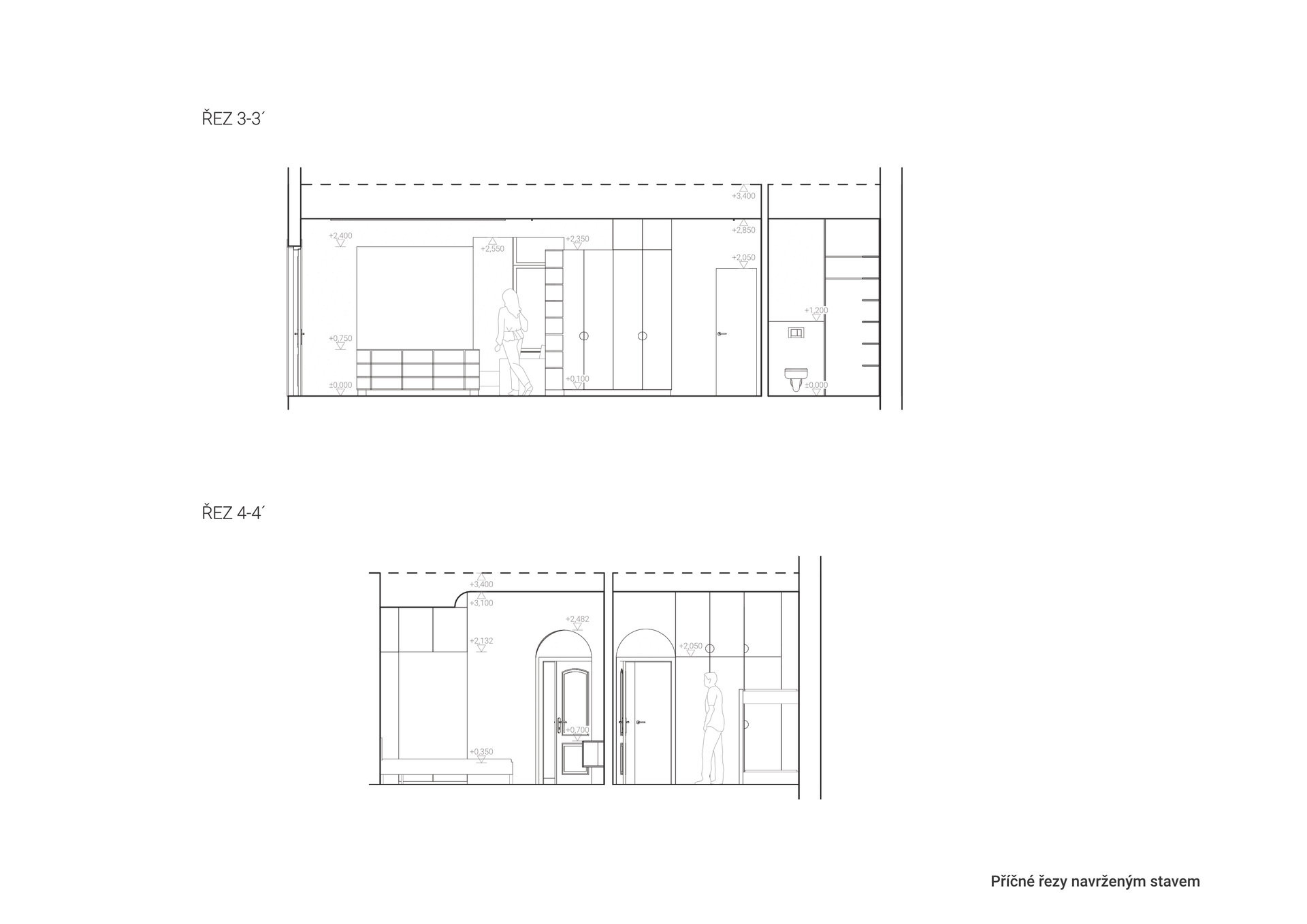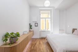 Ložnice je navržena jako útočiště po celém dni. Tónované a laděné barvy, jemné textilie a možnost úplného zatemnění vytvářejí ideální podmínky pro hluboký spánek. Jednoduchost a funkčnost prostoru tu jdou ruku v ruce s pocitem komfortu. Koupelna poskytuje klidné zázemí, kde se denní rutina přirozeně zpomaluje. Dvě samostatná umyvadla, vana a promyšlené umělé osvětlení podporují přirozený rytmus dne. Oba prostory vytvářejí protiváhu otevřenému dennímu životu bytu a umožňují skutečný odpočinek bez rušení.