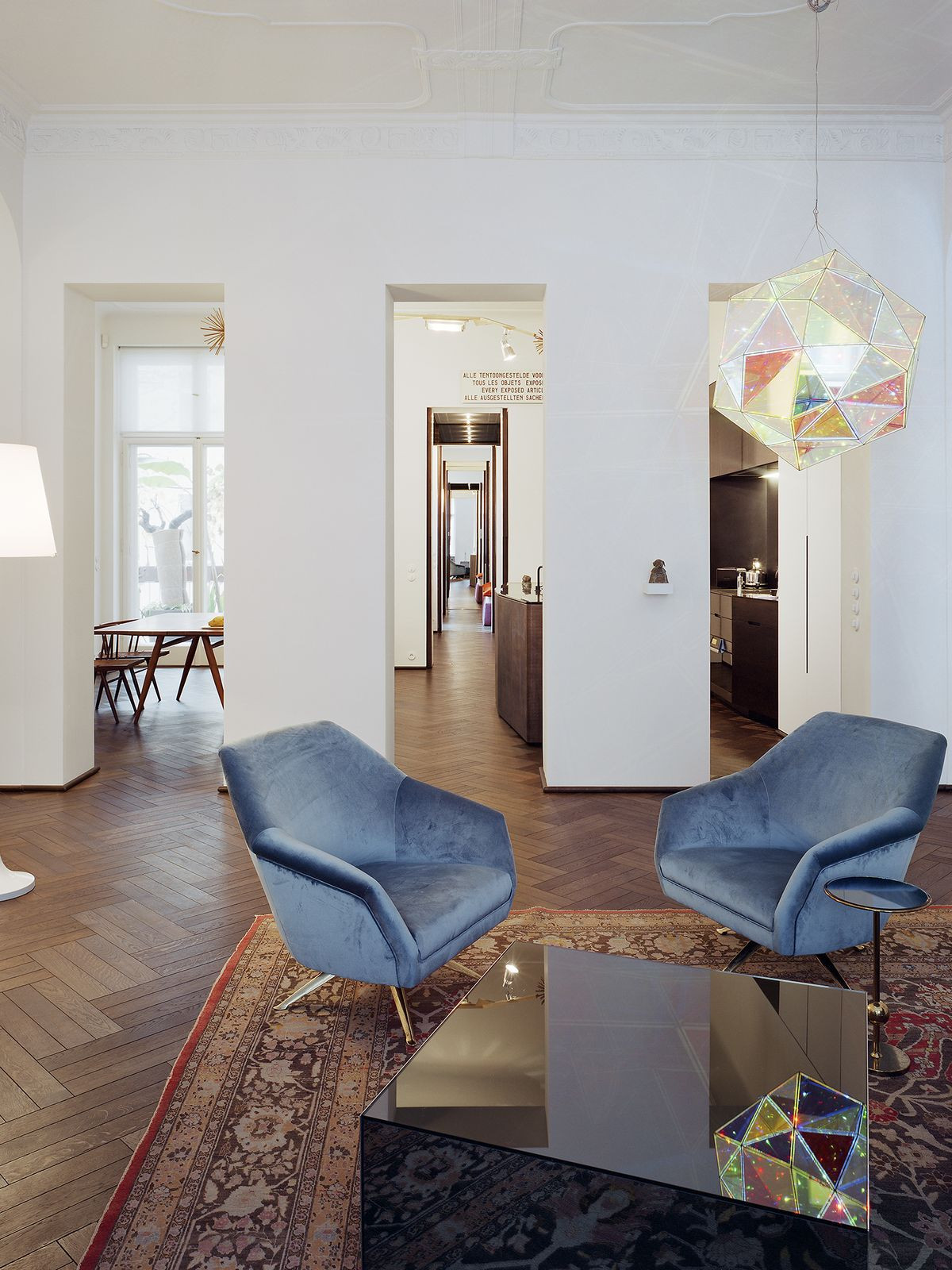 Starý buržoazní byt se nachází v Charlottenburgu v Berlíně. Měl poměrně složitou dispozici, takže muselo dojít k velkým stavebním úpravám. Úzké chodby se pospojovaly a staly se z nich reprezentativní místnosti, z kterých pak lze vstoupit do menších. Několik stěn bylo zbouráno úplně a do několika nosných byly vybourány prostupy.