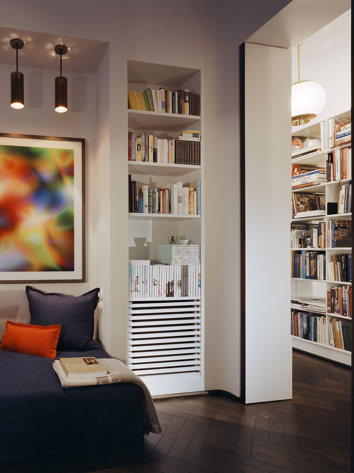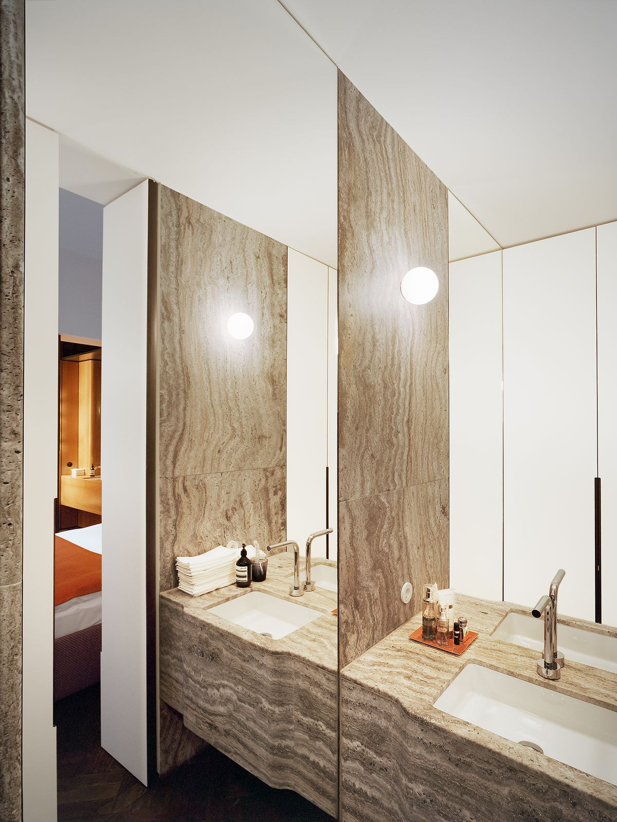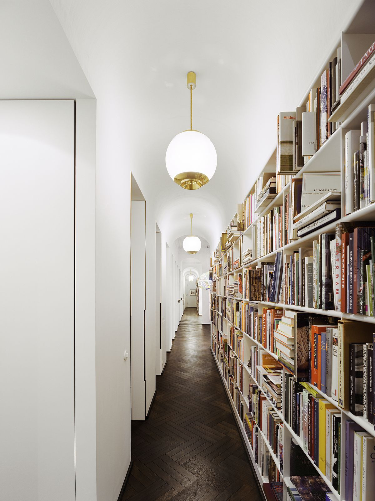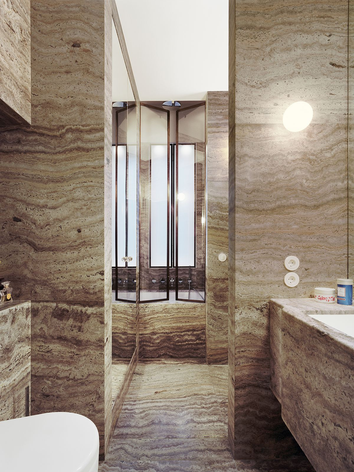 Luxusní pojetí bytu je podtrženo i římskými lázněmi a kamenným obkladem koupelen. Aby ze všeho dohromady nevzešel pouze kýč, architekt Thomas Kröger byl v dalších ohledech velice minimalistický. Podlaha je z tmavého lamelového dřeva, dveře jsou bílé, kliky jednou černou linií, zárubně jsou nepostřehnutelné. Architekt si dovolil i menší vtip. Na konec nejdelší chodby s knihovnou po jedné straně a vstupy na druhé umístil zrcadlo. Úzká dlouhá chodba je tak ještě užší a delší.