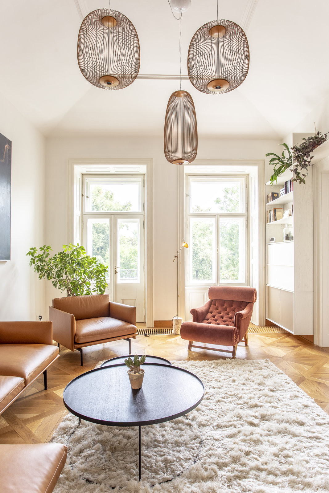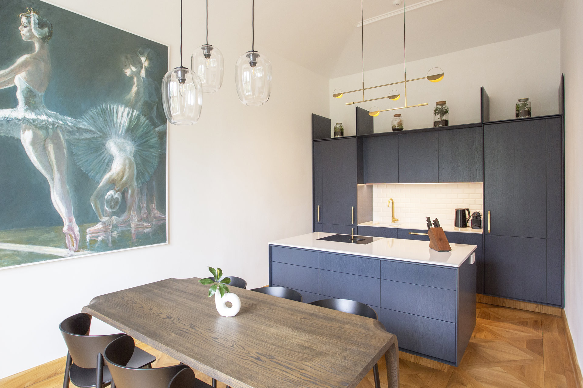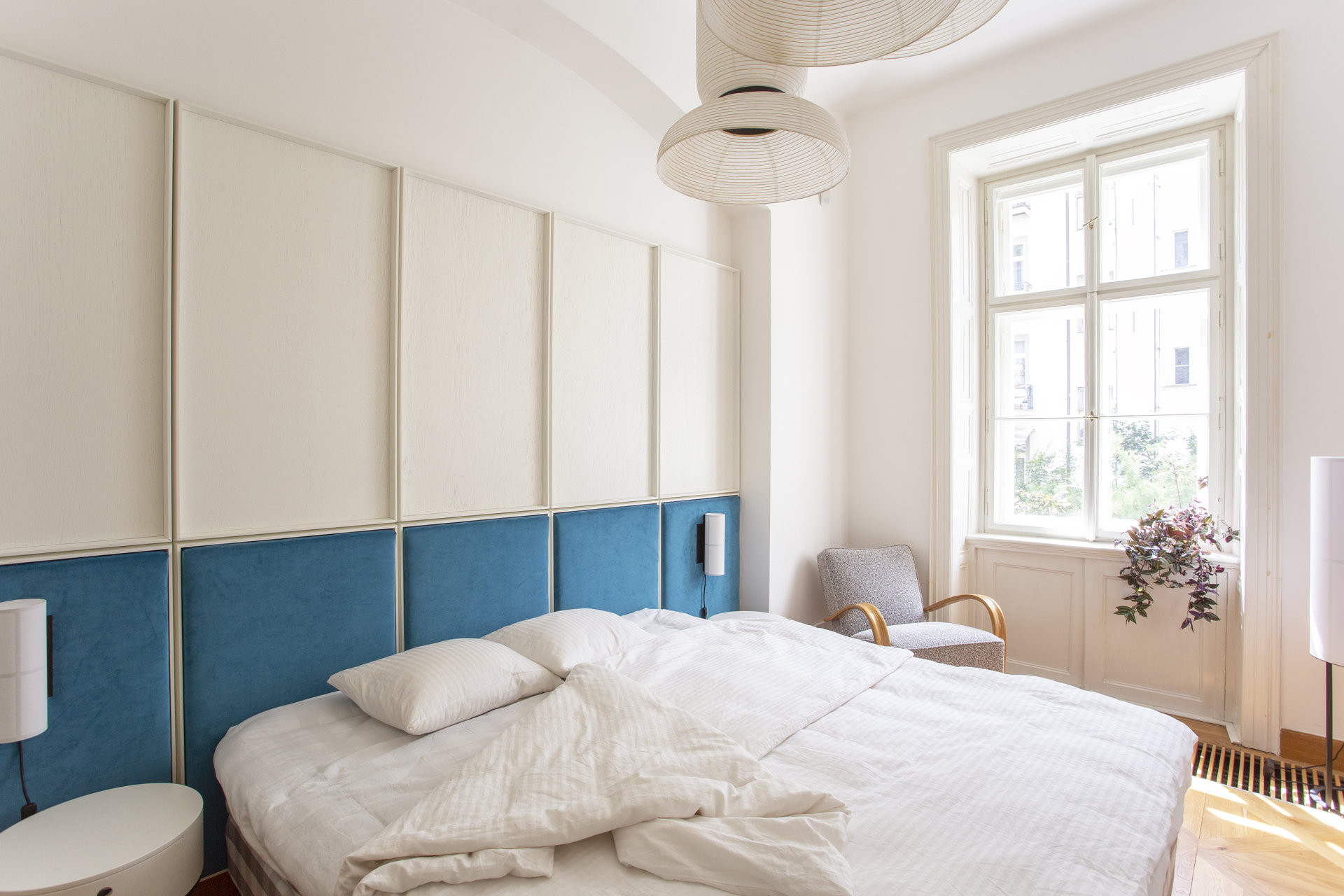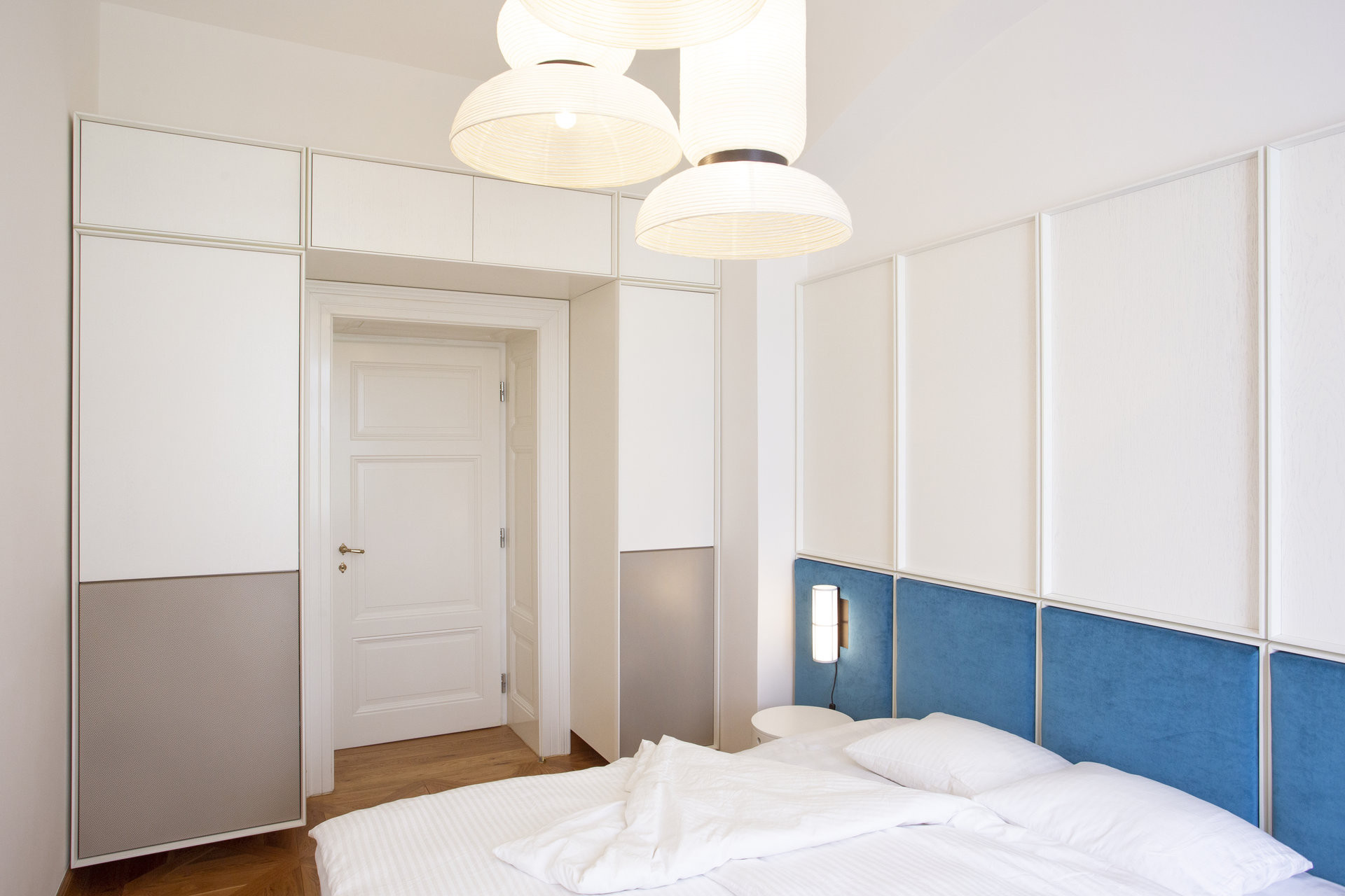 Ve všech místnostech jsou současně efektní zrcadlové klenby – po kazetách další výrazná stopa a důkaz, že je byt v historickém domě. Díky celobílé výmalbě ale nejsou tolik výrazné, architekti na ně upoutali pozornost výraznými závěsnými svítidly, v každé místnosti jinými, ovšem vždy seskupených do klastrů – působí to efektně a současně, ovšem člověku se při pohledu na ně začnou evokovat velkolepé starožitné lustry, jaké tady asi kdysi visely. Staré a nové na sebe v tomto bytě zábavně odkazuje.