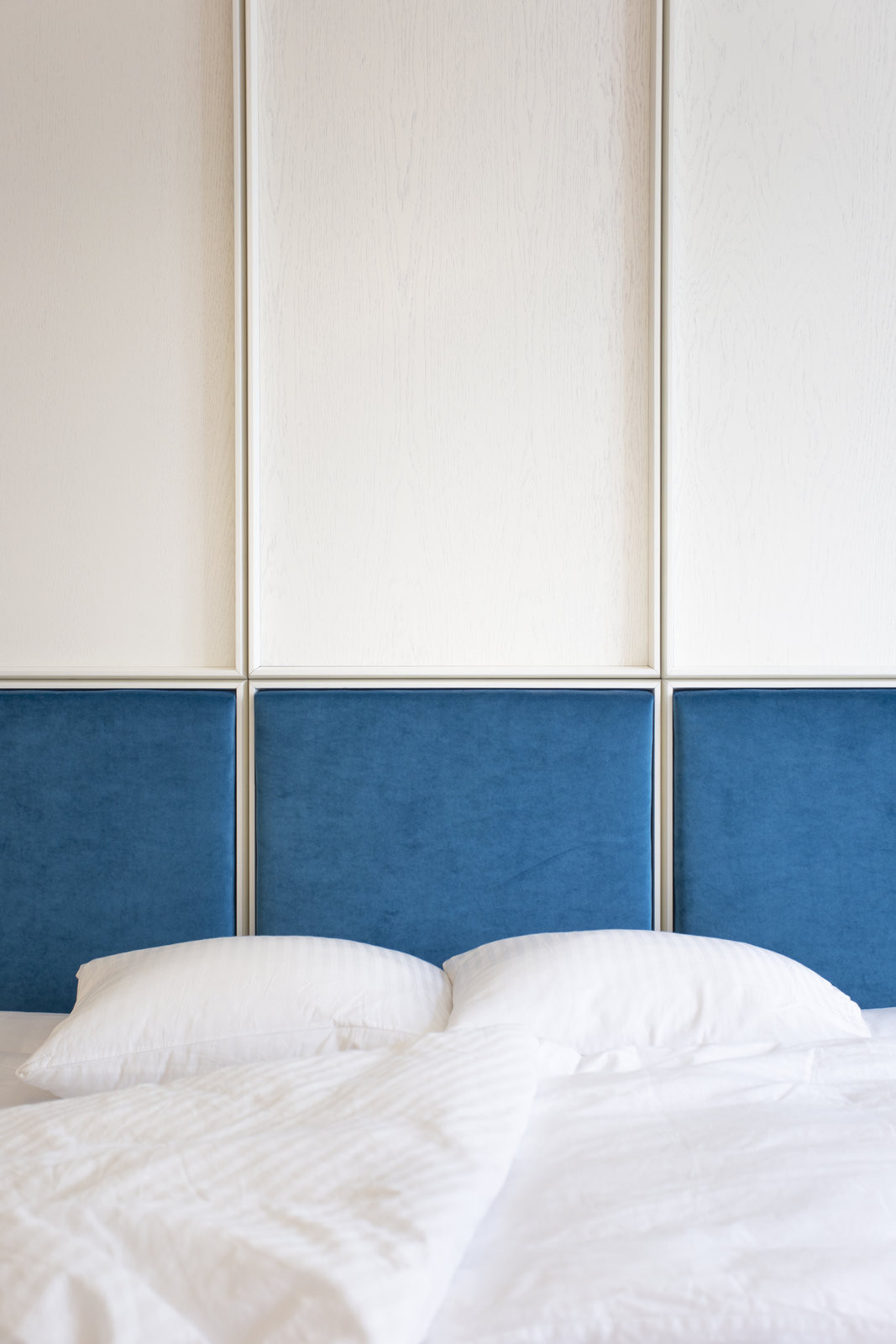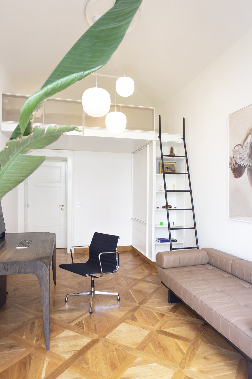 Dále se upravovala ložnice, v té je nejvýraznější polstrované čelo postele čalouněné v azurovém sametu – efektní a zároveň pohodlné řešení, při čtení knížky se člověk opře do měkkého. Z posledního pokoje je pracovna, v té se opět vsadilo především na neutrální barvy. Kromě práce pokoj slouží také k ubytování hostů. Spaní se tady vybudovalo na vloženém patře, pro které bylo pod vysokým stropem dostatek místa, díky bílé barvě prostor vůbec nezahlcuje.