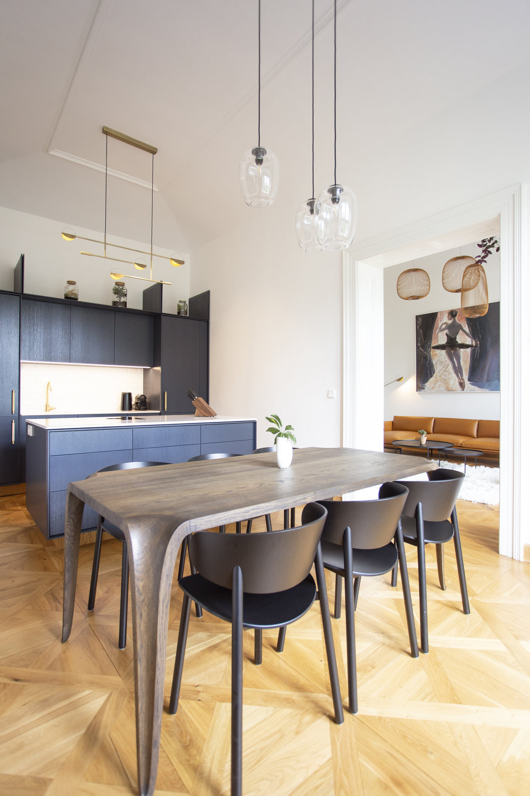 Obývací pokoj je světlý, knihovna v bílo-béžových tónech zabírá celou čelní stěnu. V kuchyni, do které se odtud prochází portálem (s původními kazetami), architekti použili tmavé barvy. Kuchyňská linka s ostrůvkem je tmavě modrá s bílými a zlatými prvky, které se hodí k honosnému stolu na míru.