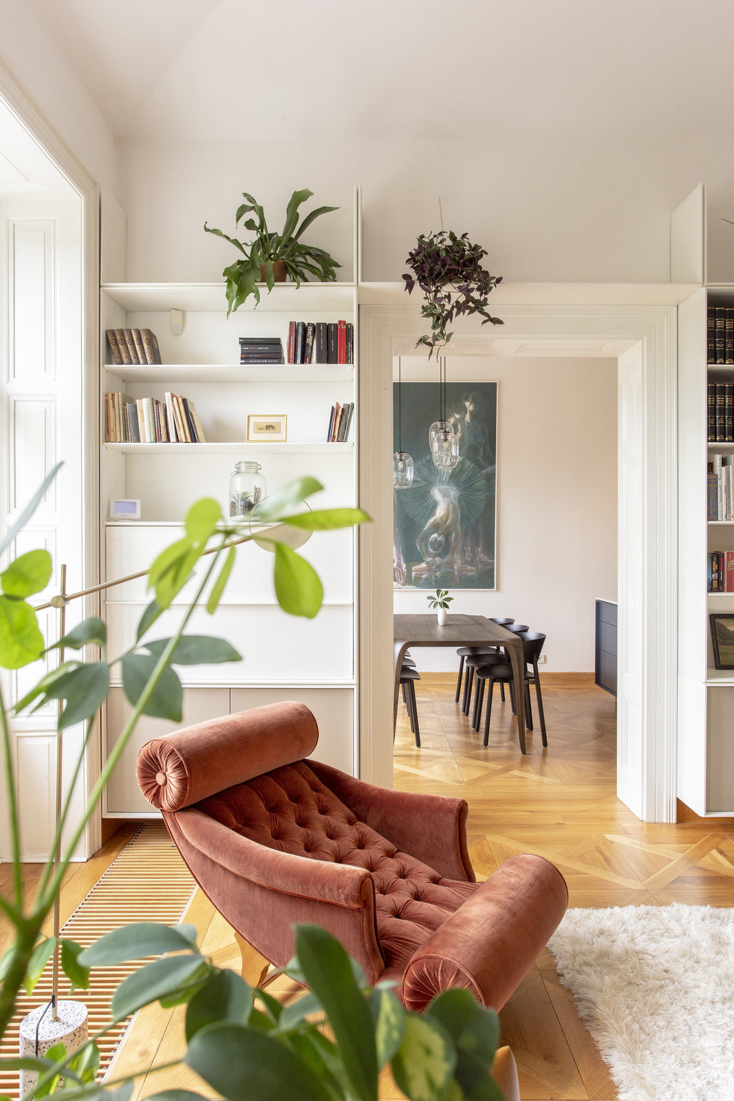 „Hlavní kvalitou bytu jsou jeho velkorysé místnosti s vysokými stropy, výhledy na protější nábřeží s budovou ‚zlaté kapličky‘, orientace ložnic do klidného dvora a historické řemeslné prvky ve formě kazetových ostění dveří a oken,“ popisují klíčové vlastnosti bytu architekti z ateliéru DDAANN. Rekonstruovali ho v jednom z činžovních domů z 19. století na Janáčkově nábřeží. Právě historické prvky se pro návrh interiéru staly výchozí inspirací.