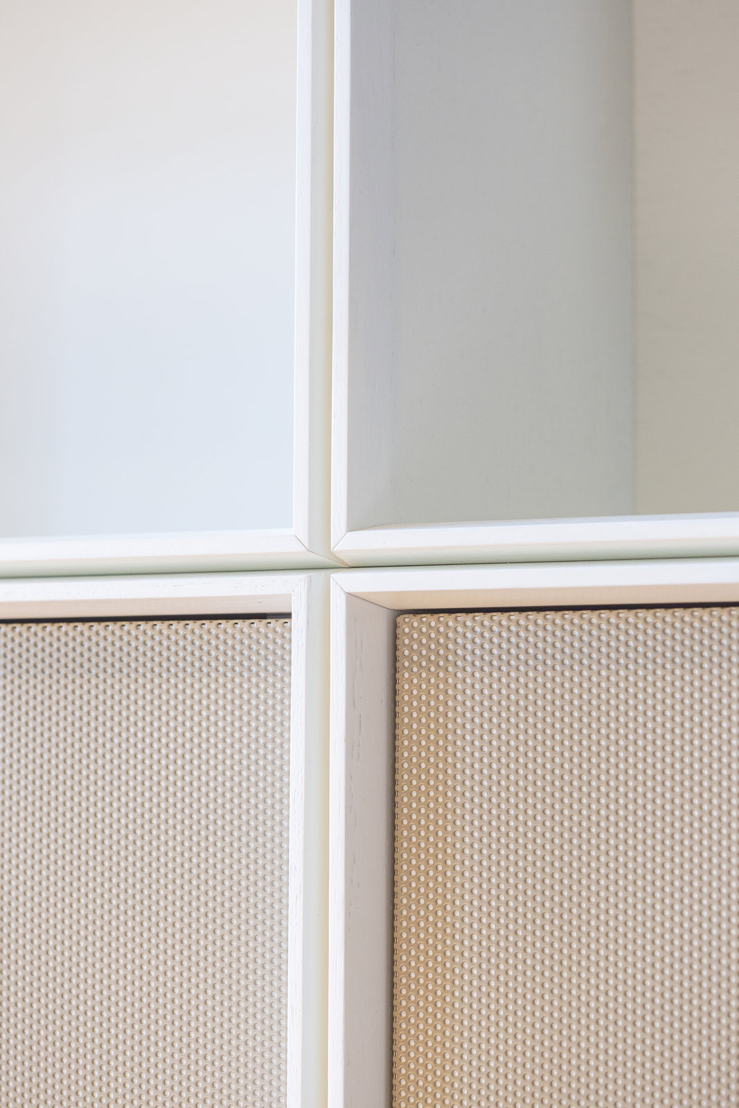 Nejvíce architekty oslovily dochované kazety na ostění dveří a oken, jejich principy pak vtiskli i do nového vestavěného vybavení napříč bytem. Jemně profilované fazety na něm vymezují pole, která se materiálově mění. Pracovalo se s dýhou, perforovaným plechem, umělým kamenem, sametem – ovšem nikdy ne najednou, pro každou místnost se zvolila vlastní kombinace.
