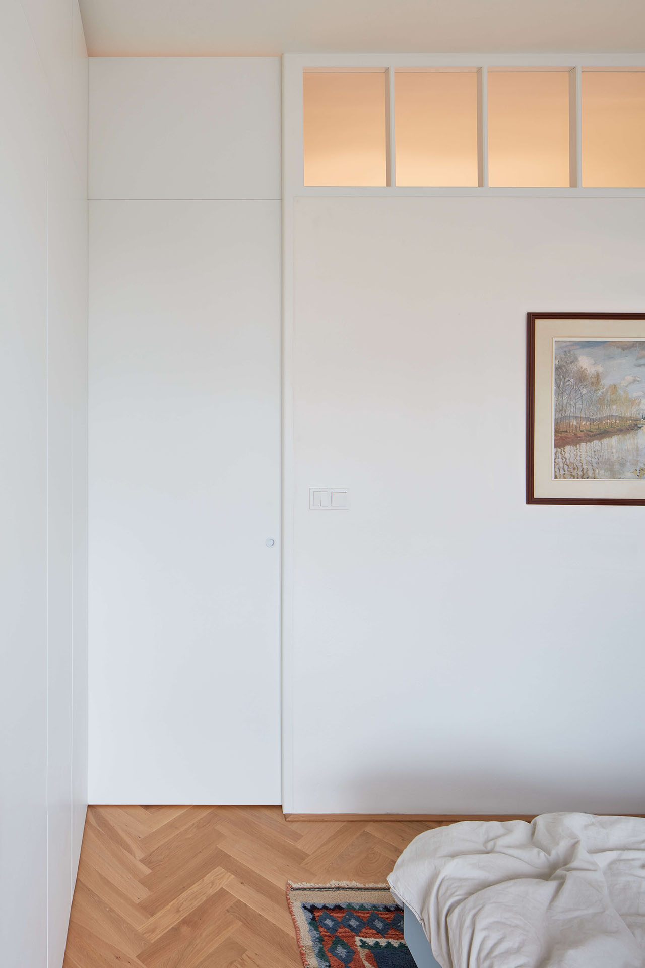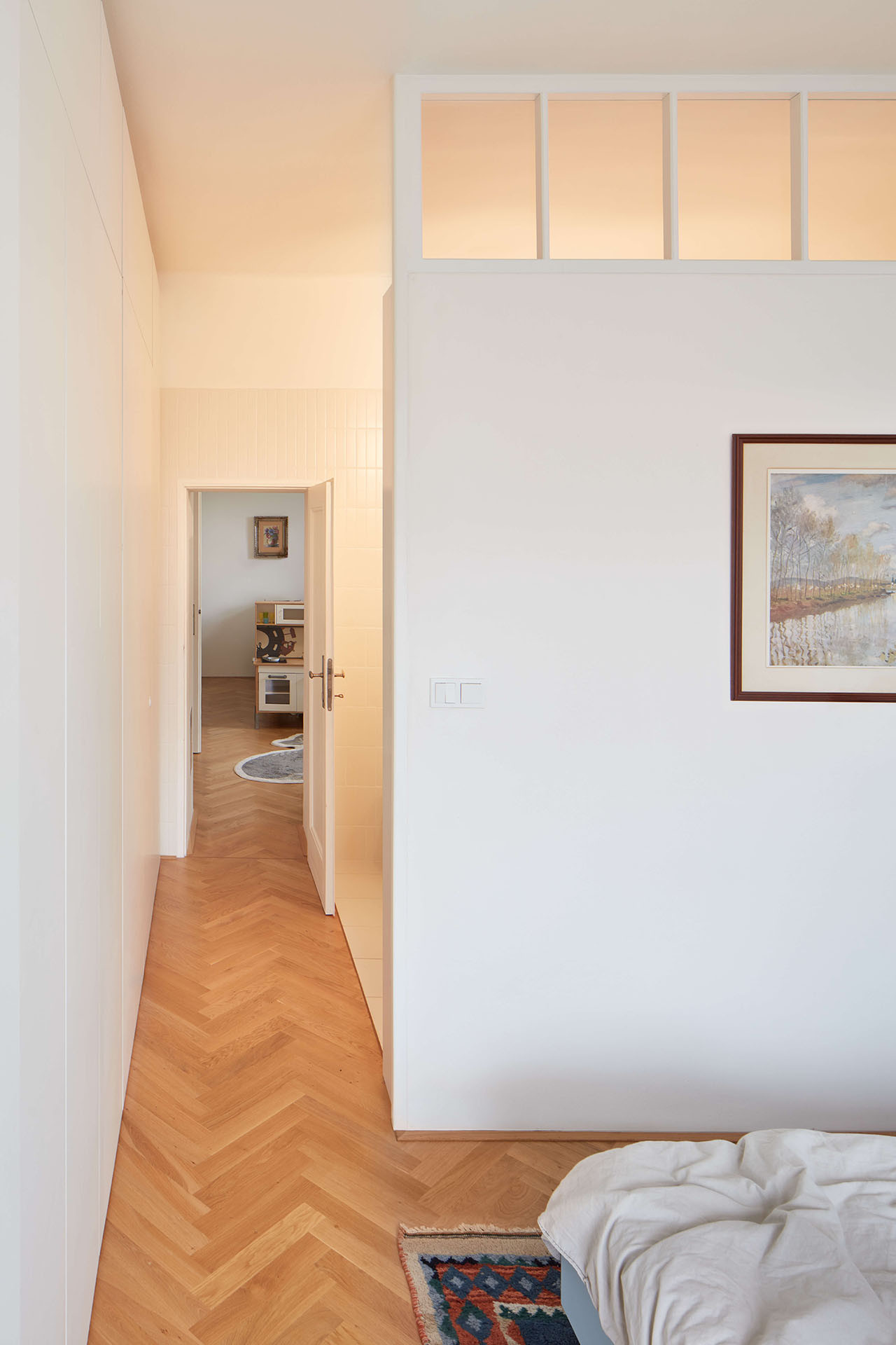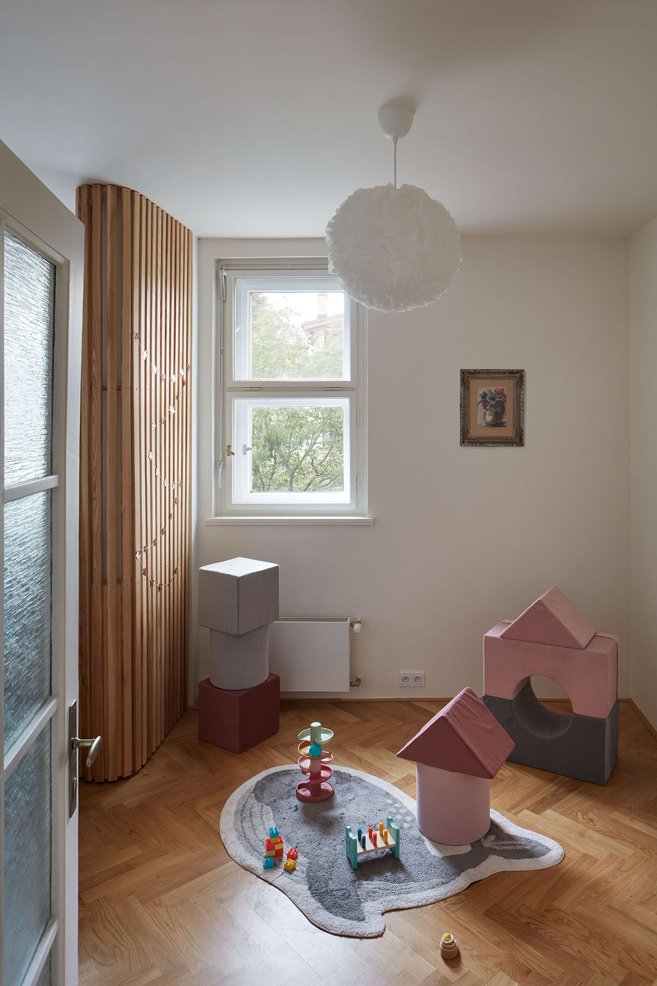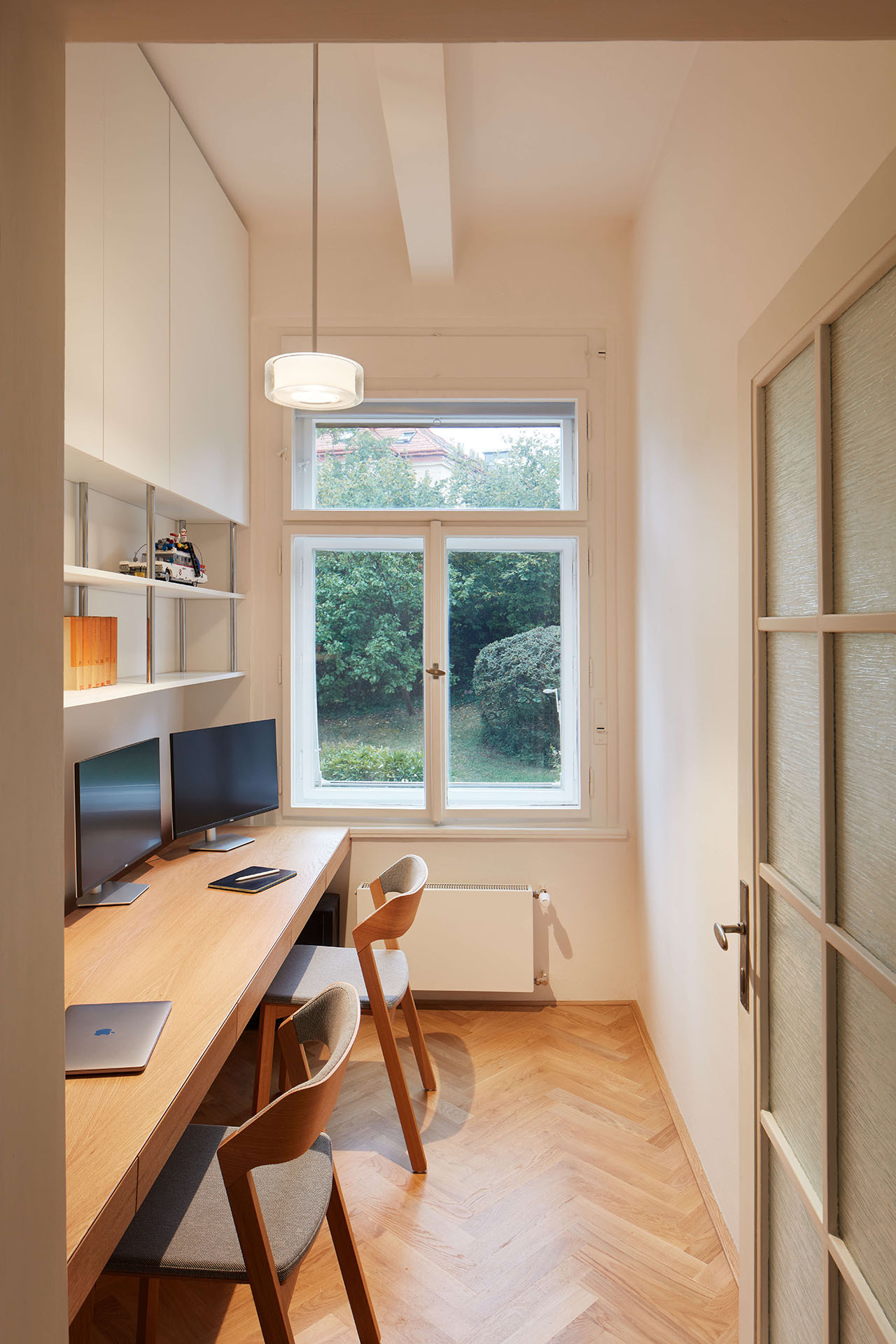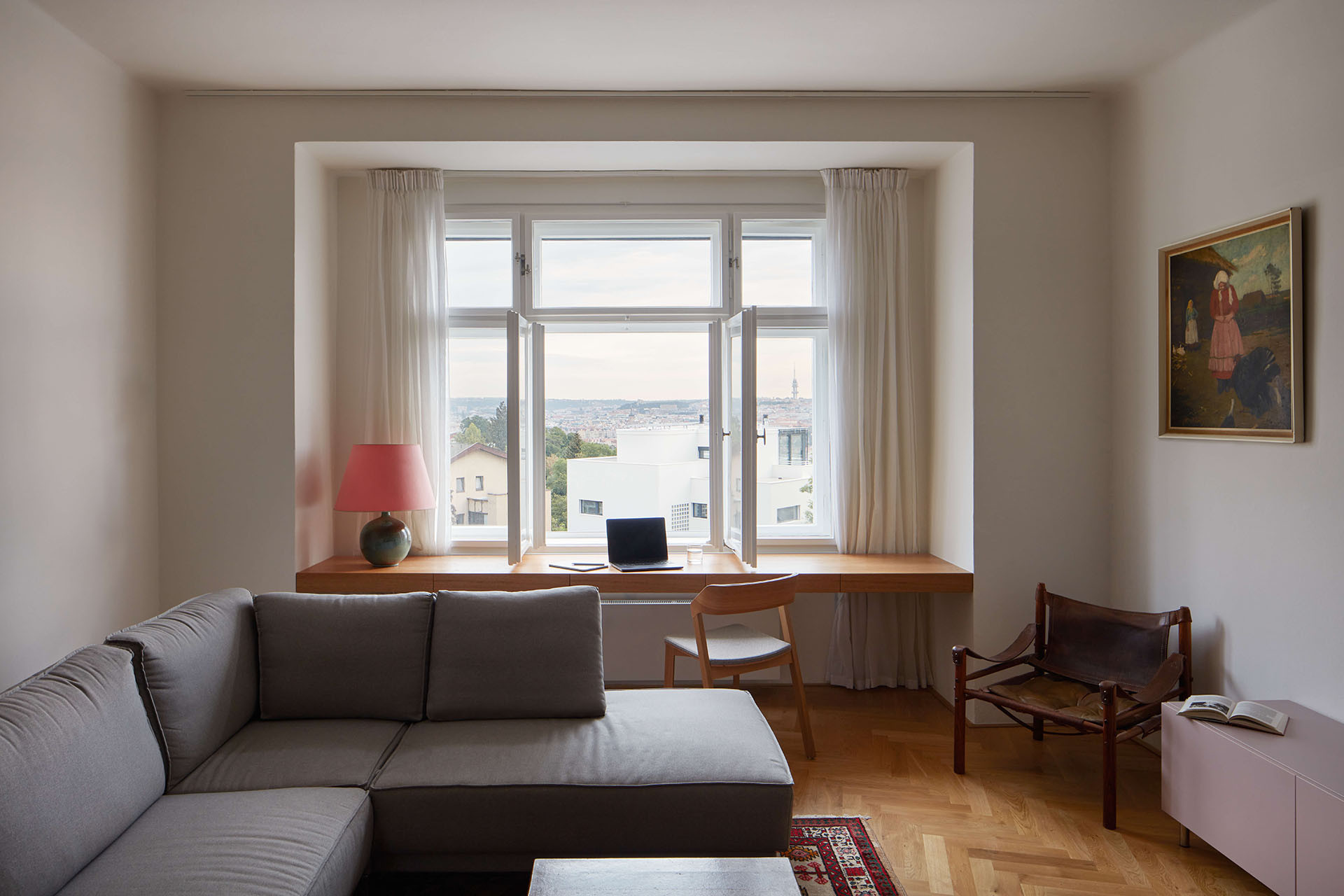 A originálně se pracovalo také s hlubokými nikami okolo oken. Do té v obývacím pokoji je zapasovaný pracovní stůl, z něhož je okouzlující výhled na Prahu. Do více jak stometrového bytu se kromě dvou koupelen vešla ještě jedna menší pracovna a pokoj pro malé děti – teď prakticky přístupný z ložnice jedněmi z původních dveří. Až odrostou, dá se do něj chodit také z chodby.