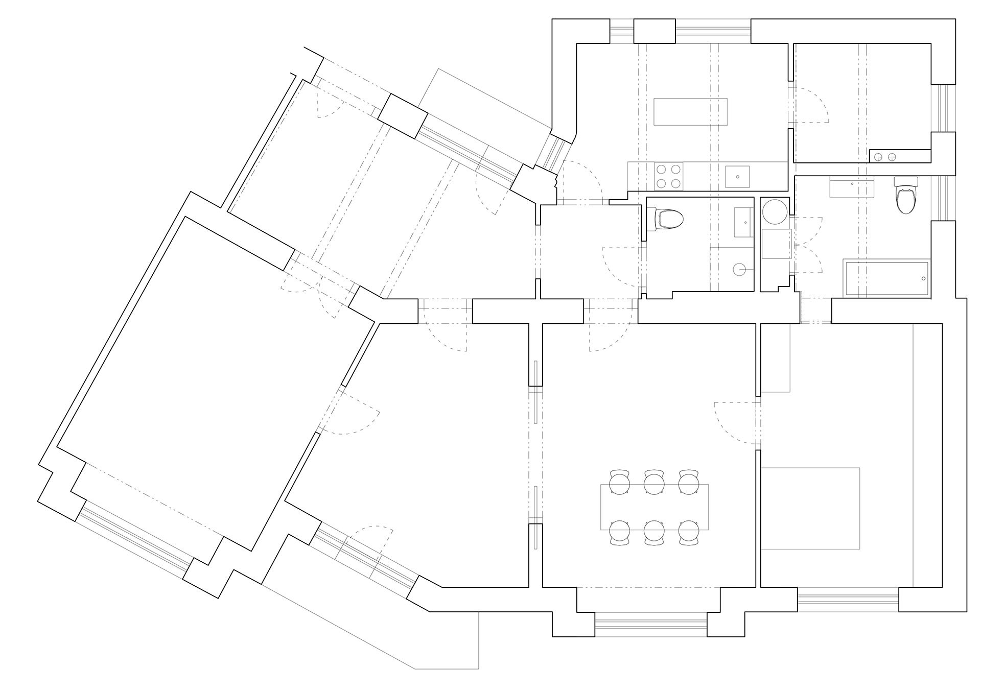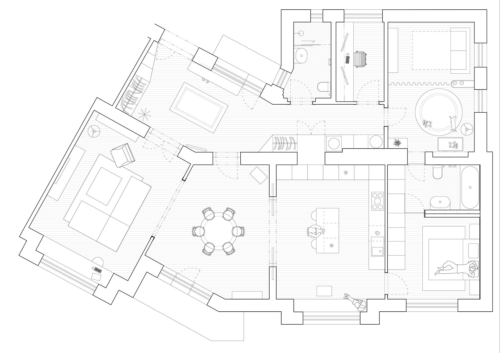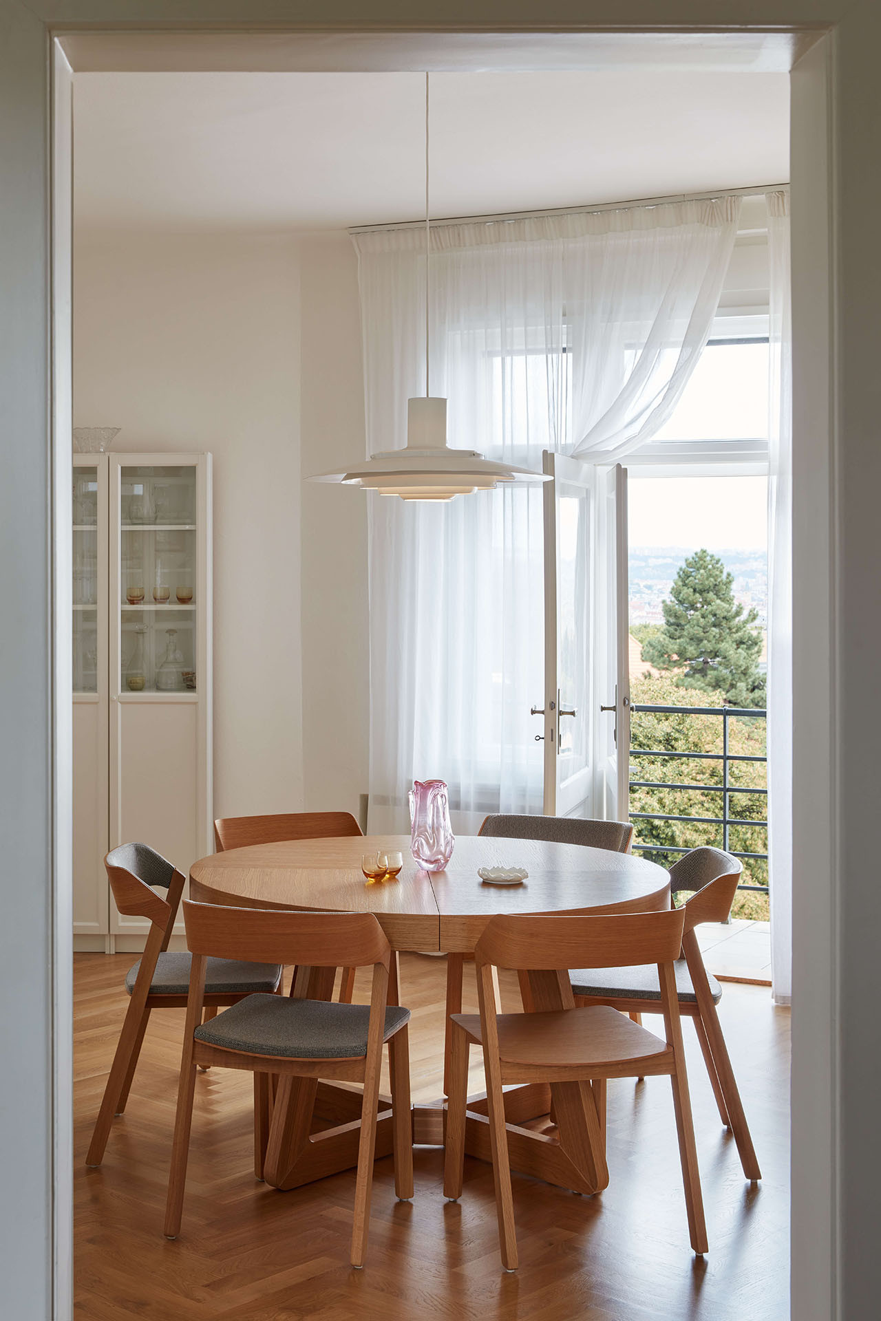 „Hlavní předností bytu jsou čtyři na sebe navazující místnosti, které ze smíchovského svahu vyhlíží až na Národní divadlo,“ popisuje dispozici bytu po rekonstrukci architektka. Jedná se konkrétně o obývací pokoj, jídelnu, kuchyni a nakonec ložnici. Všechny tyto místnosti mohou být propojené, ale také se od sebe izolovat. Mezi kuchyní a jídelnou jsou zmiňované původní posuvné dveře. A ložnice se dá zavřít samozřejmě také.