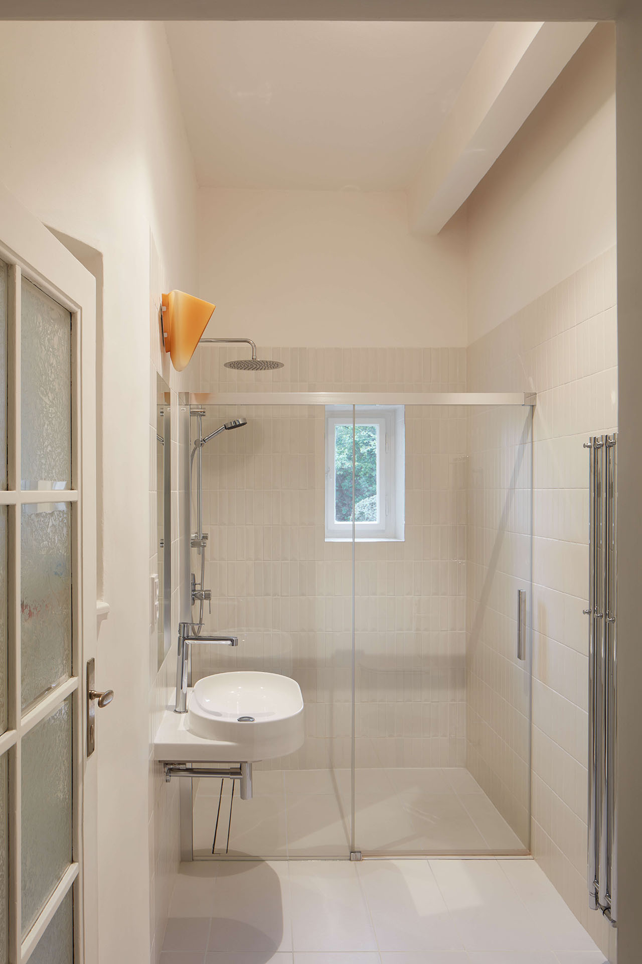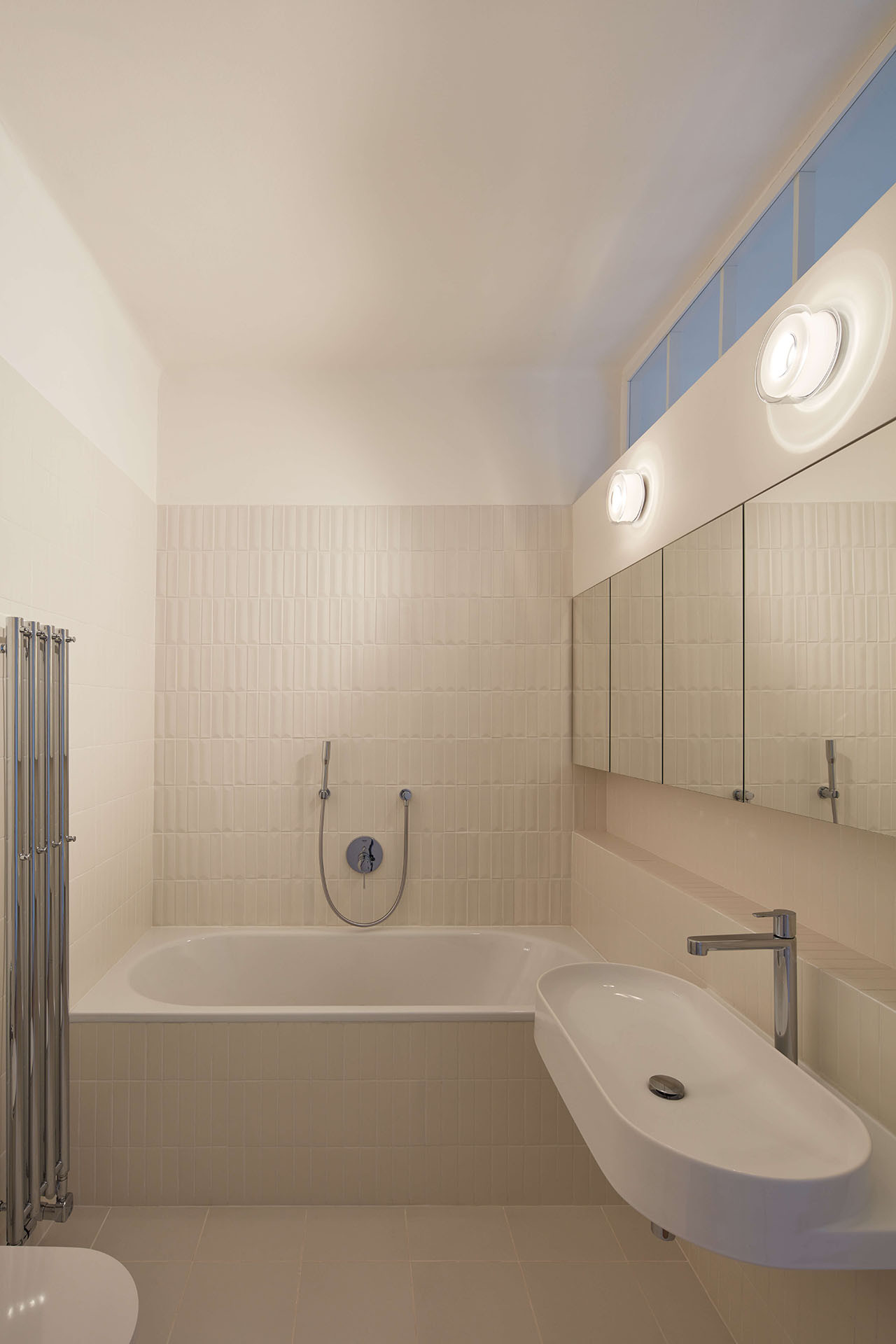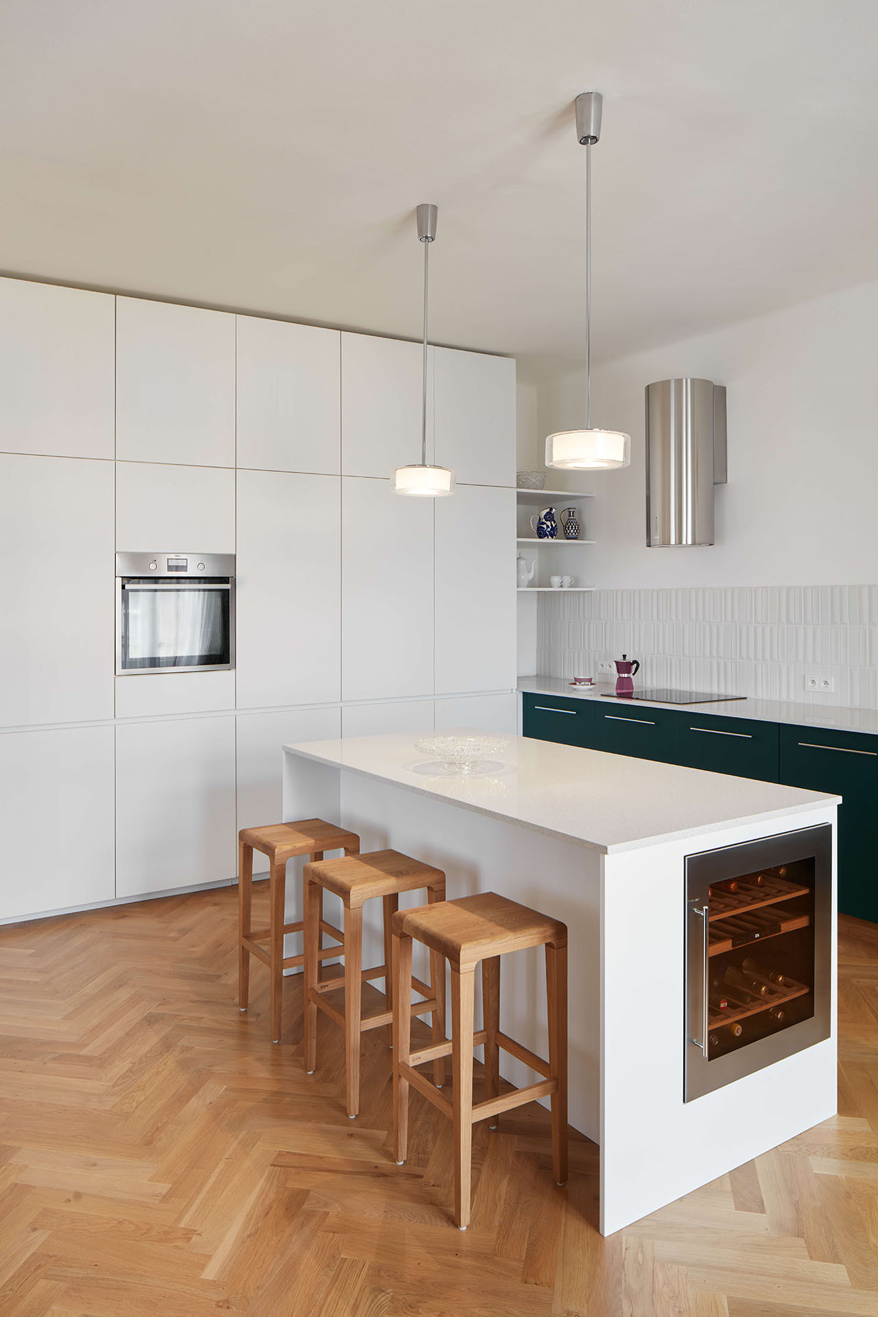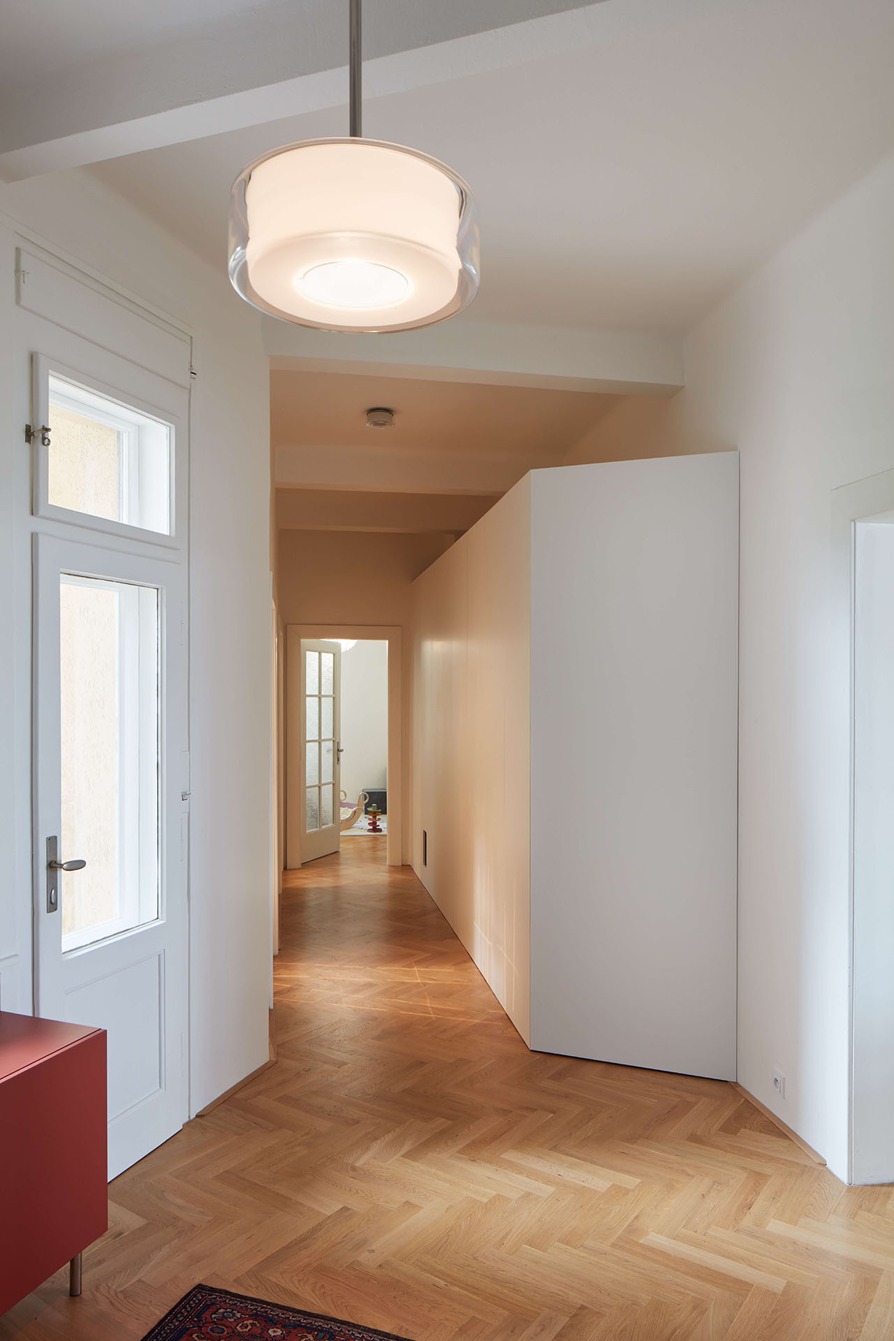 Stejné se dostalo ještě do vstupní haly nebo do koupelny. Společně s dalšími solitérními kusy nábytku (novými i starými) do jinak světle laděného bytu přinášejí barvy. V nenápadné bílé se řešily také hlavní úložné prostory. Ve vstupní hale architektka navrhla velkou skříň, která se do půlky zalamuje, aby se daly pohodlně otevřít vstupní dveře. Druhá podobná stojí dál v chodbě, a kromě úložných prostor v sobě schovává také pračku, sušičku a komoru, která šikovně využívá hloubku při rekonstrukci zrušených dveří.