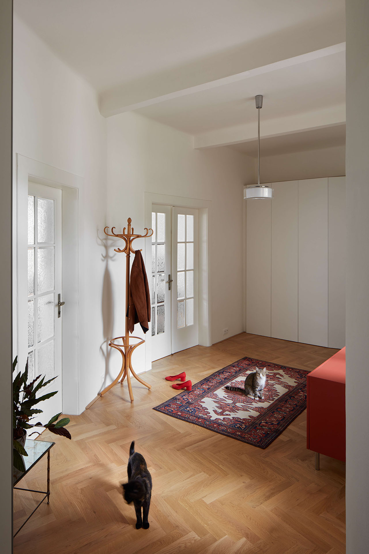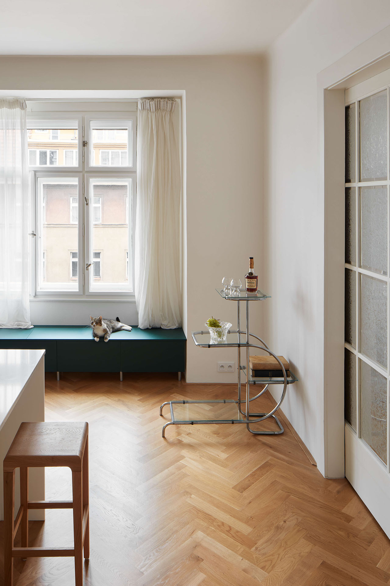 „Byt se dá oběhnout kolem dokola, všichni jsou tak ještě více pospolu,“ shrnuje popis dispozice Kateřina Hroudová. Výsledkem rekonstrukce se stal příjemně světlý a prostupný byt, který pamatuje na historii svého domu a rodiny, ovšem nenásilně a současně. Je to přátelská kombinace.