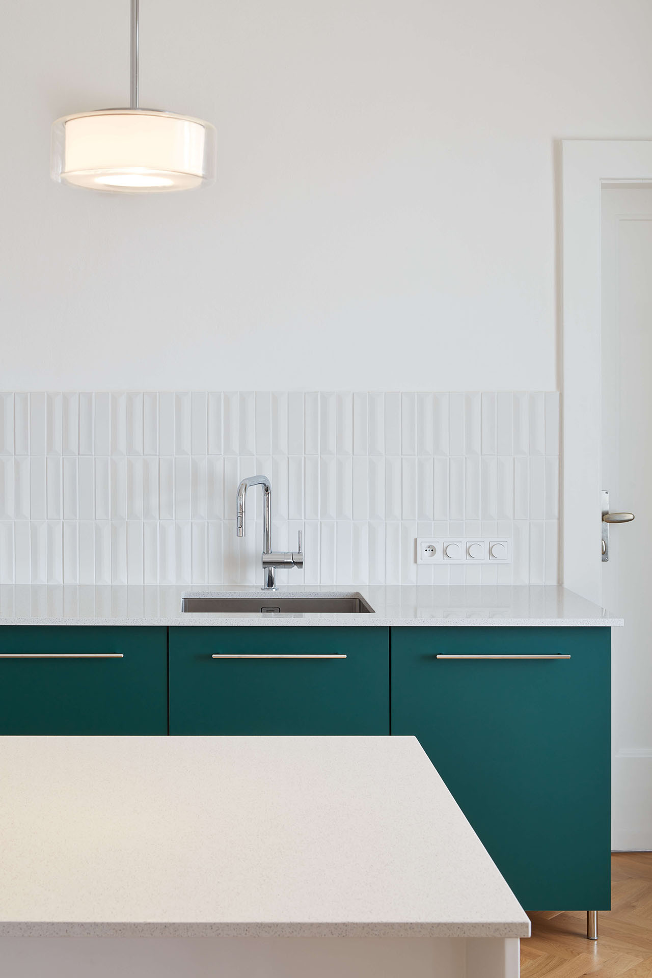 Původní dispozice byla také průchozí, ovšem poněkud neprakticky. Do jednotlivých pokojů se vcházelo dveřmi umístěnými doprostřed příček, což třeba konkrétně pro ložnici znamenalo, že se do ní vstupovalo středem jídelny. Nyní jsou dveře šikovně odsunuté na stranu vedle zeleno-modré kuchyňské linky, nad kterou je pověšené jedno ze zděděných svítidel.