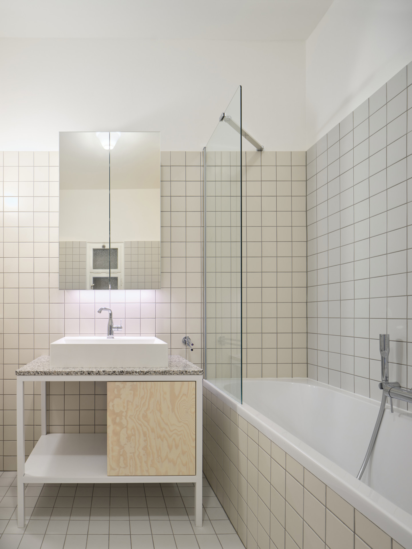 Hlavní zásah do dispozice bylo spojení místností. „Odstraněním příčky mezi dvěma původními pokoji vznikl velkorysý pobytový prostor, který naplno využívá výhledu z předposledního patra domu. Do tohoto centrálního prostoru byla přesunuta i kuchyňská linka, která byla původně umístěna spolu s pokojem pro služku v oddělené zadní části bytu,“ popisuje architekt Prokop Hartl.