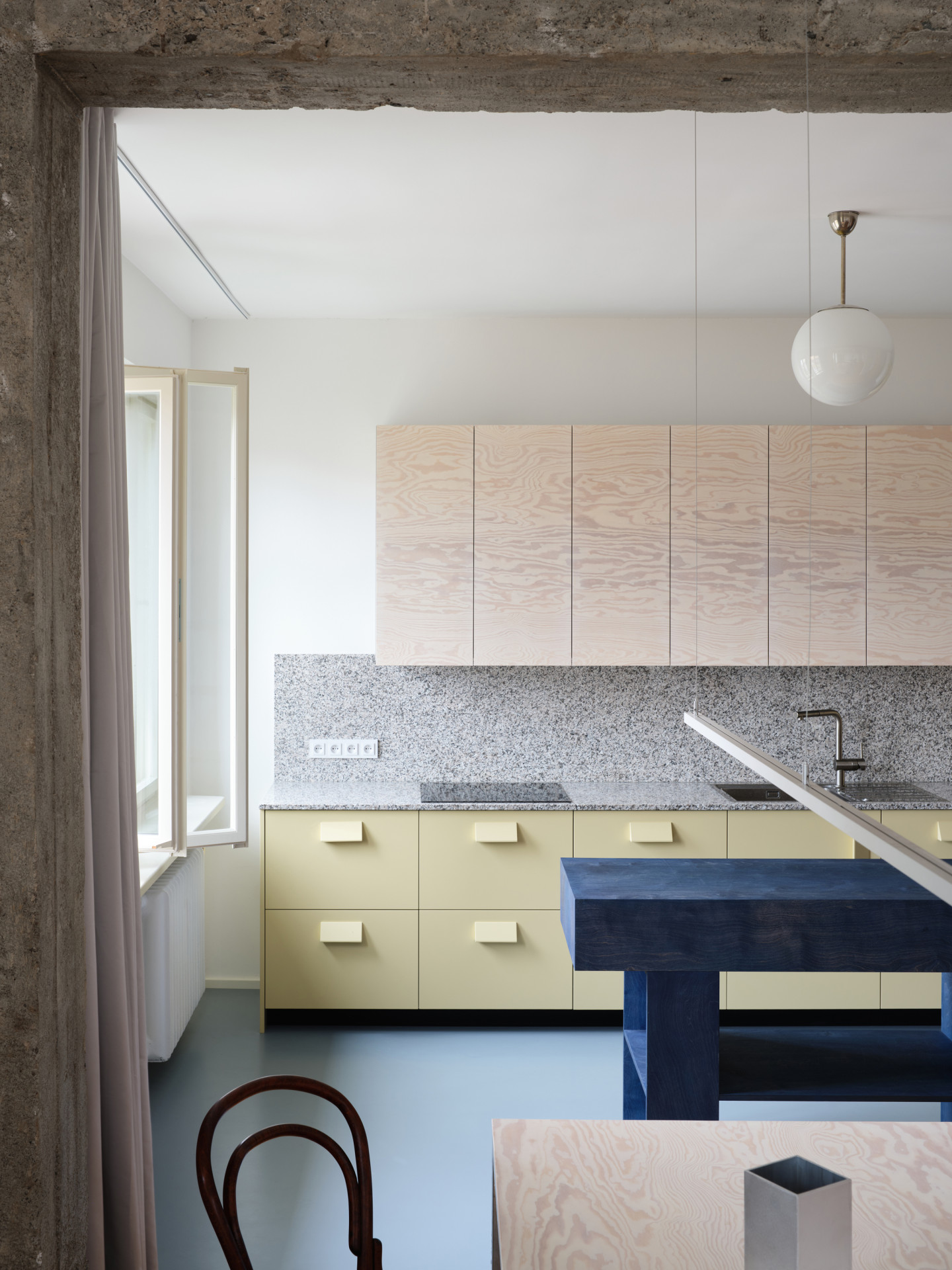 Velkou předností bytu je originální setkání barev, textur a materiálů. V kuchyni a na kuchyňském stole vidíme světle mořenou borovou překližku, na dveřích skříní elegantní dubovou dýhu. V kuchyni a koupelně se objevuje žula, na podlaze jsou původní parkety, které se nenuceně navazují na šedý polyuretan. Vše se kombinuje do pestrého, ale harmonického patchworku.