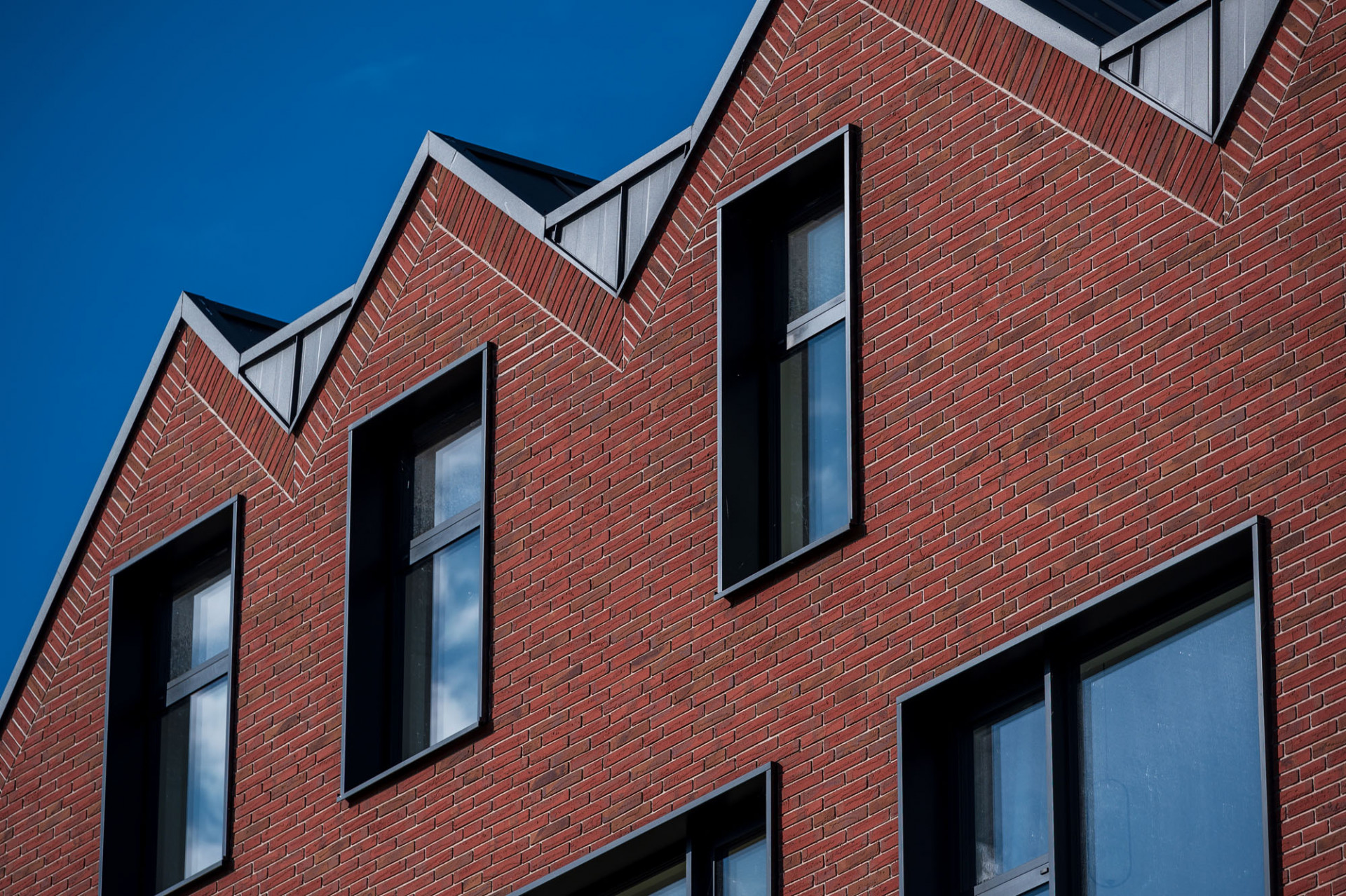 Plášť domu navrhli architekti z lícových cihel – tradičního místního materiálu. Rytmus fasády určuje kompozice okenních výplní v hliníkových rámech Aluprof ve dvou základních formátech. Nepravidelným střídáním dvou rozměrů oken spolu s opakováním štítů získává fasáda decentní hravost, na svých delších stranách zároveň nesklouzává k fádnosti. Otvory pro jednotlivé okenní výplně zvýrazňuje černé oplechování ostění přesahující líc fasády. Spolu s tmavě šedou střešní krytinou tak tvoří zajímavý kontrast k cihlově červeným fasádám.