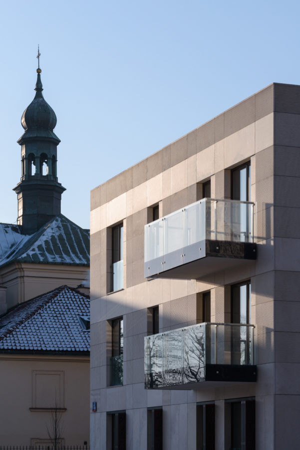 Fasádu budov A a B proto pokrývá obklad z béžového vápence, nižší část domů pak tvoří klasická omítka. Budova C získala "smíšenou" povrchovou úpravu - omítku zde totiž doplňuje obložení z měděných plechů. Měď architekti použili i na budovách A a B, kde tvoří perforované exteriérové žaluzie pro velkorysá francouzská okna. Žaluzie tak nemají pouze funkci určitých "slunečníků", ale zároveň pomáhají jako akustický izolant.