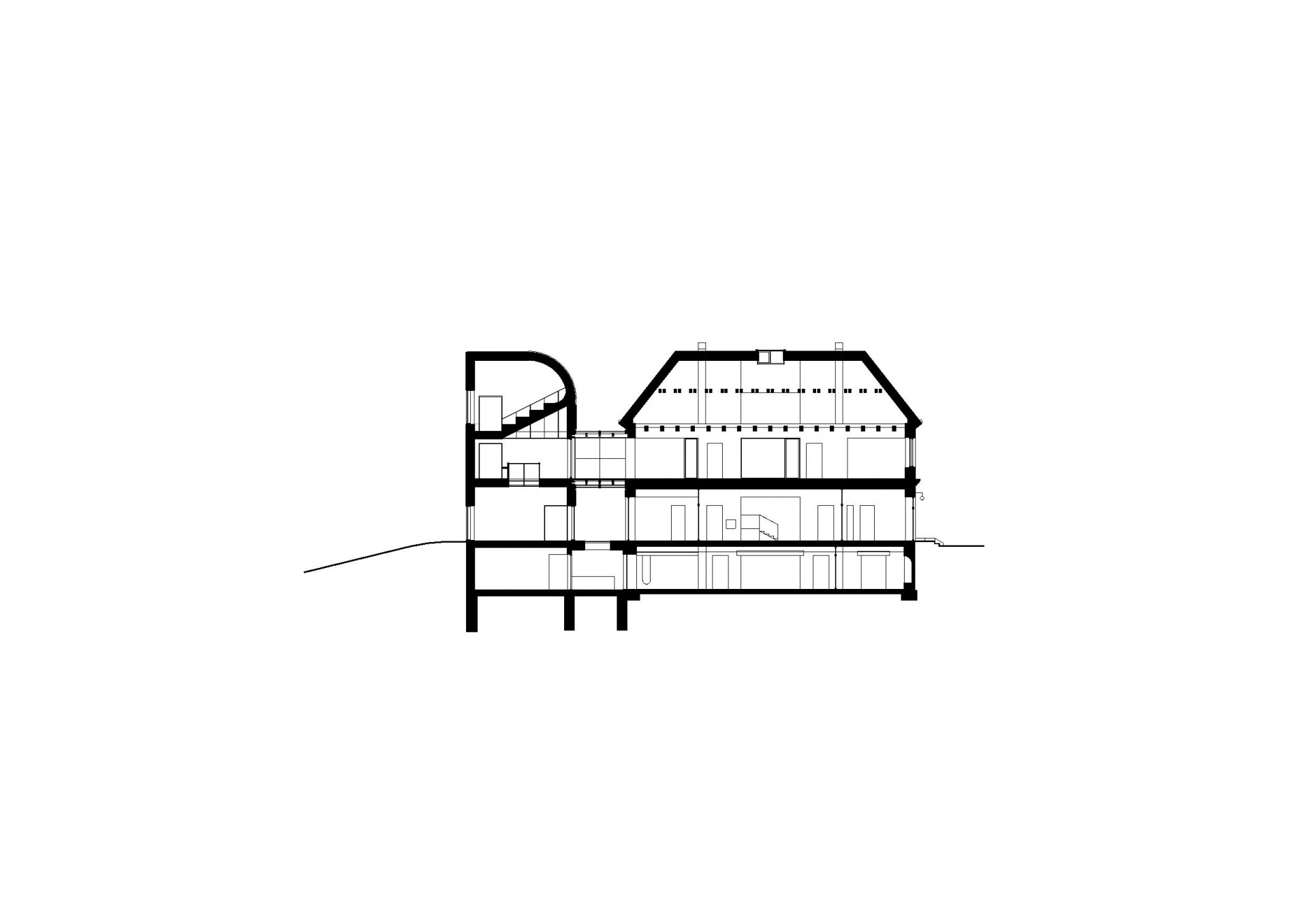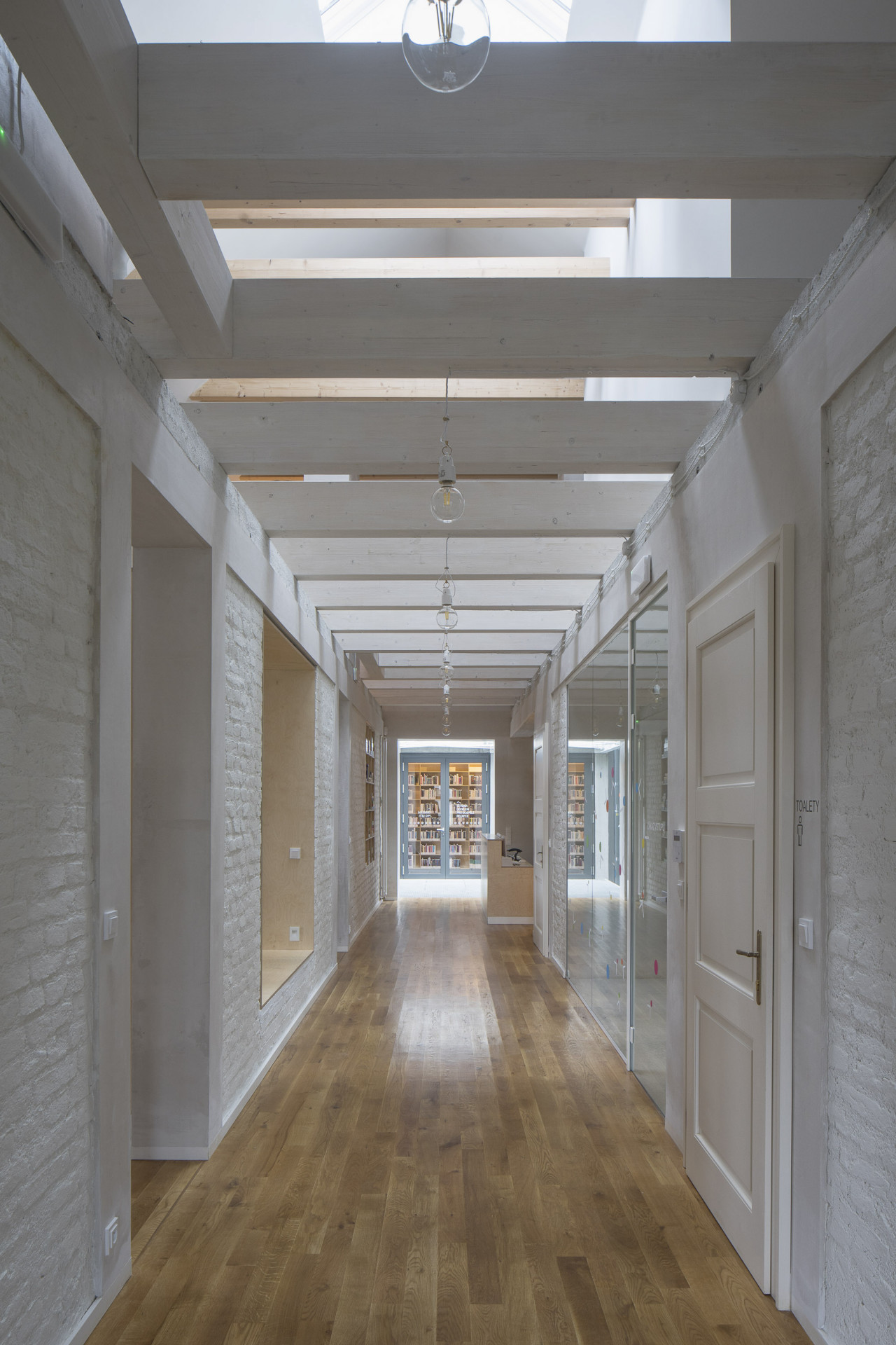 Objekty jsou vzájemně propojeny na několika úrovních – v suterénu a také v patře krytým proskleným mostkem. V původní stavbě našly své místo převážně prostory věnované spolkovým činnostem. V patře se nachází dětské oddělení knihovny, které se otevírá až do krovu mansardové střechy. Součástí je ale i mateřské centrum, které je naopak situované do původního suterénu. „Po vybetonování nových stropů a vyskládání kleneb daly hluboké základy stavby vzniknout dalšímu využitelnému patru. Odtěžením terénu z jižní strany se k němu dostalo denní světlo a z vyhloubené jámy vznikl základ nového náměstíčka,“ popisují Jiří Janďourek a Ondřej Novák.