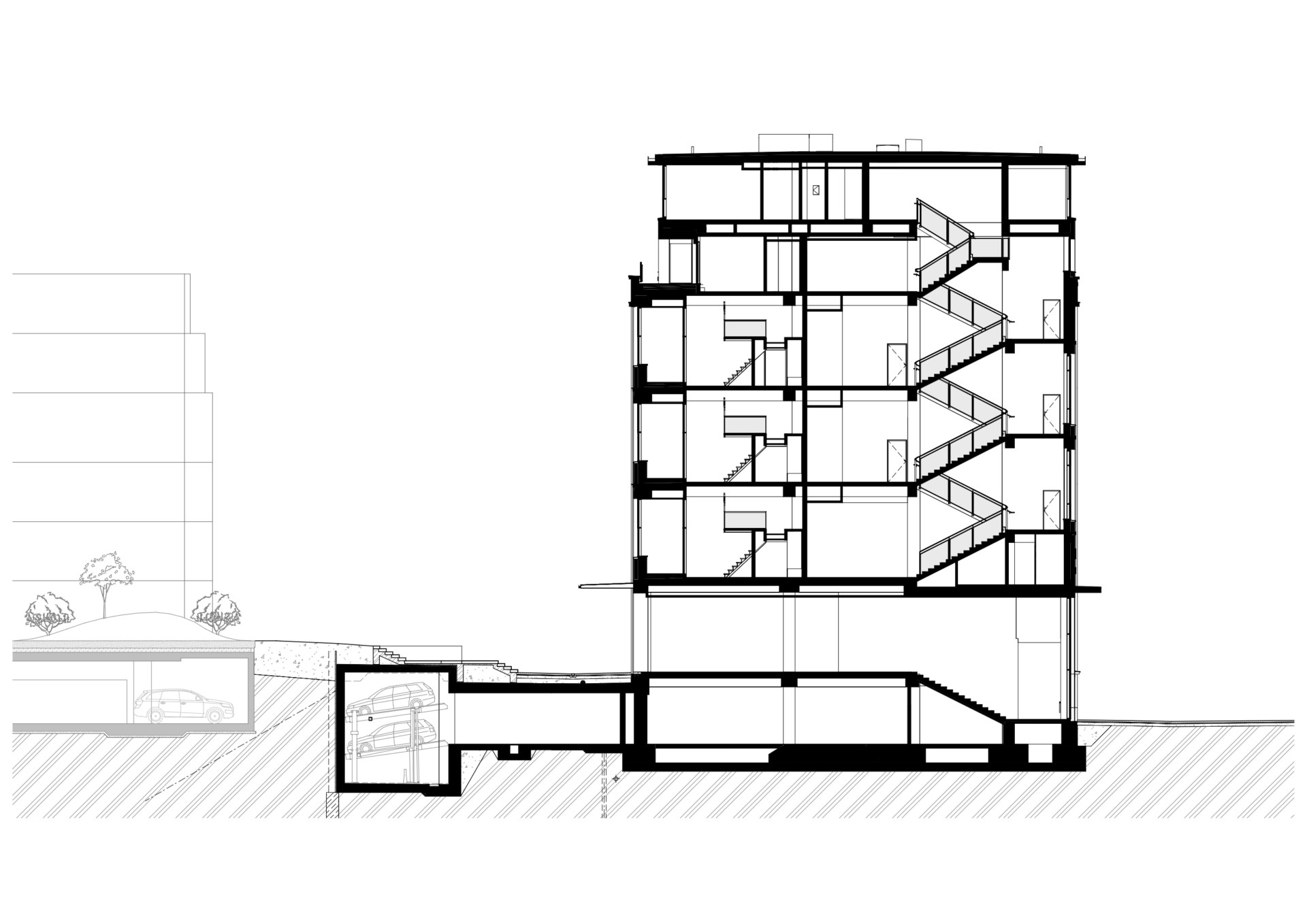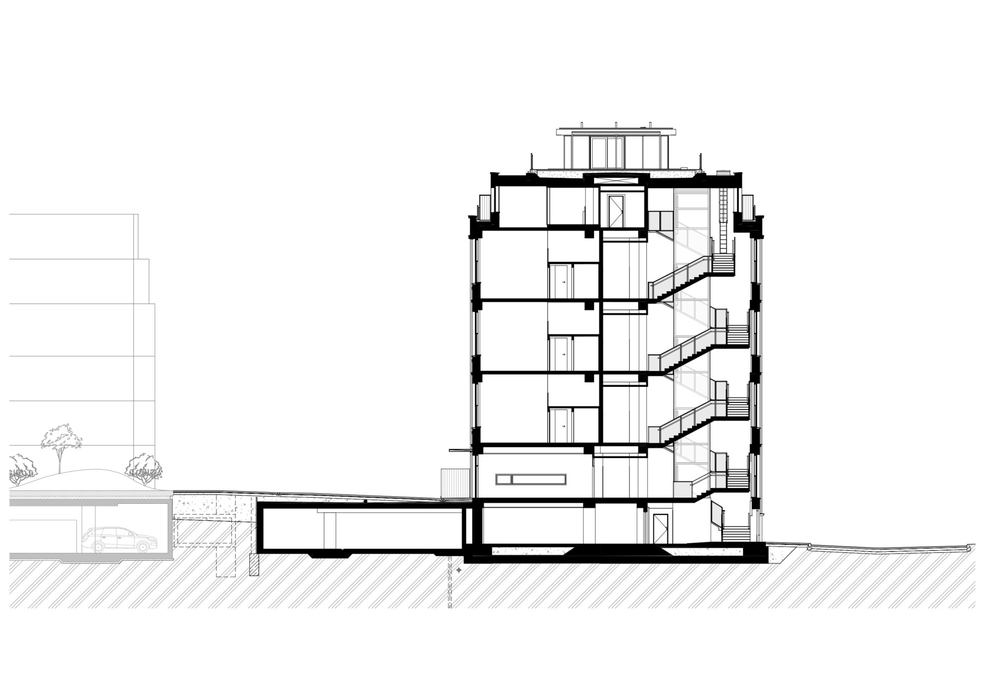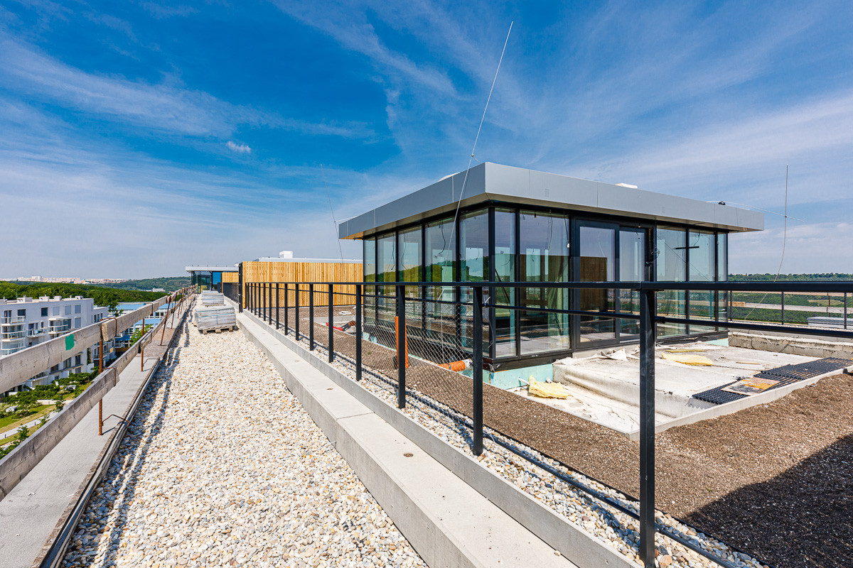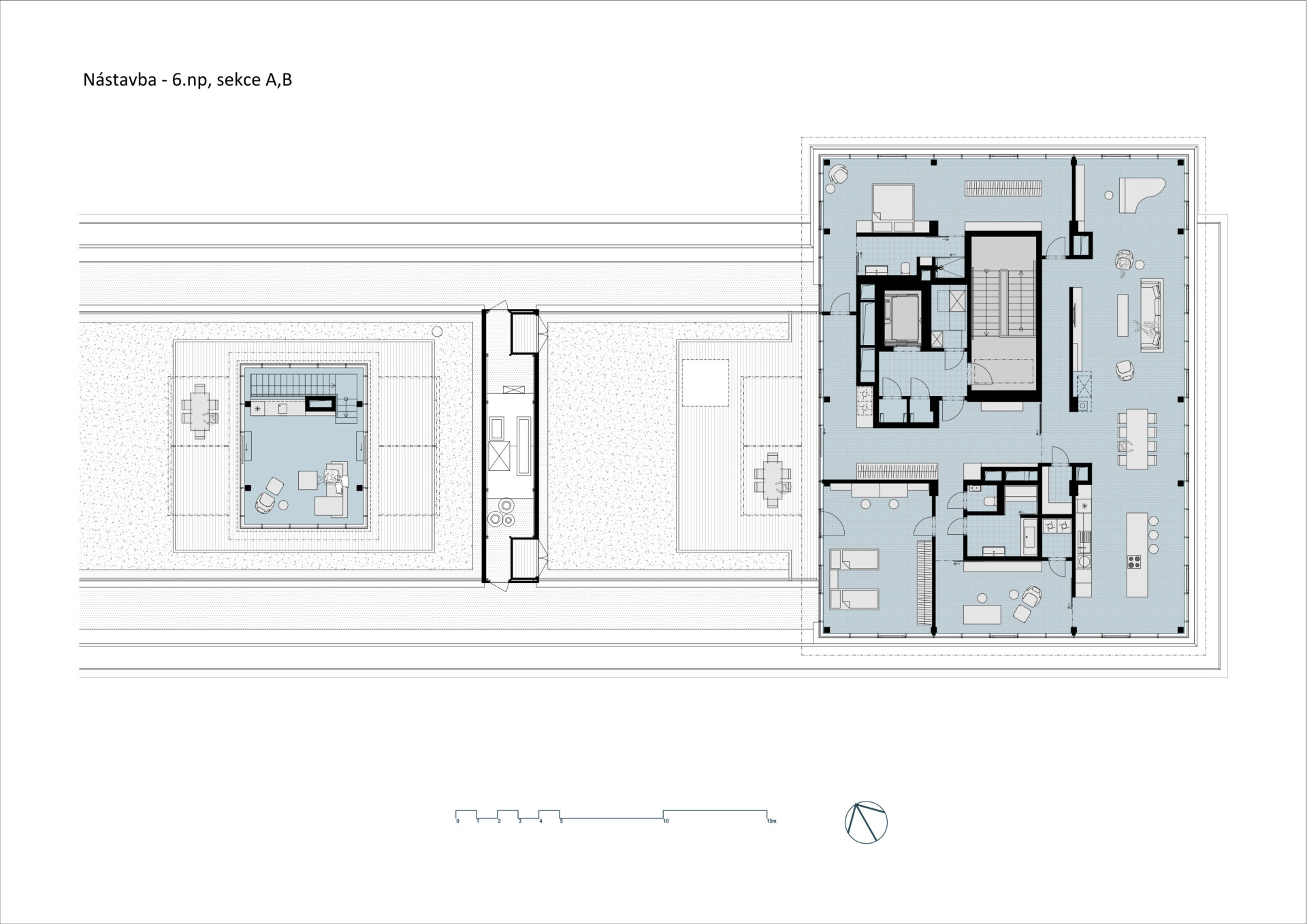 „Na šestém nadzemní podlaží jsou realizovány tři nástavby tak, aby jejich hmoty působily co nejvíce odlehčeně a pojmuly jednu až dvě bytové jednotky. Dále se v šestém podlaží nacházejí takzvané skyboxy, jedná se objekty umožňující vstup z bytů v pátém podlaží na střešní zahradu,“ vysvětlují architekti.