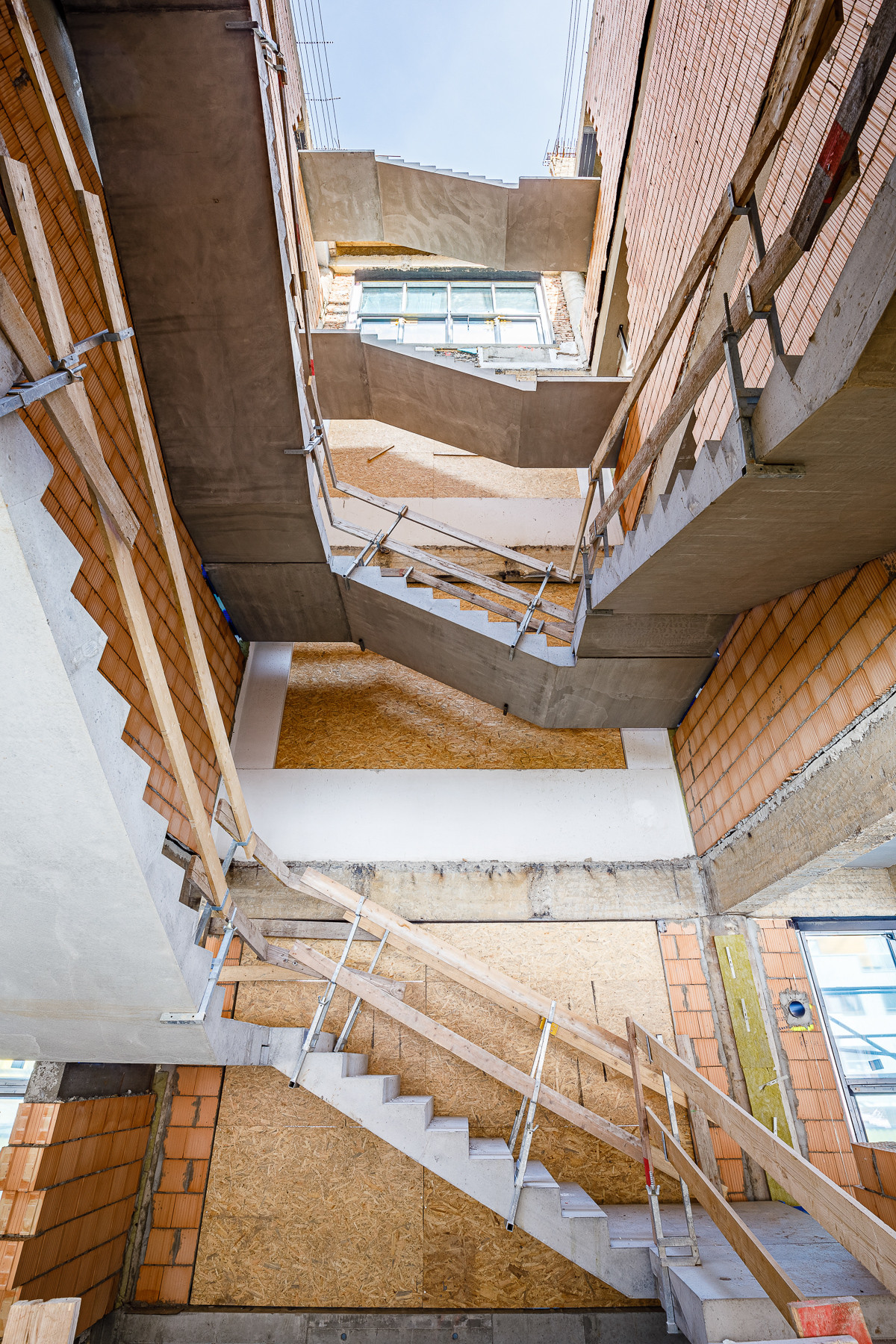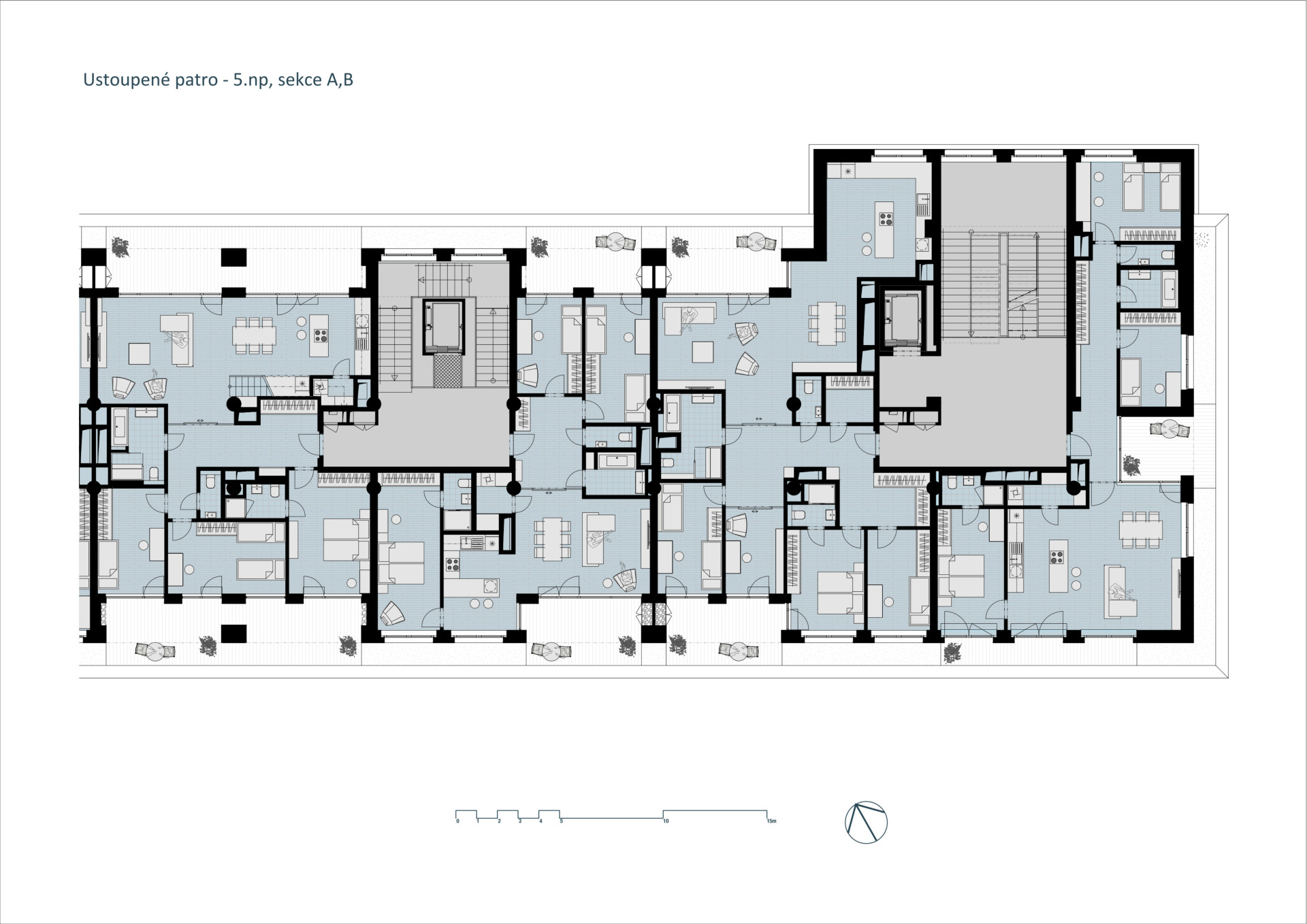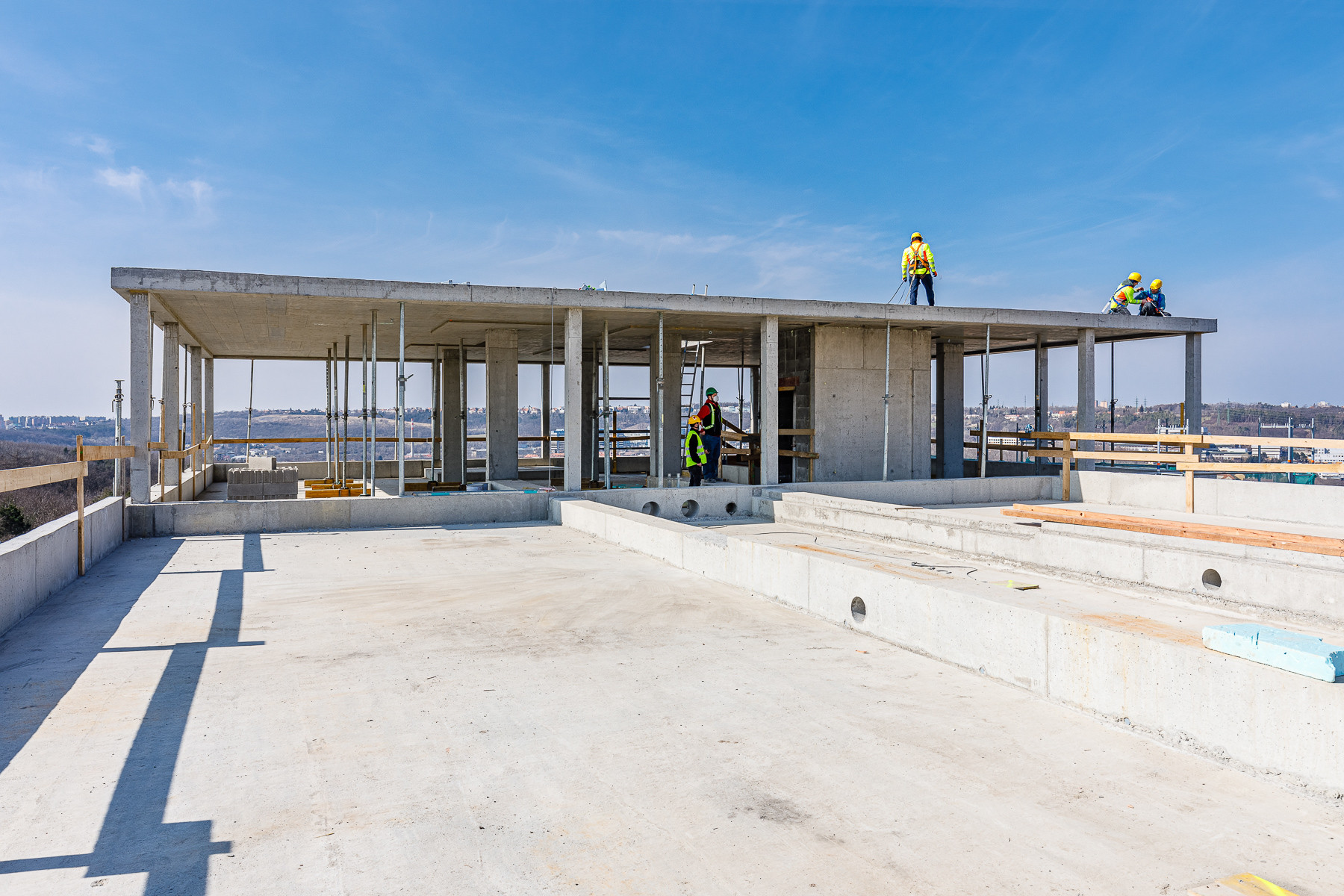 „Na šestém nadzemní podlaží jsou realizovány tři nástavby tak, aby jejich hmoty působily co nejvíce odlehčeně a pojmuly jednu až dvě bytové jednotky. Dále se v šestém podlaží nacházejí takzvané skyboxy, jedná se objekty umožňující vstup z bytů v pátém podlaží na střešní zahradu,“ vysvětlují architekti.