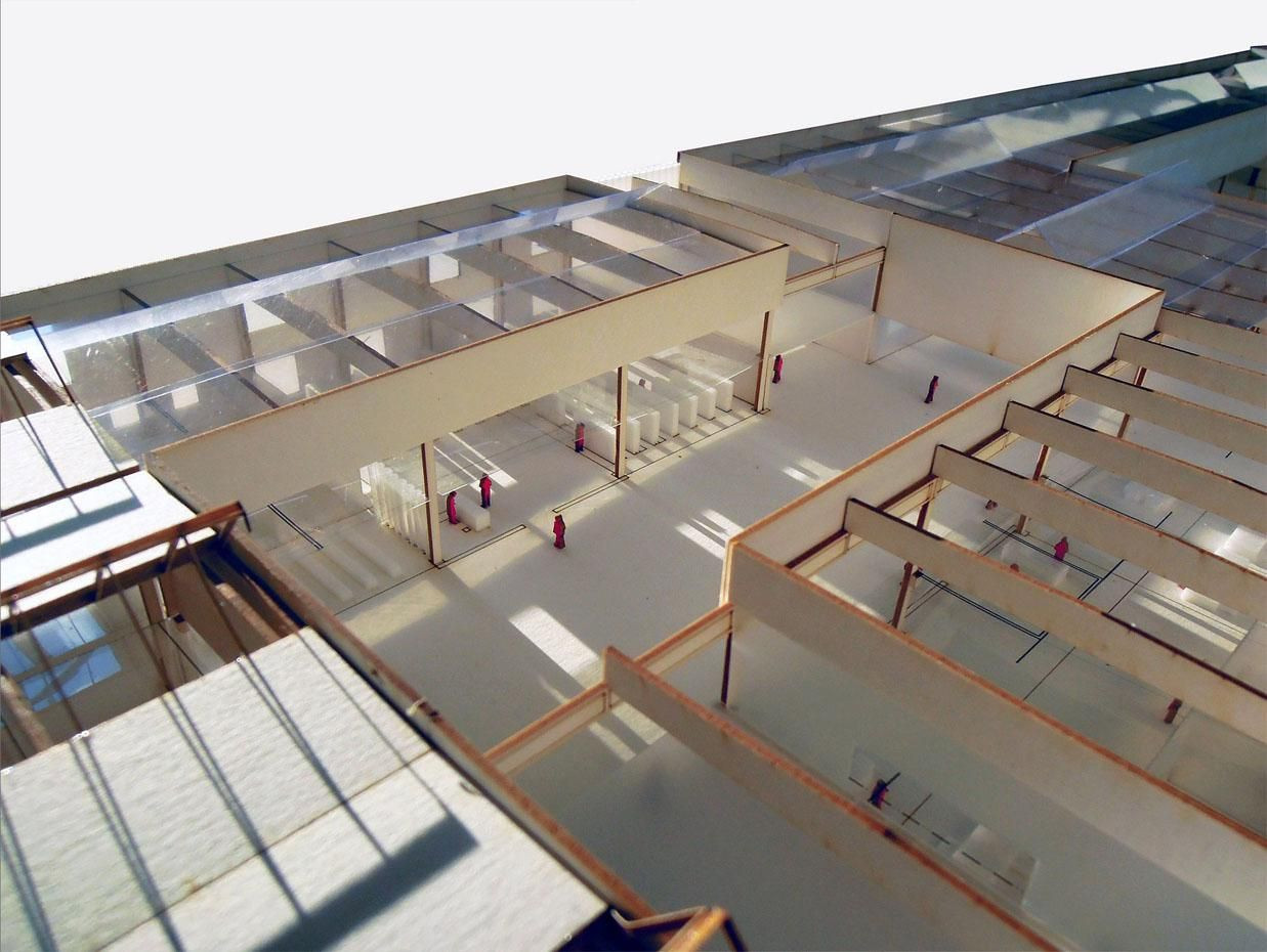 Původní hmota objektu je několikrát prořezána. Šířka současného objektu neposkytovala dostatečné prosvětlení. Vyjmutím polí z vnitřní lodě továrny, budoucího dvoru, umožňuji kvalitní prosvětlení z obou stran. V návaznosti na řeku Svitavu je zpřístupněno Sportovní nábřeží - od osy náměstí Republiky. Z důvodu lepší průchodnosti a komunikace v objektu jsou navrženy i dva průchody skrze dvůr. Viz schémata.
