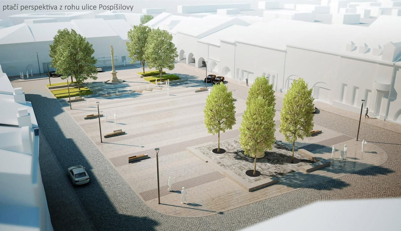 Dolní akcent náměstí, mariánský sloup, je podtržen dílčím pruhem kamenného "koberce" který se od barokní vertikály rozbíhá směrem k protíváze náměstí, terase sv. Floriána. Pásový vzor tohoto koberce je v určitém šířkovém posunu vůči celkové ploše náměstí, čím vzniká jisté napětí, které na styčné hraně vyůsťuje v umístění půdorysně významného vodního prvku nové fontány. Fontánu tvoří motiv ze znaku města ve formě otisknuté šestilisté koruny Jindřicha z Bělé. V plochách jejich zlatých listů z barevně upraveného bronzu je umístěno v řadě šest bílých vodních střiků, jež se mohou stát ve svém dynamickém projevu opravdovou atrakcí pro návštěvníky. Minímalistická forma nového vodního prvku nebude hmotově konkurovat výše popsaným historickým dominantám ani provozu v náměstí při instalaci mobilního pódia, kdy se jednoduše dočasně vypne.U mariánského sloupu bude zachována čtveřice stávajících listnatých stromů. V nárožích dolní částí náměstí zůstanou pod stromy zachovány vegetační plochy, které však budou svojí formou respektovat vzor městského gobelínu. Zvolený řád také respektují doplněná odpočinková dřevěná plata. V protíváze bude terasa se sochou sv. Floriána hmotově zvýrazněna novou čtveřící sloupovitých listnatých stromů. Tento bosket může být v době svátků pravidelně doplňován dočasně instalovaným vánočním stromem v místech stávajícího využití přerostlého jehličnanu, vedle v jihozápadním rohu hlavní plochy náměstí. Podélné strany centrální části náměstí lemují špalíry městského odpočinkového mobiliáře a stožárů veřejného osvětlení, které napomáhají čitelně definovat provozní podmínky upraveného městského prostoru.
