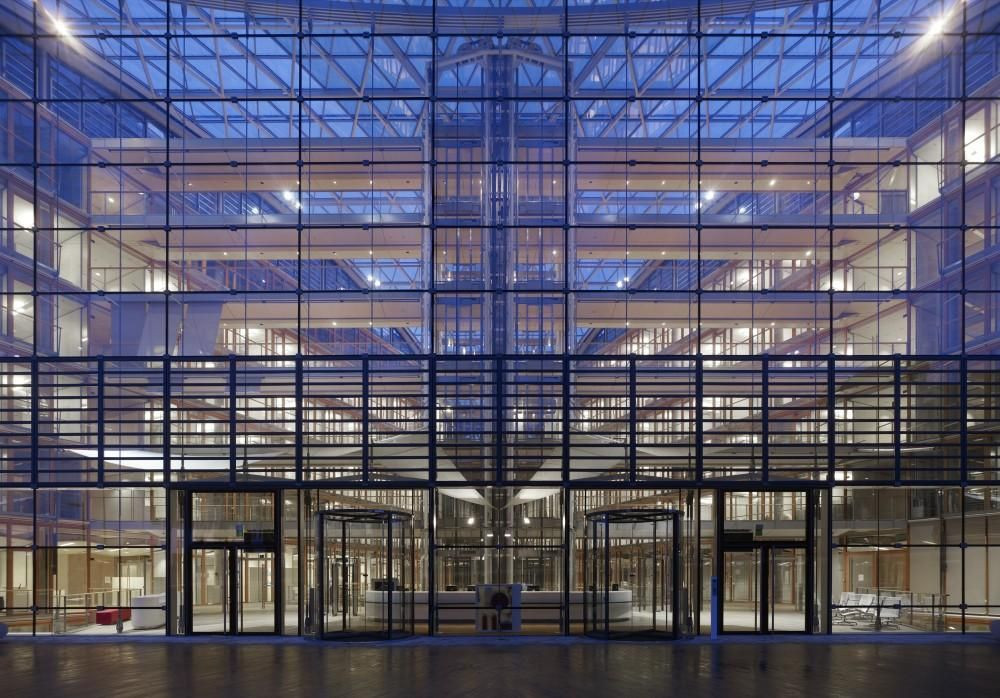 Nad kancelářskými křídly ve tvaru V, propojenými pomocí atrii a zimních zahrad, se vznáší skleněná střecha. Rozvržení budovy je ze všech stran ve vztahu ke kontextu a přirozeně zapadá do krajiny. Svažitost pozemku je uvnitř vyjádřena kavárnami a konferenčními sály, uspořádanými do interiérových teras. Tato atria propojují veřejné prostory v přízemí s kancelářemi v horních patrech.
