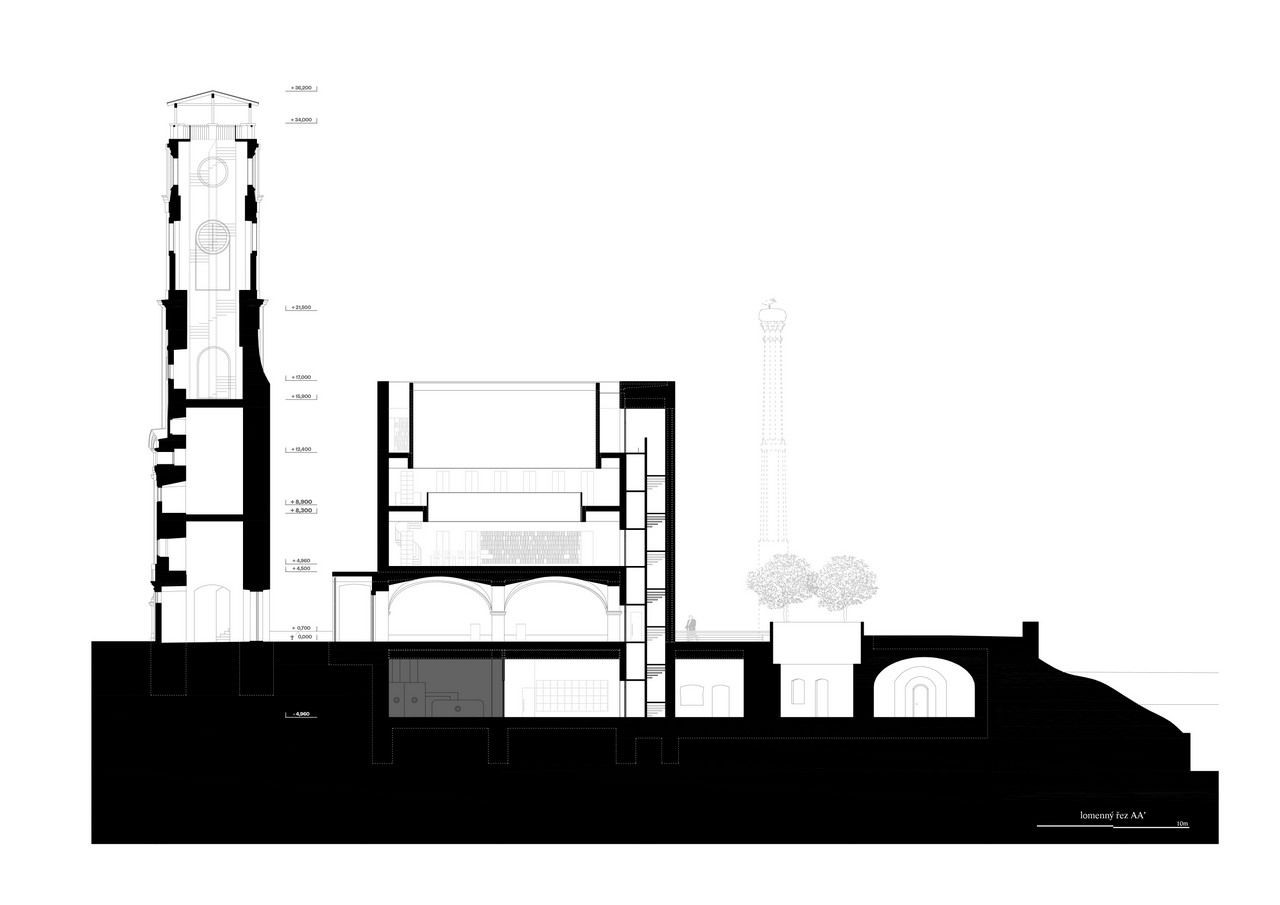 Jiří Lukáš, Centrum Jablonného v Podještědí, kostel/knihovna, řez A-A' – foto