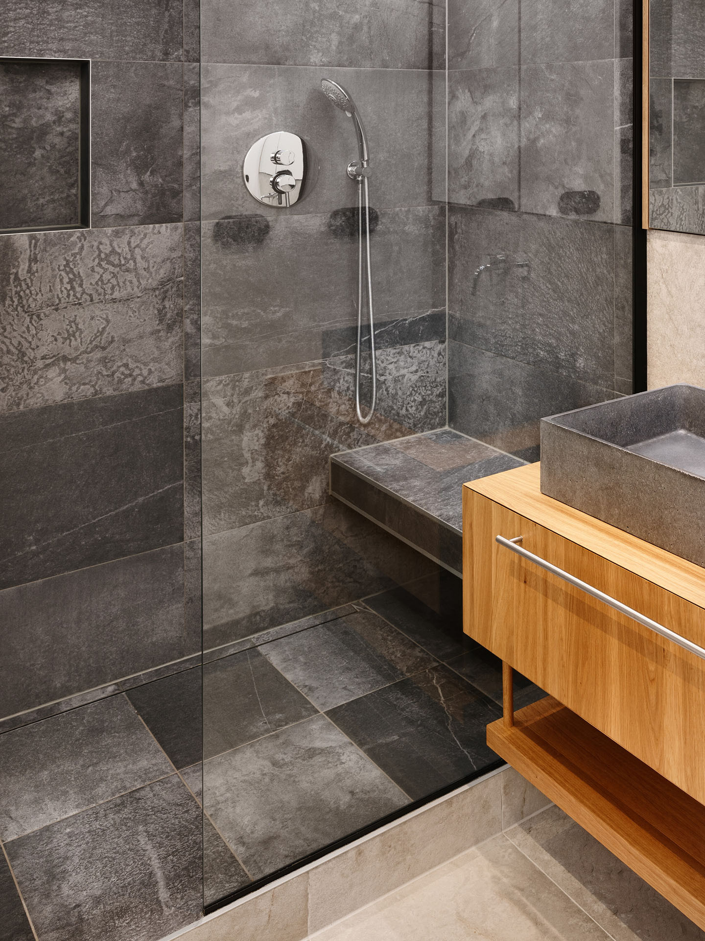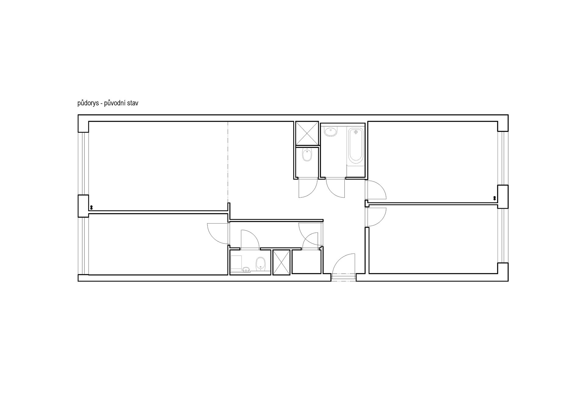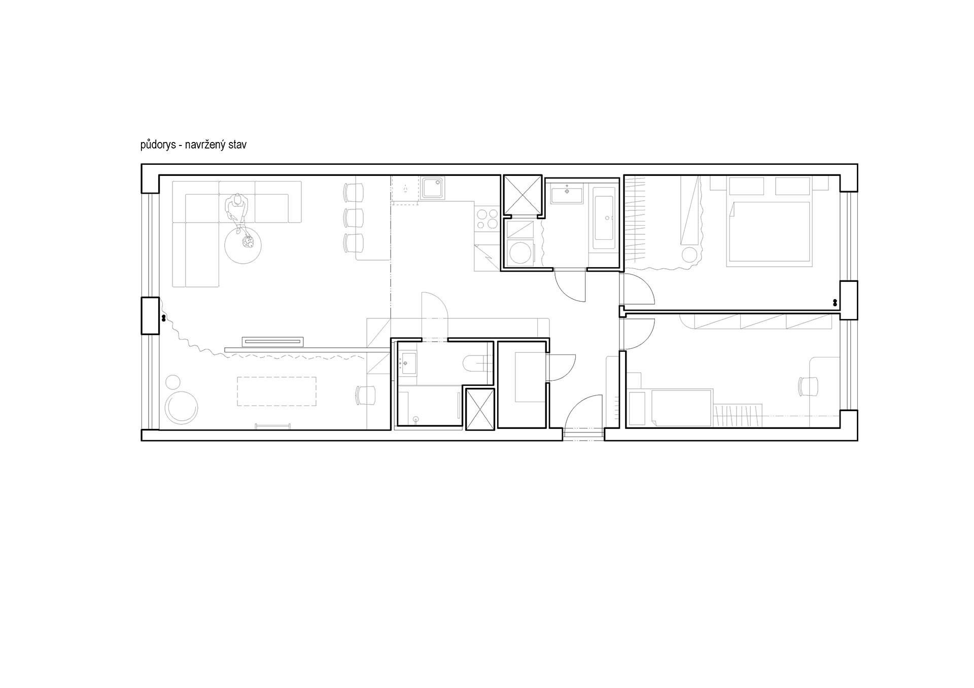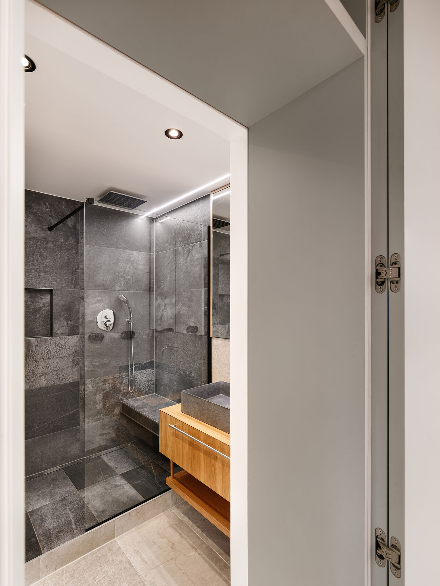 Koupelny vznikly rovnou dvě – jedna s vanou a skrytou pračkou, druhá se sprchou a toaletou. Jednu z koupelen obtékají vestavěné skříně s integrovanými dveřmi do koupelny. Interiér díky tomu působí čistě a kompaktně, bez rušivých prvků.