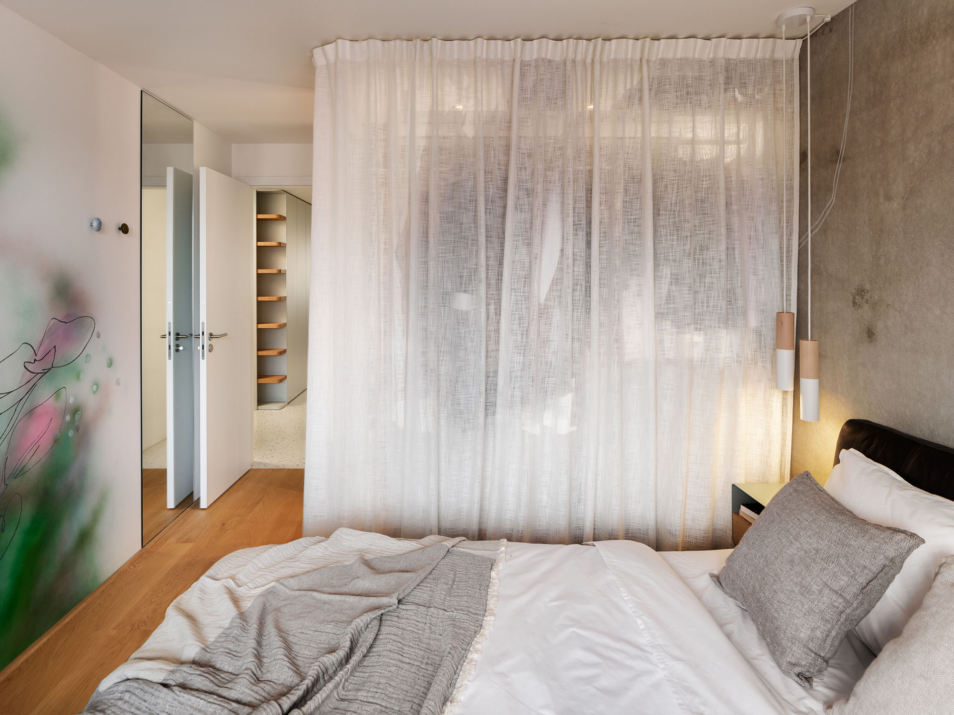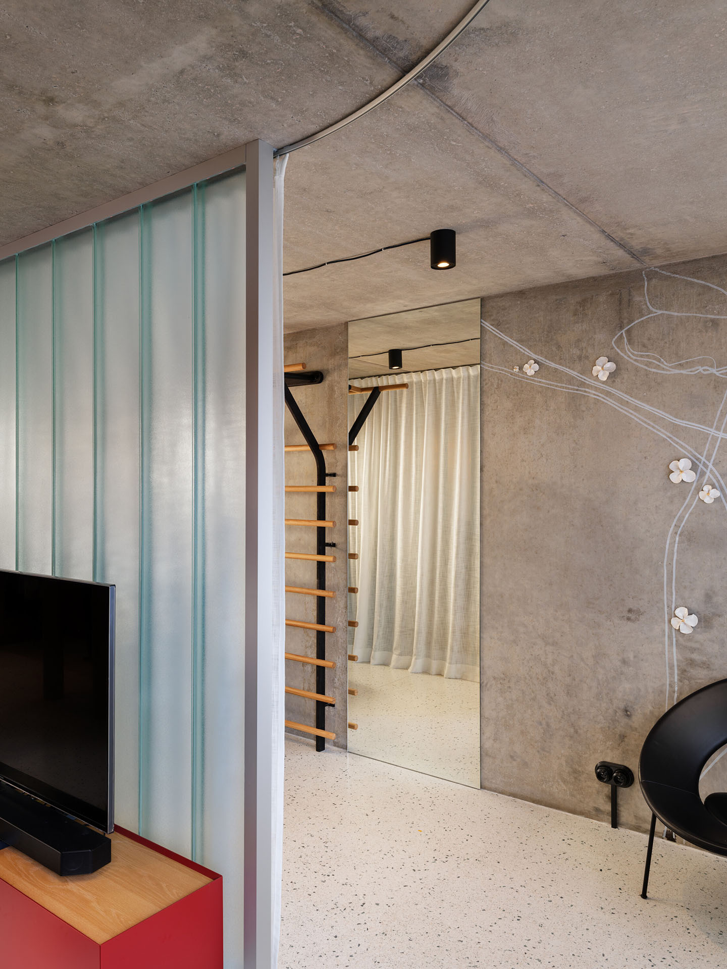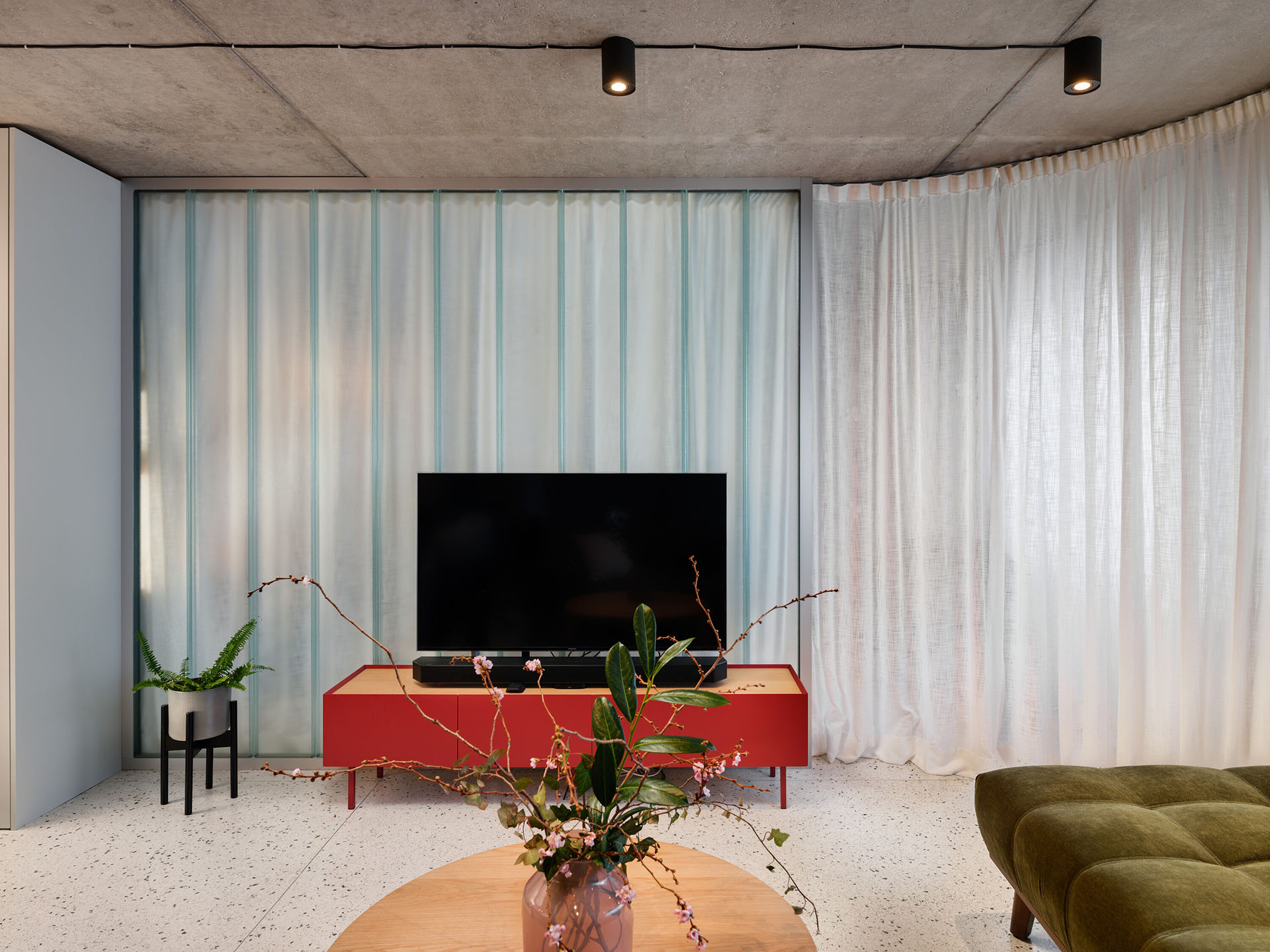 Pevné příčky nahradily závěsy, jež cíleně zjemňují tvrdý beton. Objevují se nejen podél copilitové stěny, ale i v ložnici, kde oddělují šatnu. Závěsy zde nejsou jen funkčním prvkem, ale také zásadní součástí vizuálního a atmosférického řešení celého interiéru.