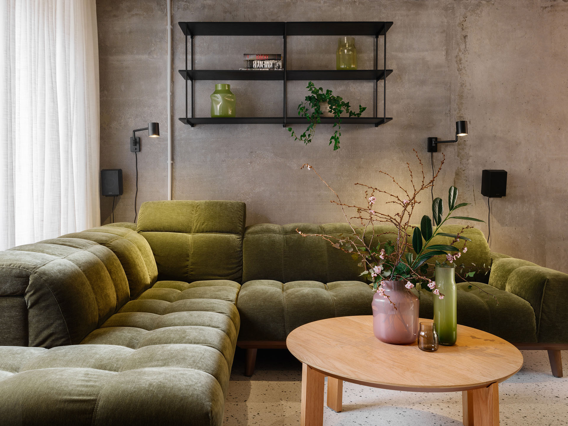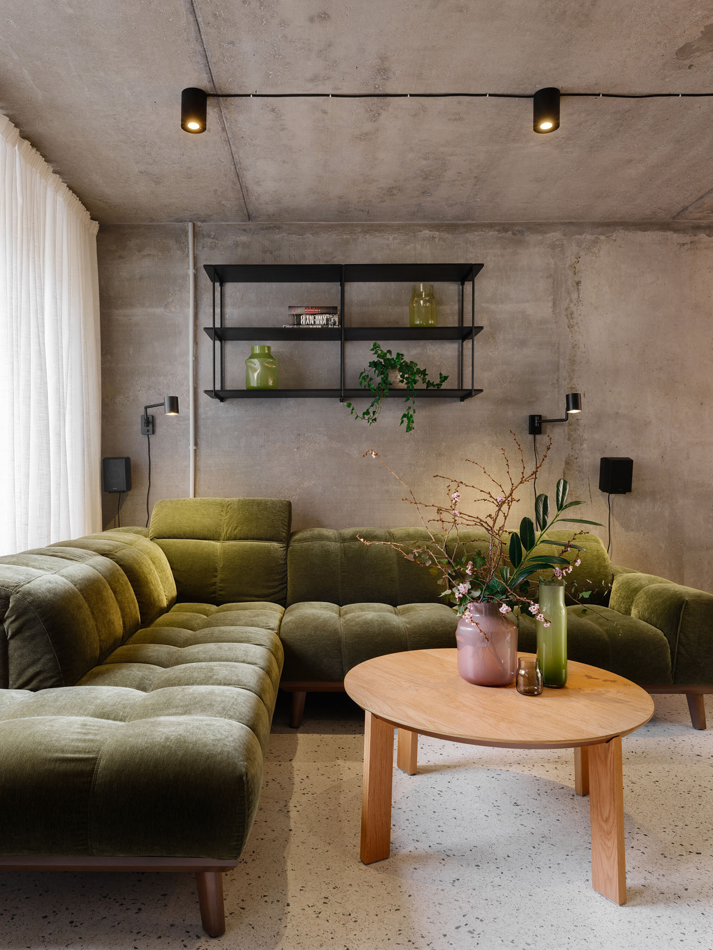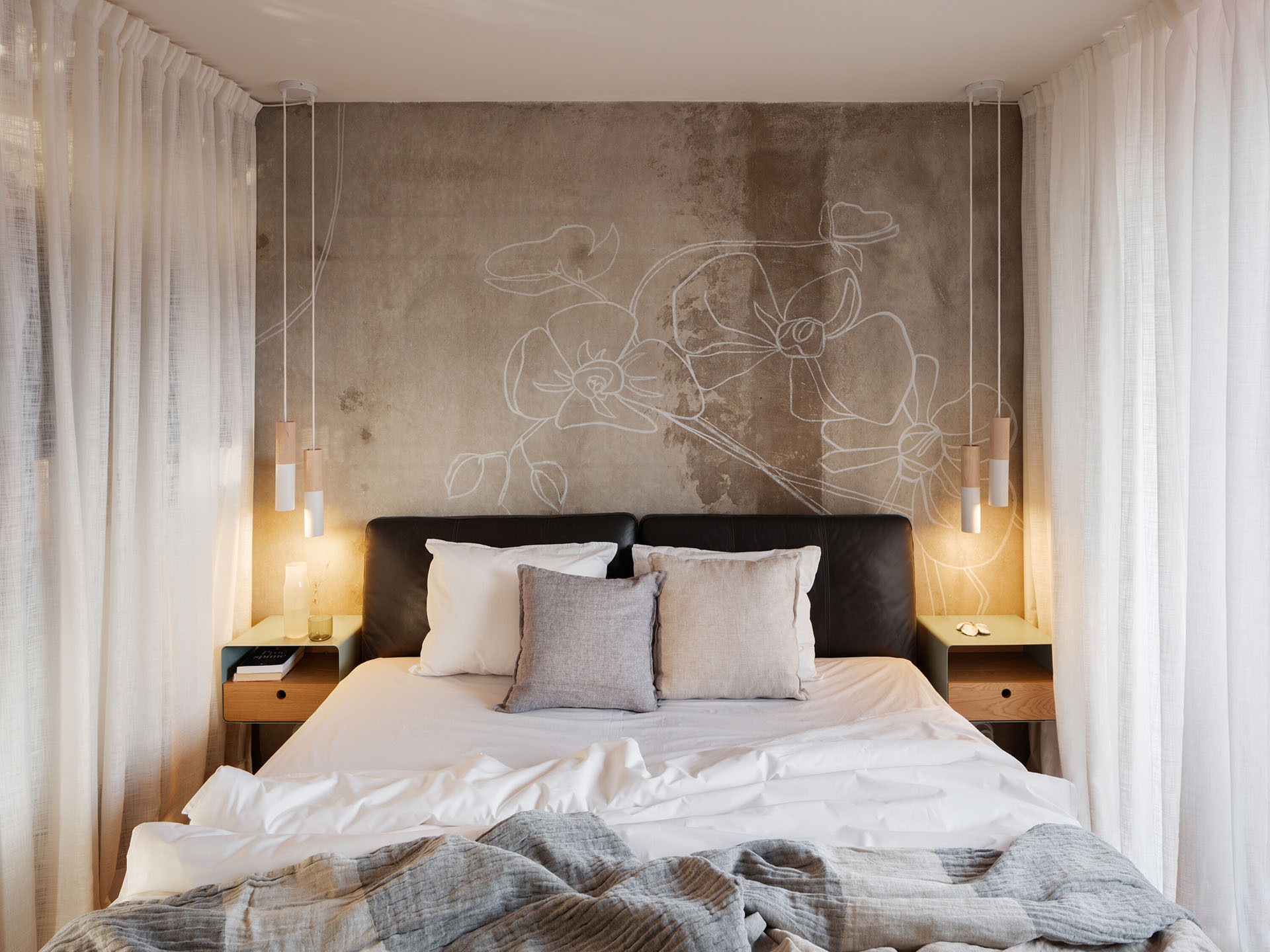 Pevné příčky nahradily závěsy, jež cíleně zjemňují tvrdý beton. Objevují se nejen podél copilitové stěny, ale i v ložnici, kde oddělují šatnu. Závěsy zde nejsou jen funkčním prvkem, ale také zásadní součástí vizuálního a atmosférického řešení celého interiéru.