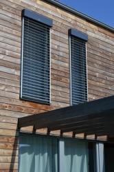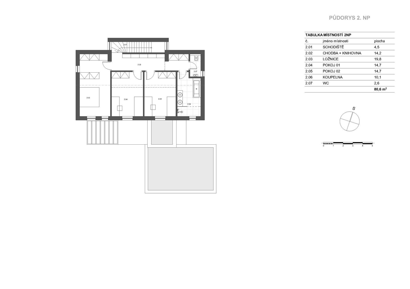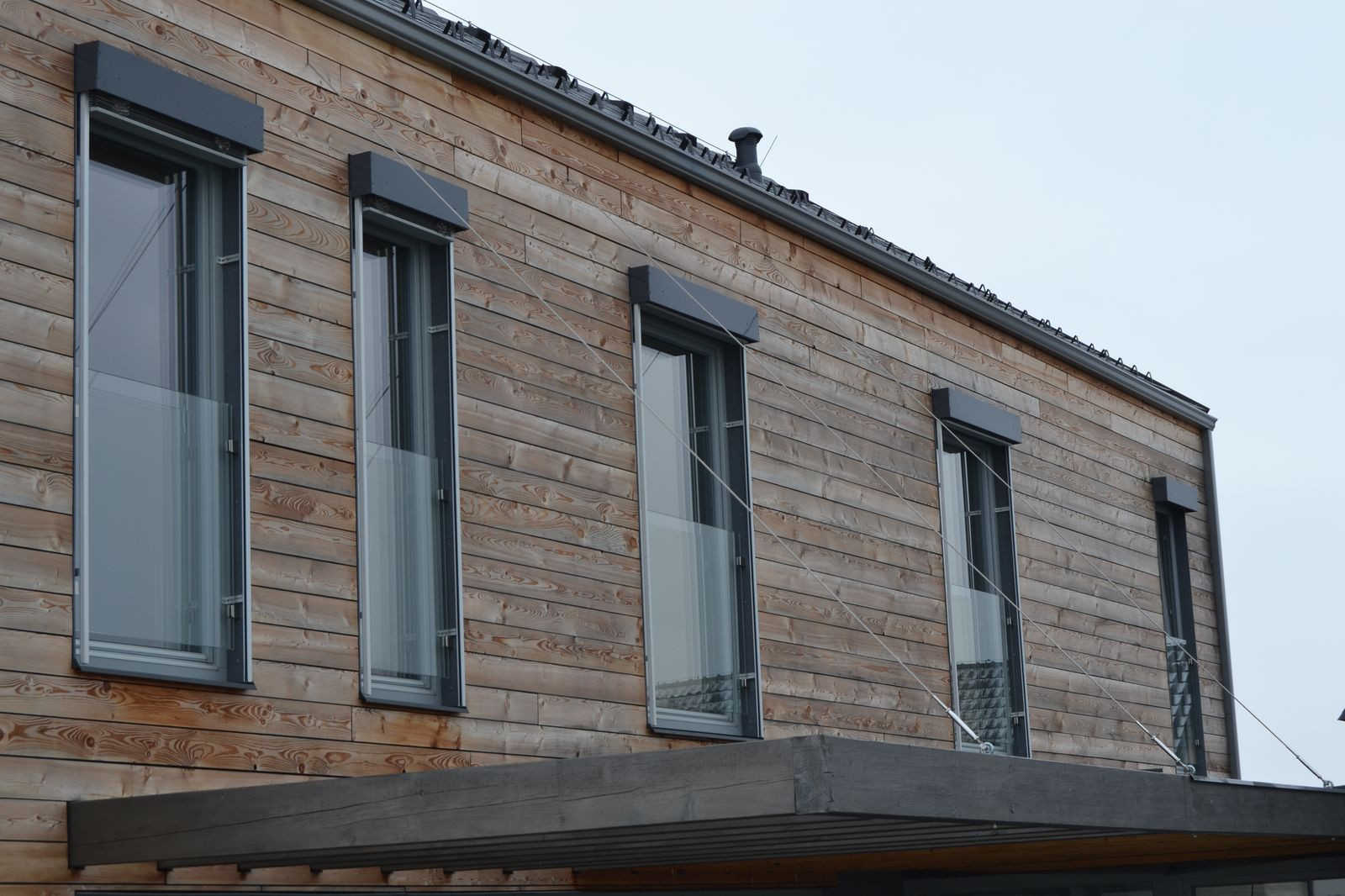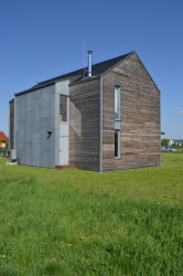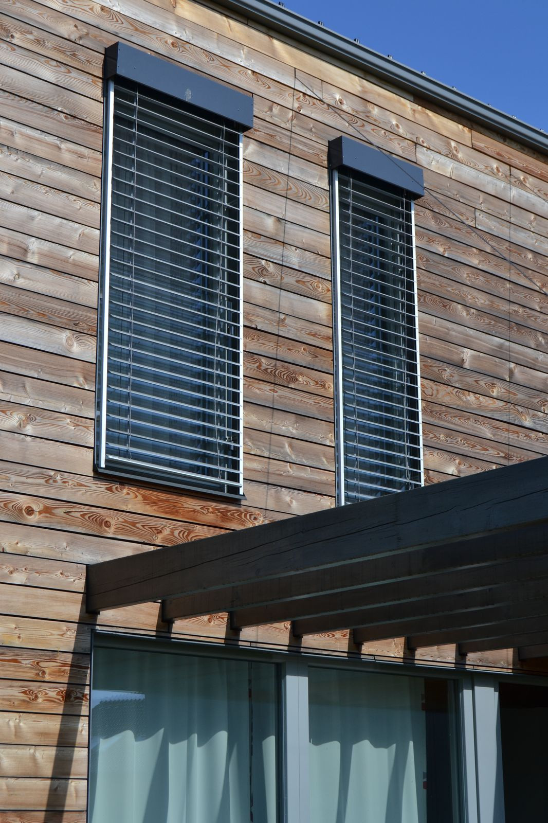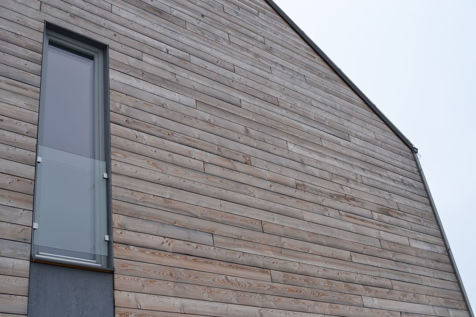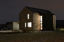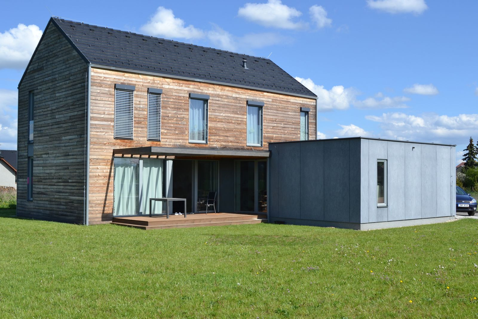 Všechny obytné pokoje orientujeme na slunný jihozápad, schodiště a provozní zázemí na sever. Důraz byl kladen na propojení hlavního obytného prostoru se zahradou velkými prosklenými otvory. Konstrukčně jsou dům i garáž řešeny jako lehká dřevostavba v systému two by four. Pro vnější obklad jsme zvolili kombinaci neošetřených modřínových prken na obytný dům a cementovláknitých desek na objekt garáže a hmotu schodiště. Vnější vzhled domu nepopírá, ale naopak podtrhuje použití dřeva v konstrukčním systému a ukazuje jeho přirozenou krásu.