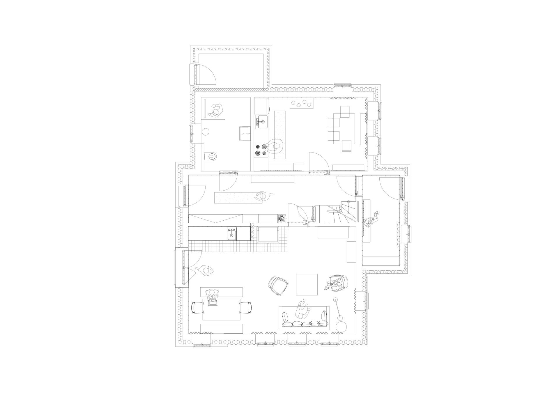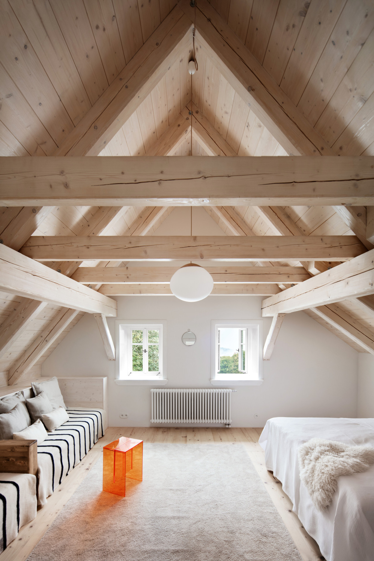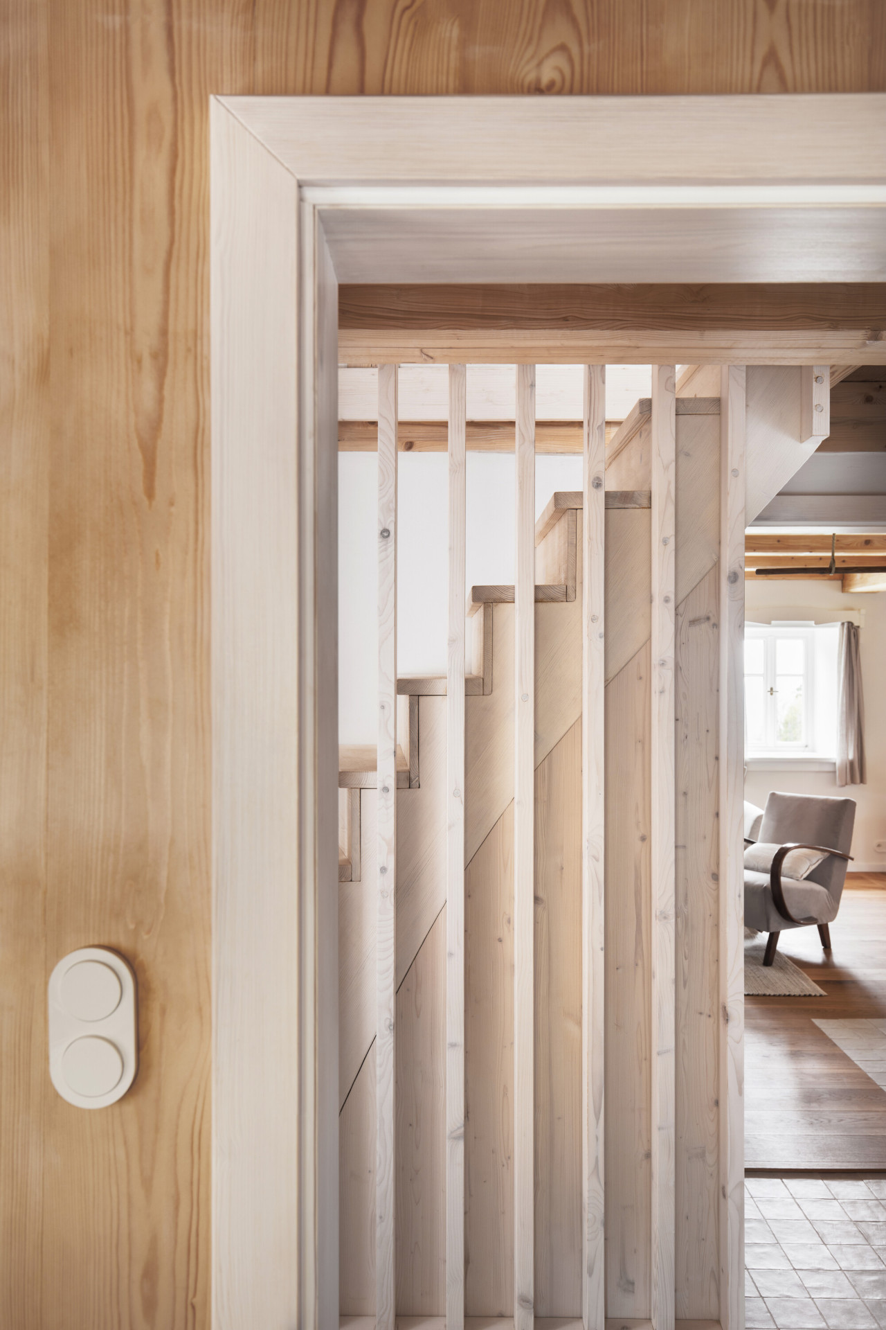 Vyšli z původní dispozice. Žije se v přízemí, spí se v podkroví – i když ne na seně, ale v pohodlných ložnicích. Srdcem domu je velká obytná „světnice“ s kuchyní a okny na východ – tudy dovnitř proudí ranní slunce.