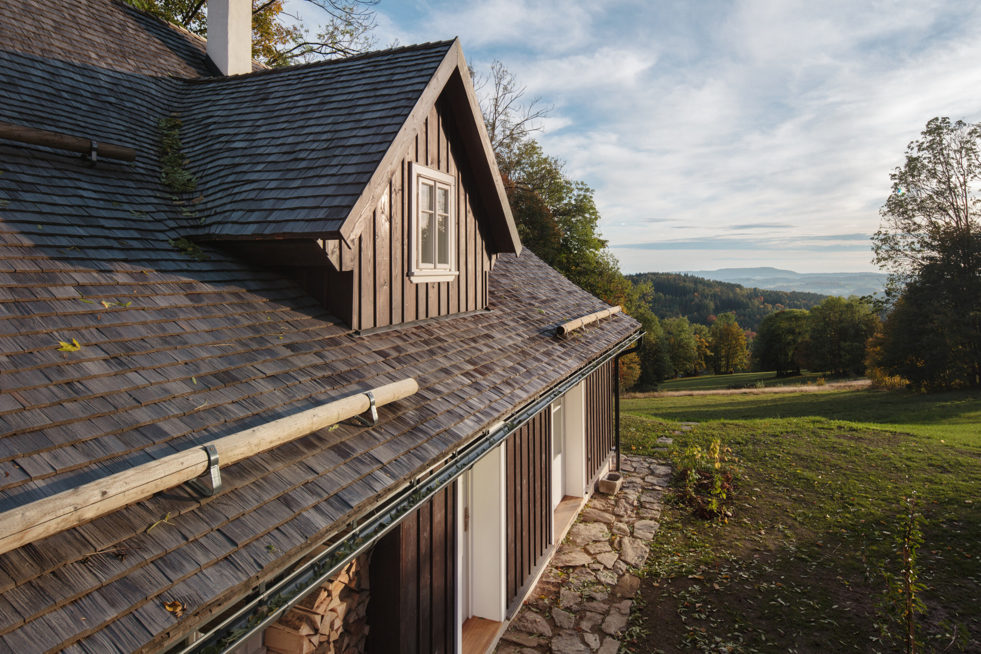Zvenčí je ale chalupa téměř identická s původní, architektka se snažila zachovat vzhled fasády. „Všechny dřevěné prvky jsou vyrobeny ručně na míru, střechu pokrývá šindelová krytina z jesenického šindele, a funkční okna s dvojsklem kopírují tradiční tvarování,“ vysvětluje Denisa Strmisková.