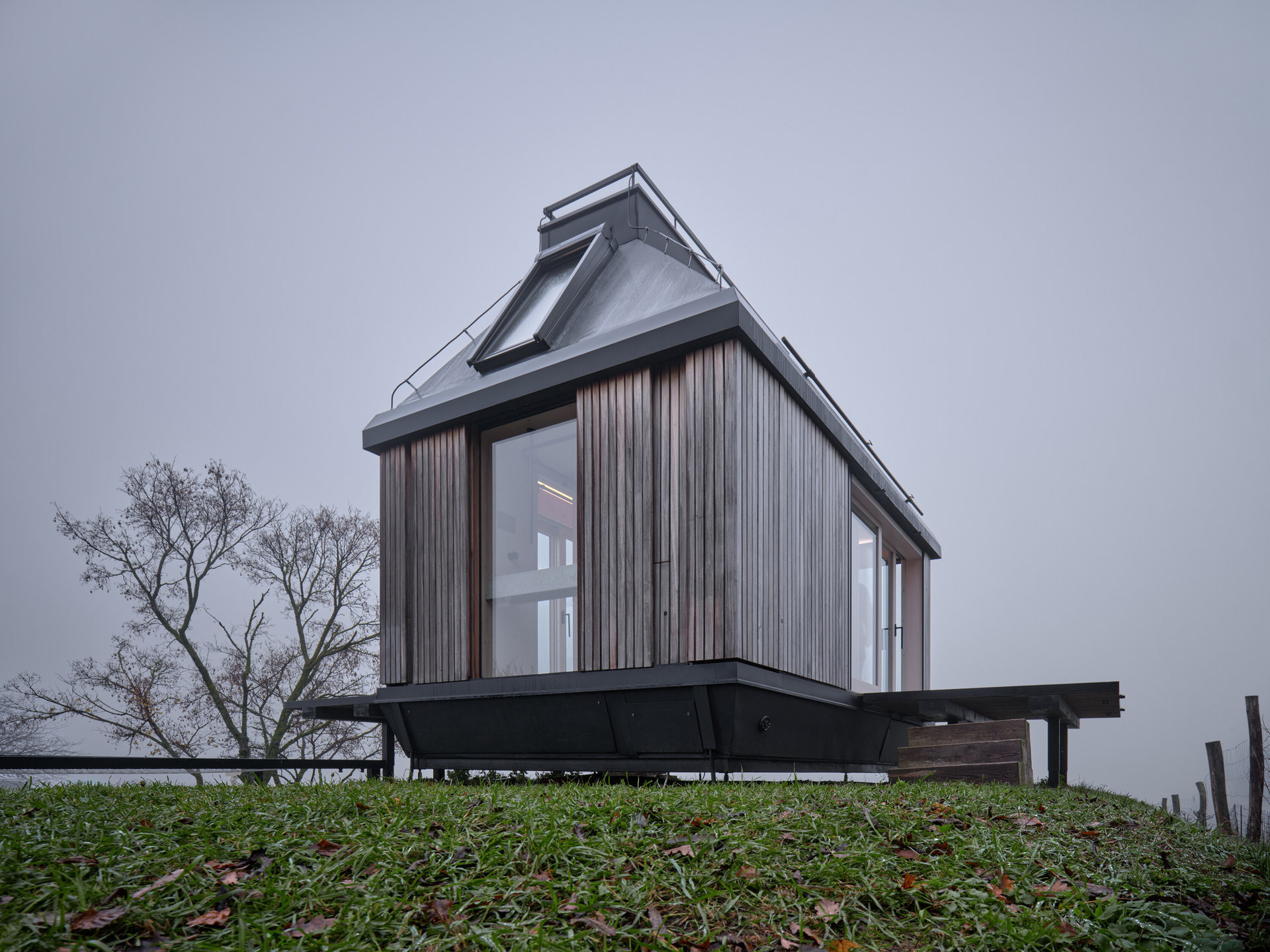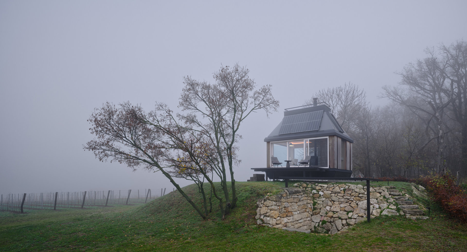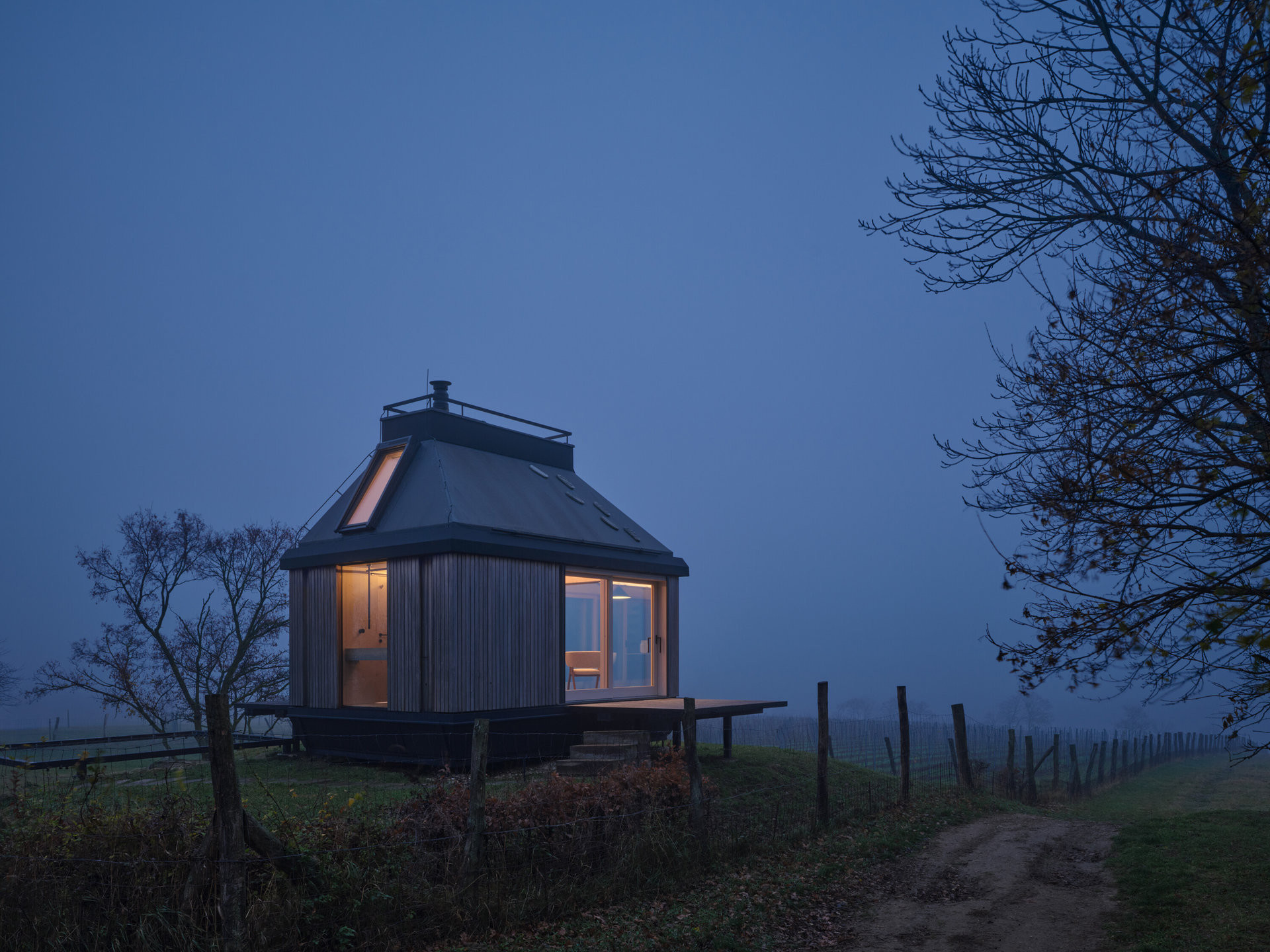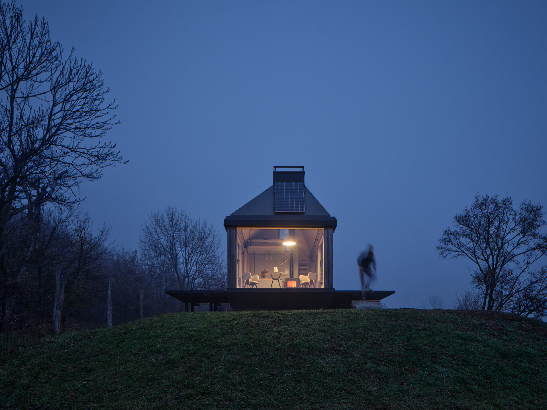 „Chtěli jsme navrhnout plnohodnotné víkendové bydlení na ploše 20 m²,“ vysvětlují architekti Martin a Viktor Mikovčákovi. Domek má poskytnout maximální komfort a zároveň fungovat jako takzvaný ostrovní systém bez připojení na sítě. Hosté tu jsou obklopeni ze všech stran přírodou a mají tu naprostý klid. To je v dnešní době ten největší luxus, který se tady nabízí za cenu kolem 130 eur za noc.