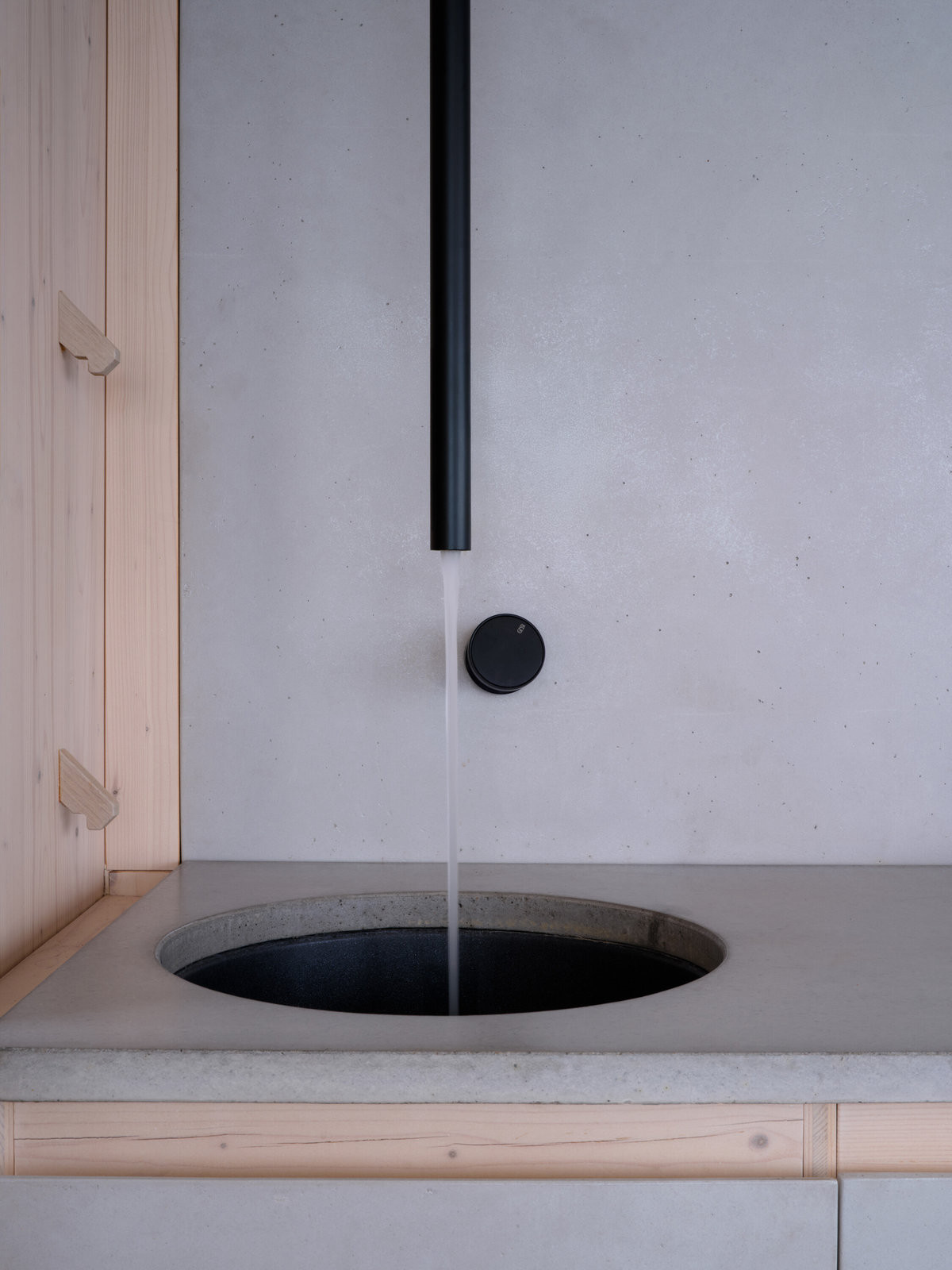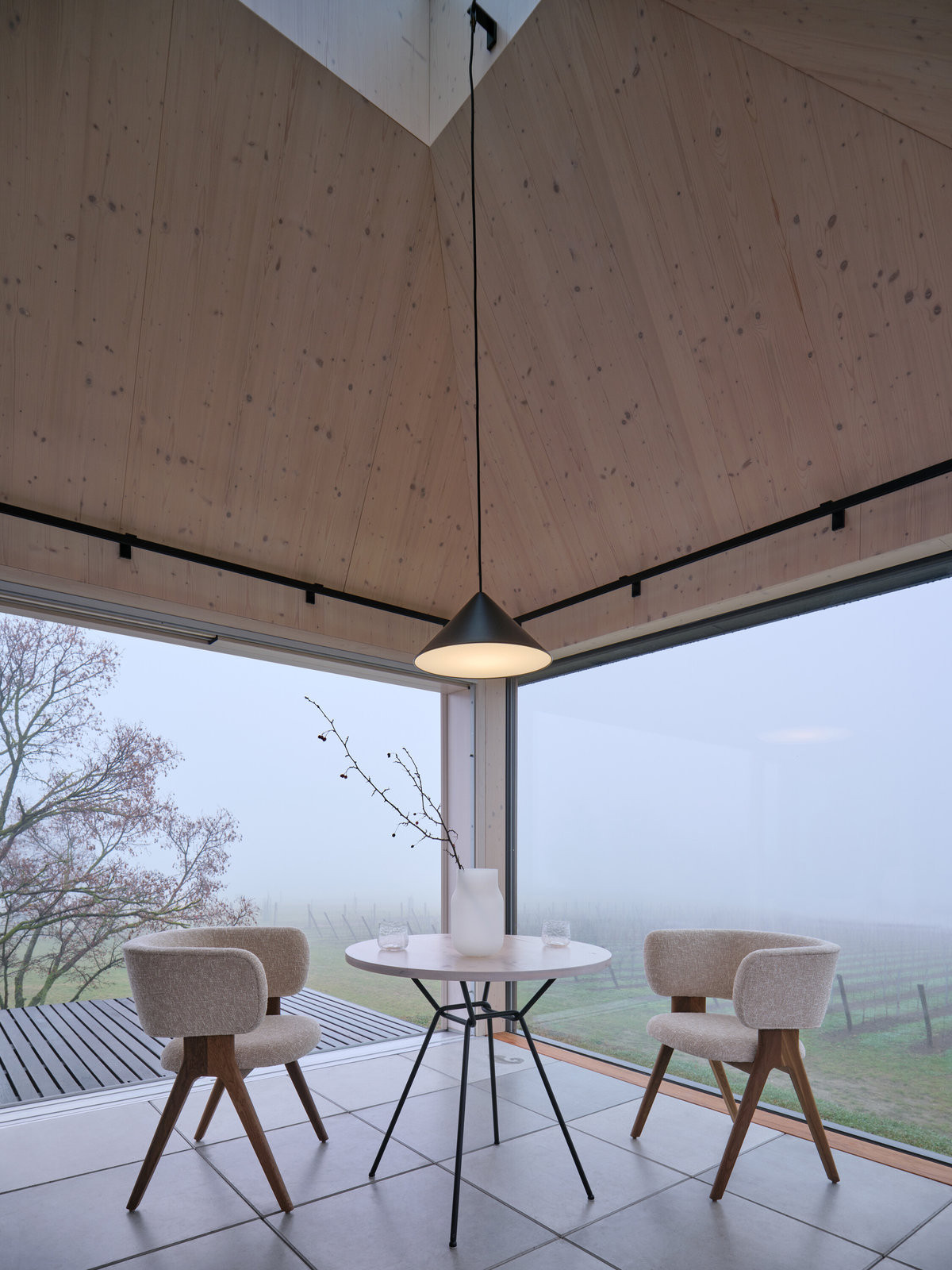 Jak to probíhá? Host přijede k restauraci, na jejímž pozemku se domek nachází. Pak ho vyvezou ještě asi 3 km mezi vinice. Je tam soukromí, výhledy a dům na to reaguje prosklením na všechny světové strany. Uvnitř je velký obytný prostor, za ním se nachází koupelna. „Betonové umyvadlo osazené přímo v okně směřuje výhledem do lesa. Tento moment zpomaluje ranní rituál a propojuje každodennost s přírodou,“ popisují architekti – čištění zubů se tu mění v meditaci.