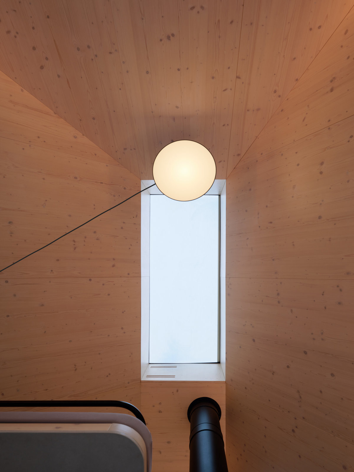 Plochy na spaní jsou v podkroví, během dne zcela neviditelné. Až když se zatáhne za kabel lampy, ze skříně vyjede schodiště. Po něm se stoupá pod střechu, kde jsou postele. Podkroví má kontrastní atmosféru — místo prosklených stěn ho chrání hutný plášť střechy a uzavírá uživatele do intimního prostoru. „Nad hlavou zůstává jen střešní světlík určený k pozorování hvězd,“ popisují architekti.