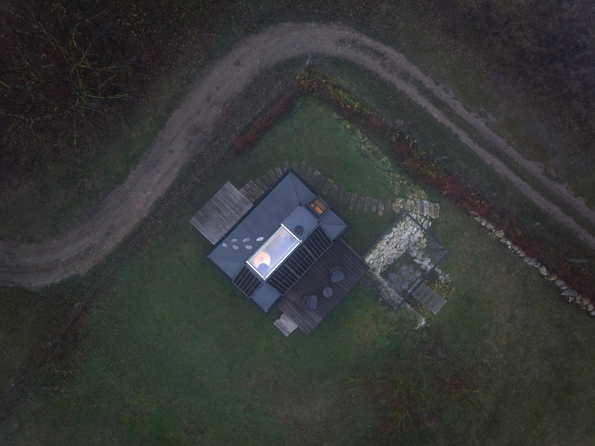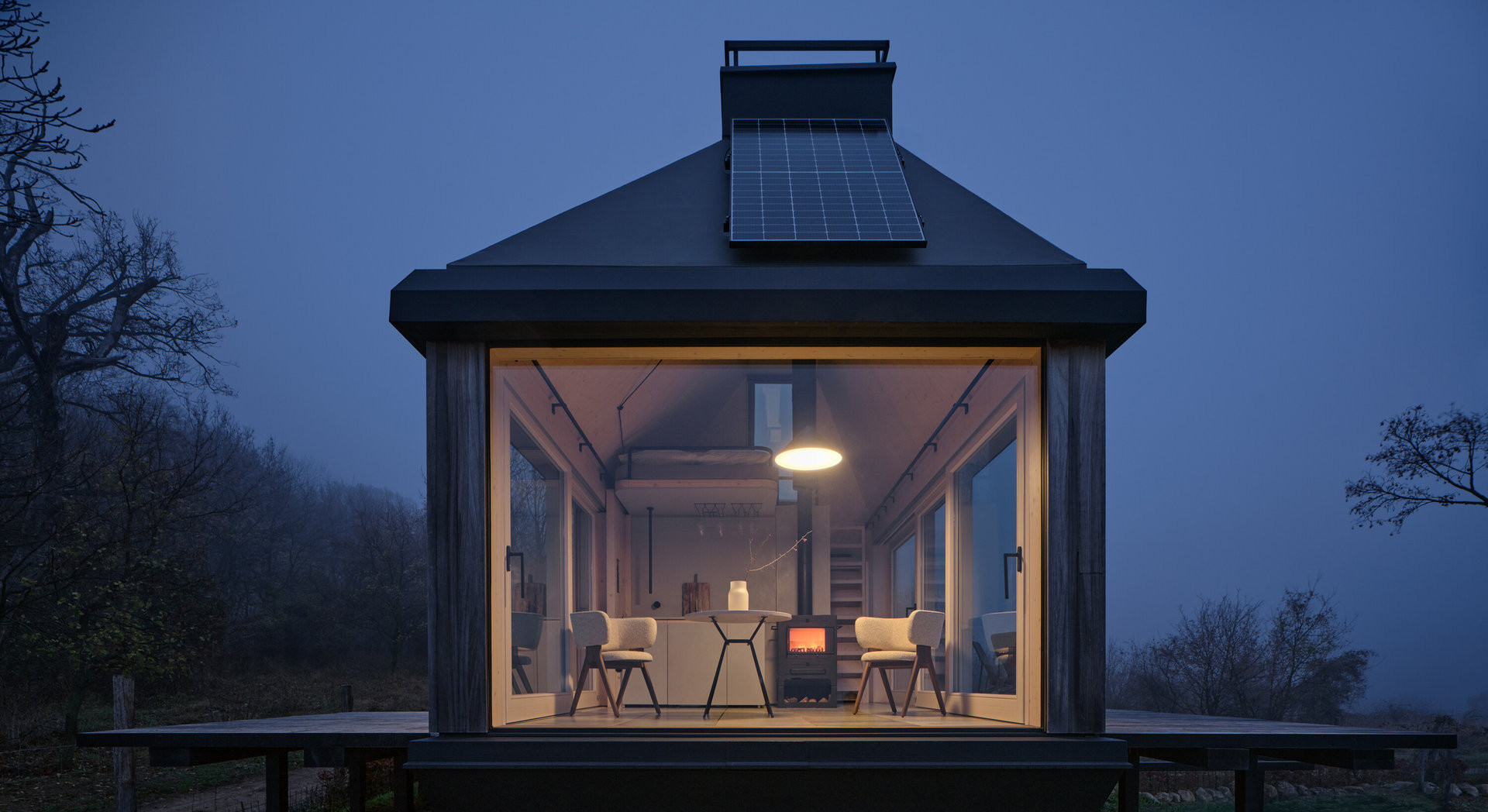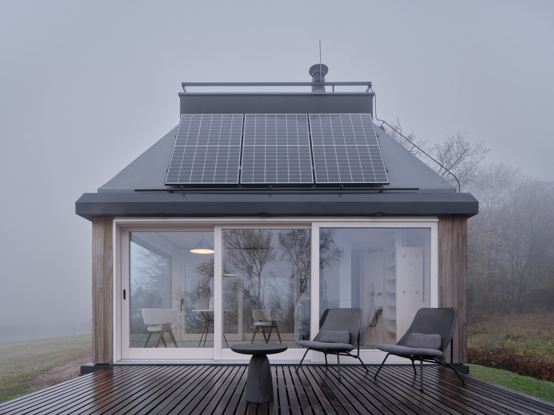Chata je od okolního světa oddělena nejen pocitově, ale i technologicky. Funguje jako takzvaný „ostrovní systém“ a veškerou energii si vyrábí bez připojení k sítím.