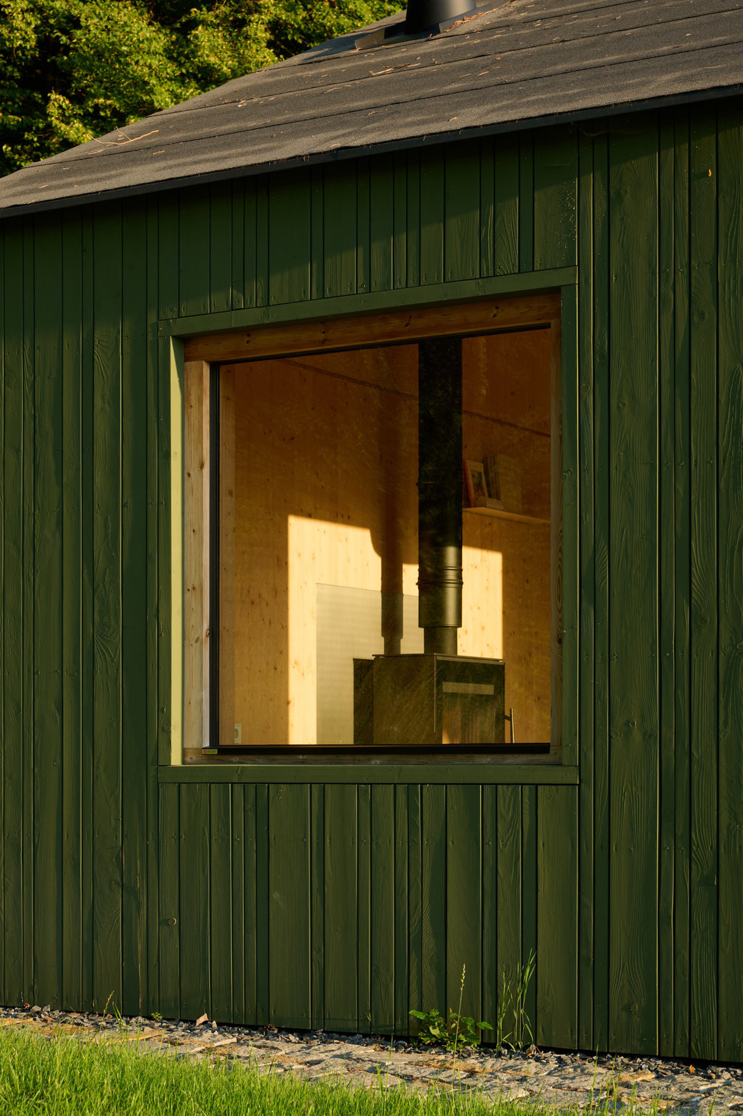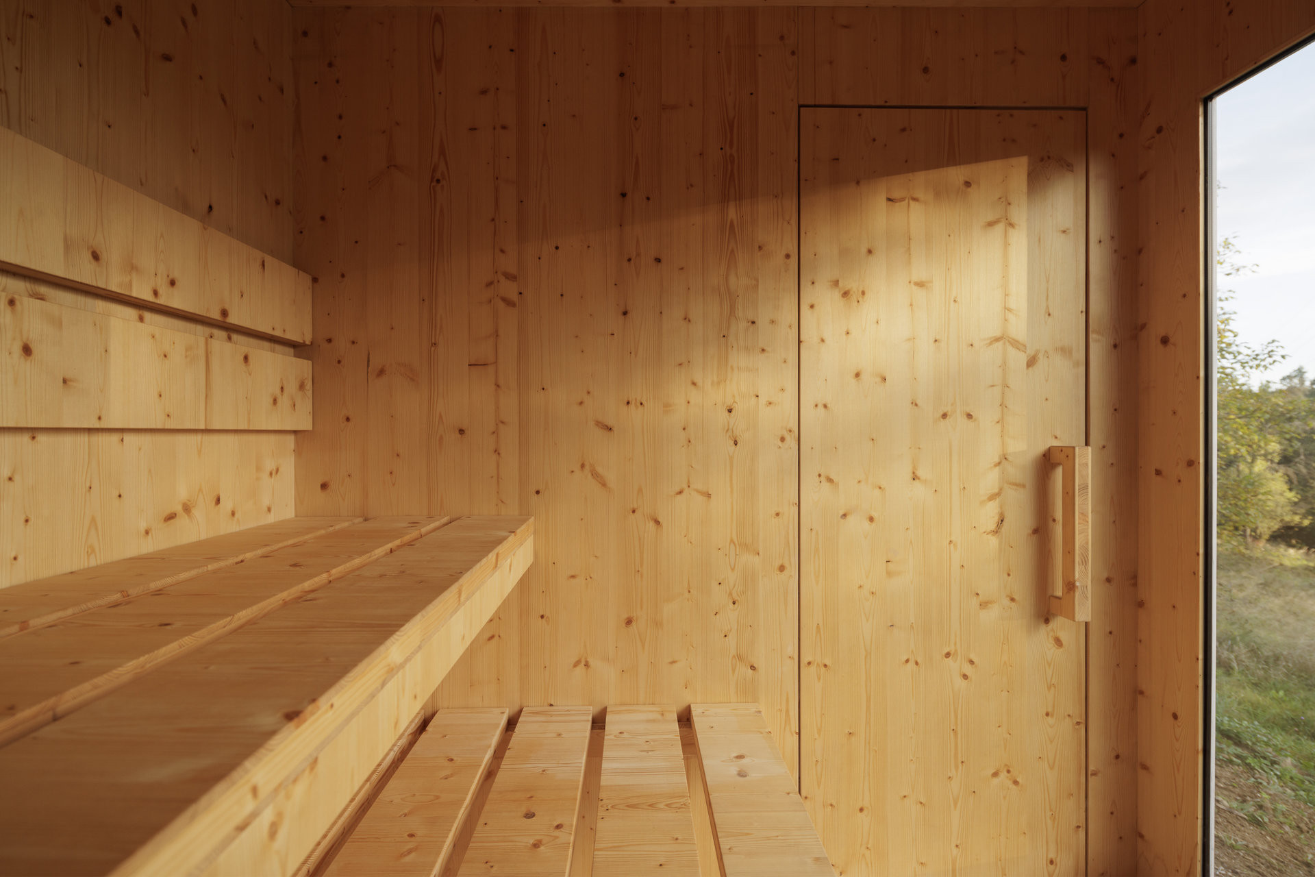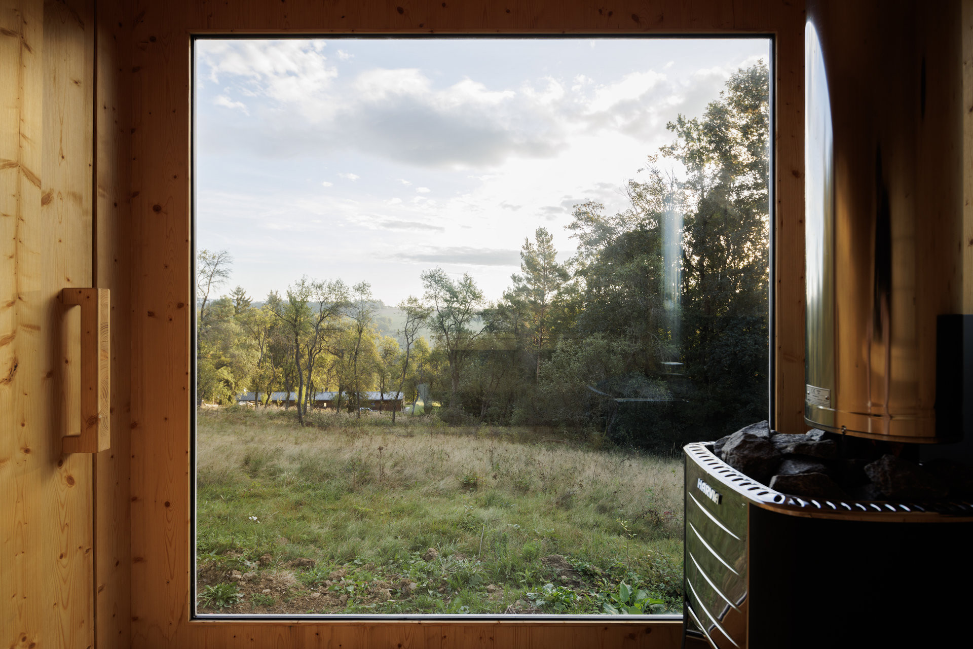 „Chata je navržena tak, aby v ní hosté mohli strávit plnohodnotný víkend a nemuseli ji vůbec opouštět – maximálně k ohništi nebo do sauny, která stojí pod vzrostlou hrušní,“ píše se ve zprávě ke vzniku této valašské novinky. Skutečně, jen o několik kroků dál se nachází sauna s kamny na dřevo a taktéž s velkým oknem do krajiny – ochladit se dá v přistavené plechové vaně.