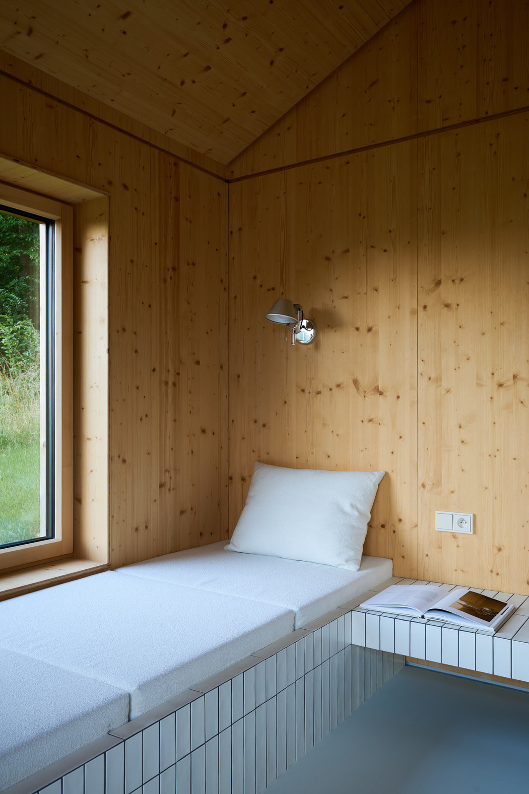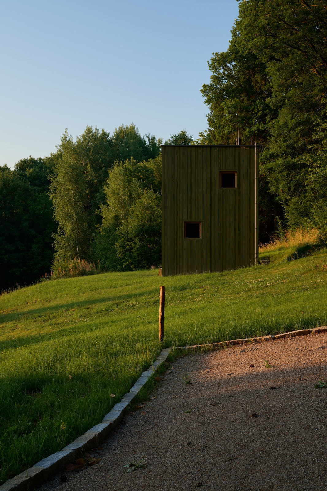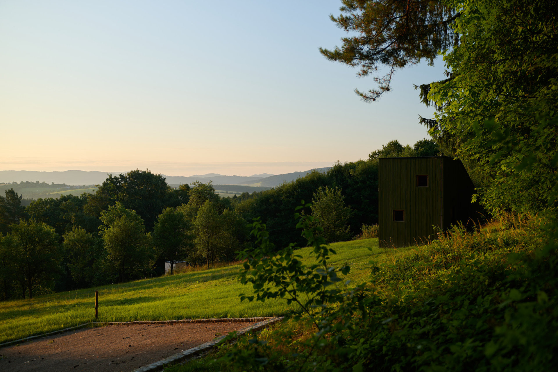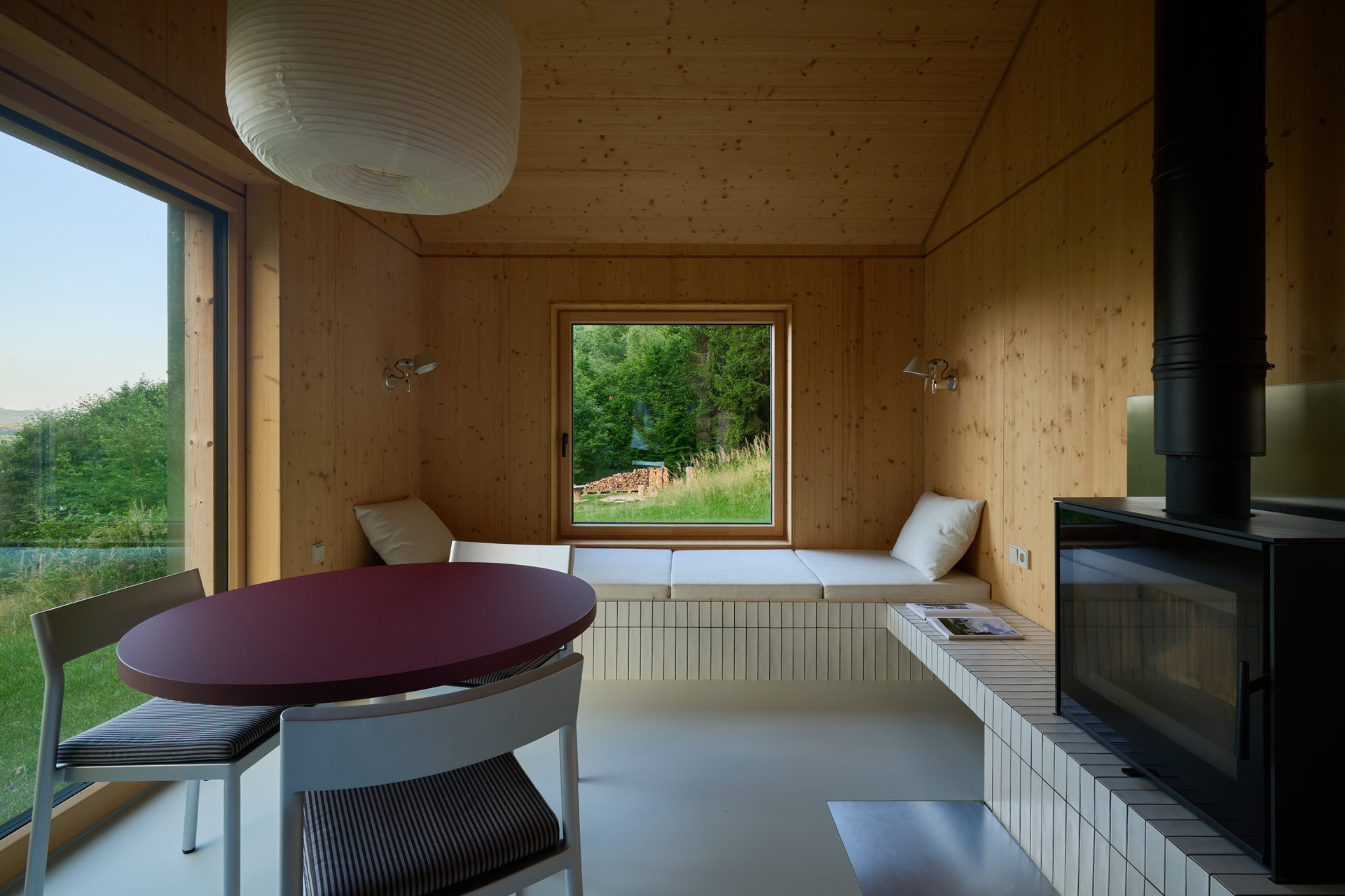 „Chata je navržena tak, aby v ní hosté mohli strávit plnohodnotný víkend a nemuseli ji vůbec opouštět – maximálně k ohništi nebo do sauny, která stojí pod vzrostlou hrušní,“ píše se ve zprávě ke vzniku této valašské novinky. Skutečně, jen o několik kroků dál se nachází sauna s kamny na dřevo a taktéž s velkým oknem do krajiny – ochladit se dá v přistavené plechové vaně.
