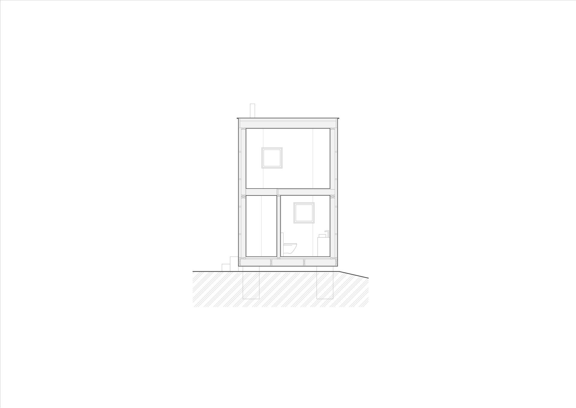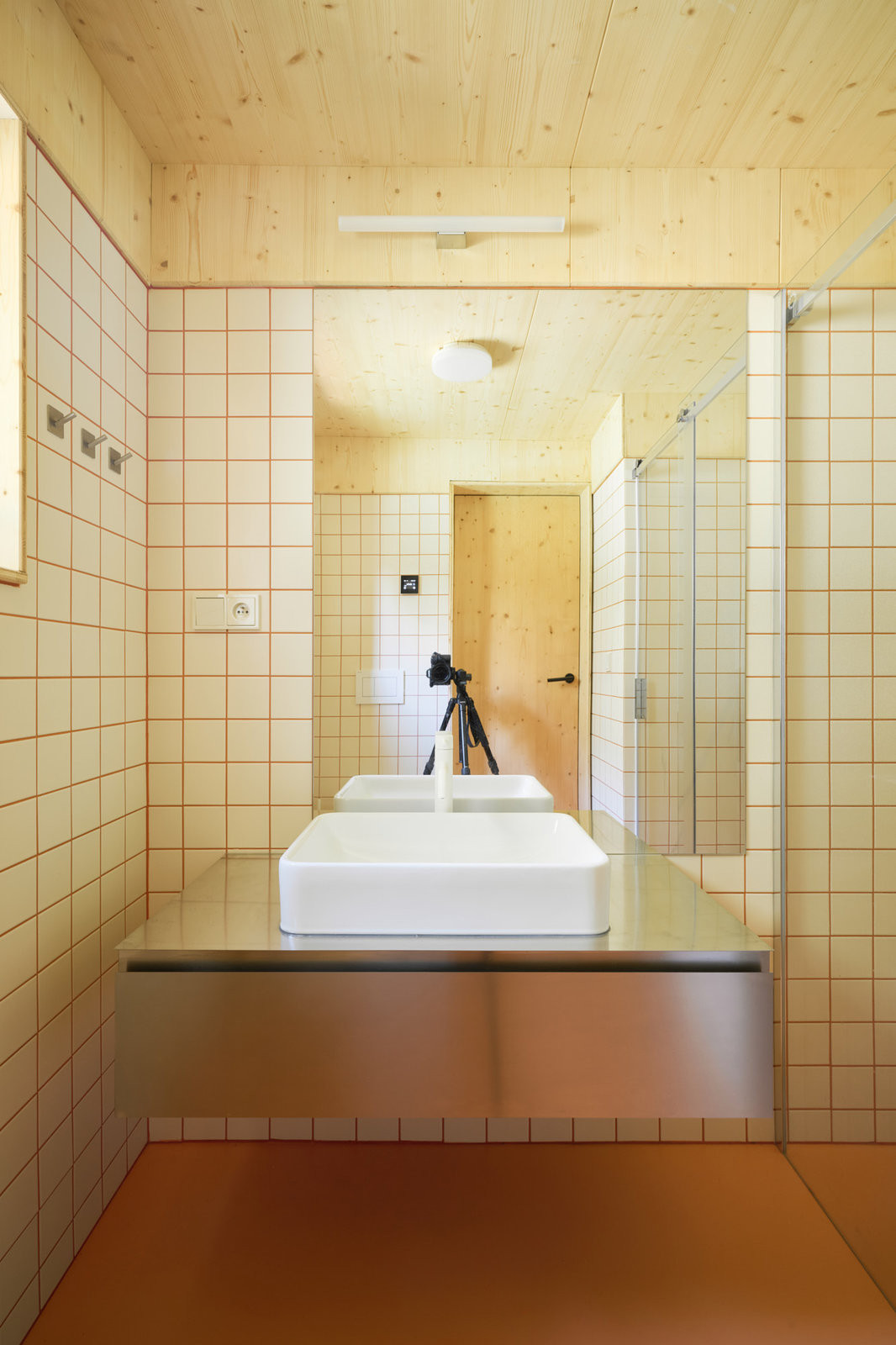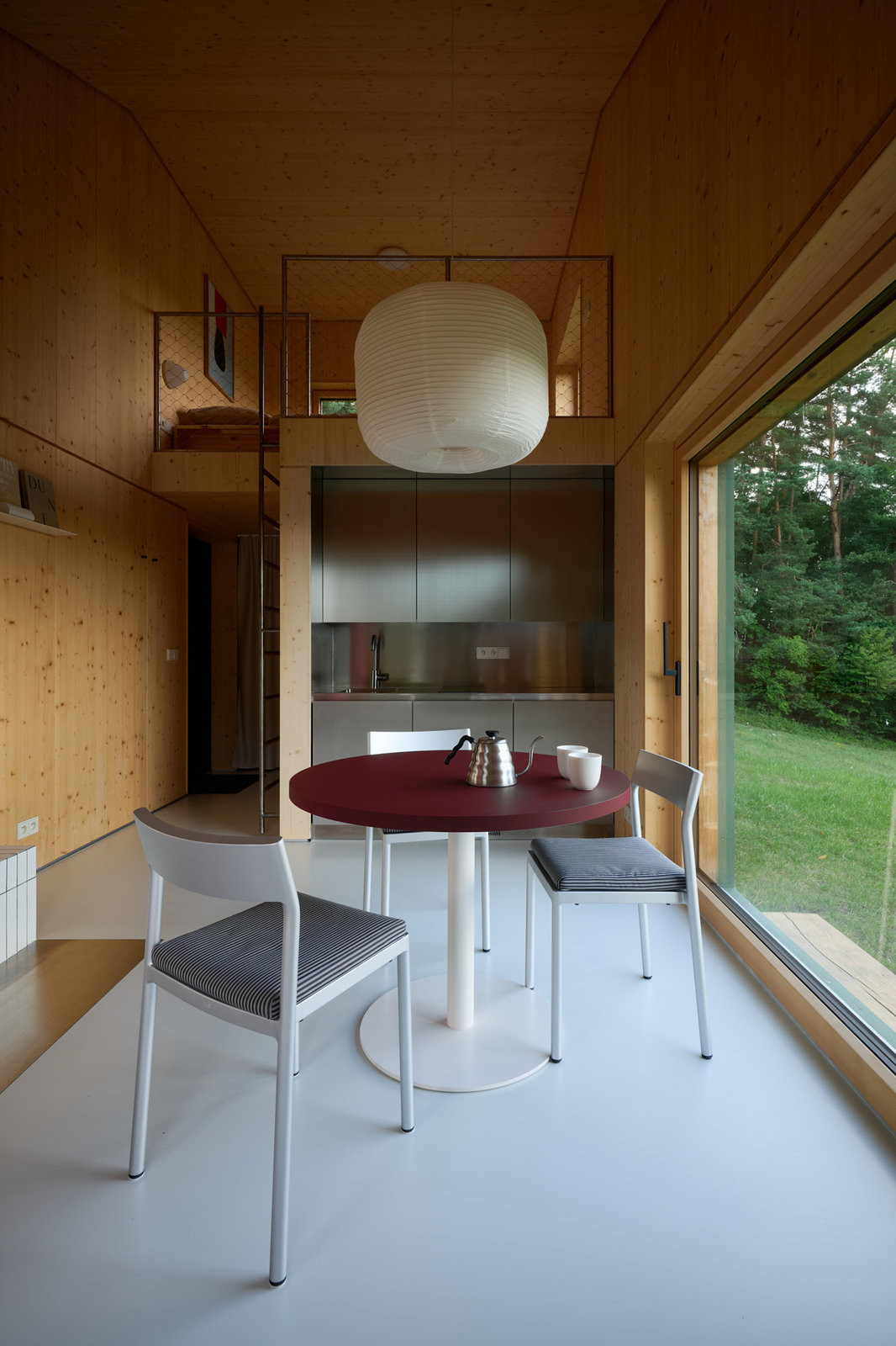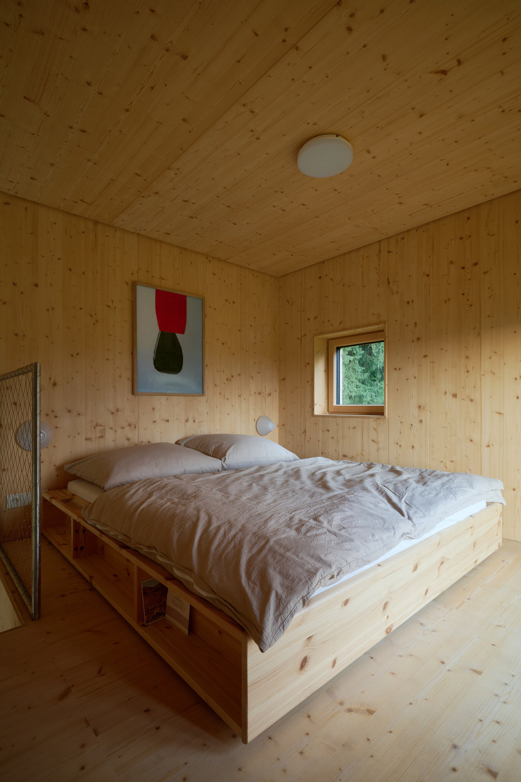 Do přízemí se vešla ještě pohodlná koupelna se sprchovým koutem, nad ní je patro na spaní. Není však zkosené, lze se tam postavit – vše je tu sice kompaktní, zároveň však navrženo s důrazem na pohodlí a odpočinek.
