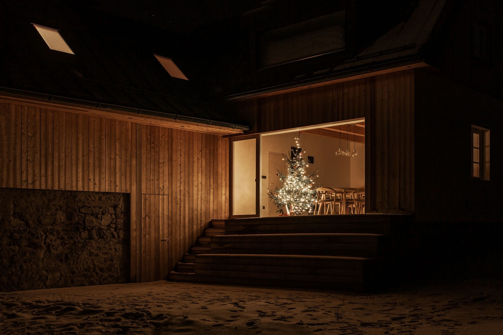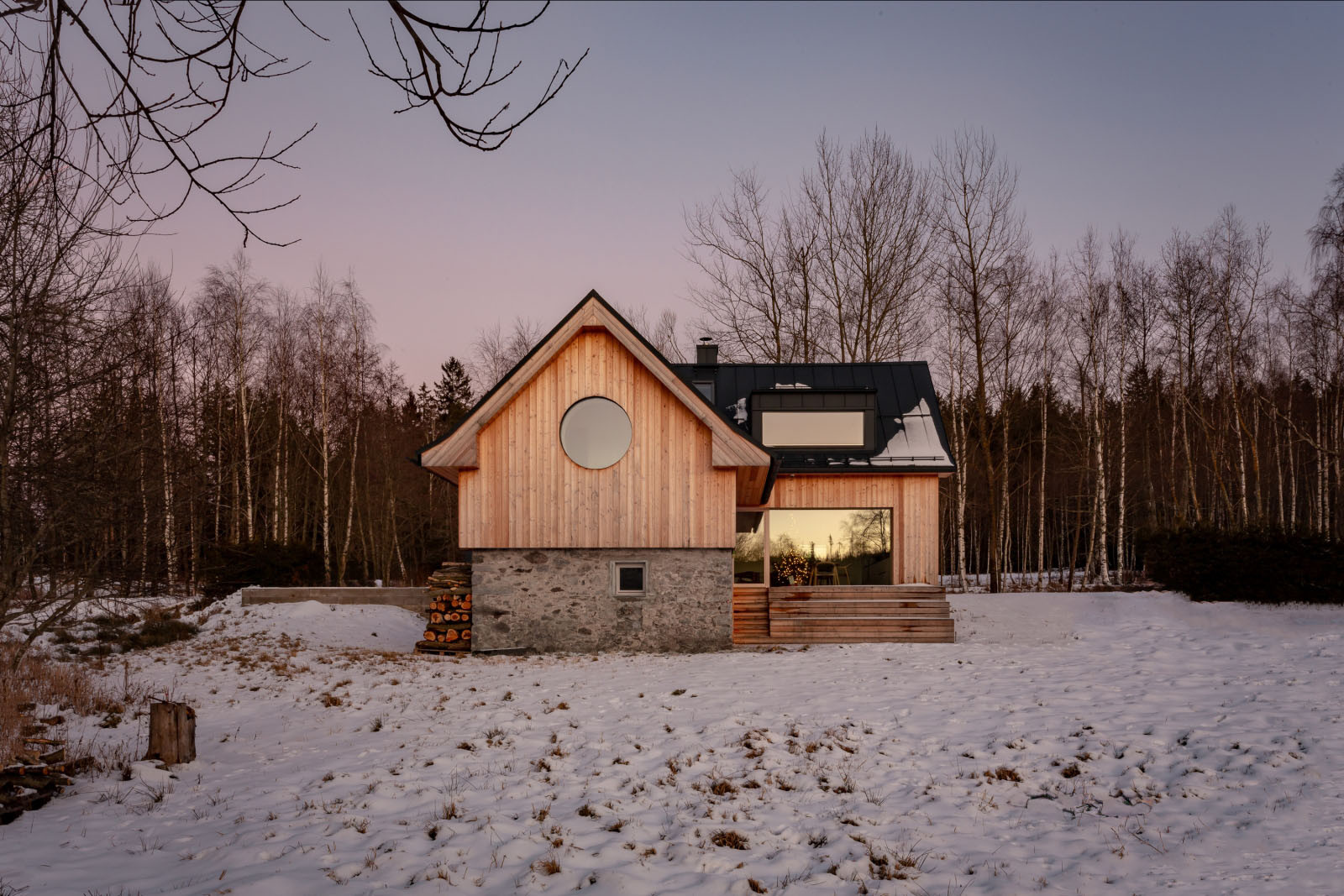 Obytné pokoje jsou posazené výš, otevírají se tak z nich výhledy na okolní lesy a pastviny. Hlavní obytná místnost s kuchyní se k nim obrací celou prosklenou stěnou. Obsahuje také dveře, a tak se tudy dá po venkovních schodech seběhnout přímo do zahrady.