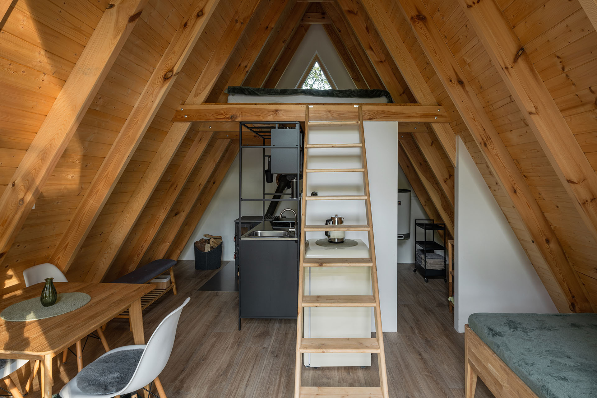 S vybavením interiéru panu Polákovi pomohla jeho manželka. Snoubí se zde industriální prvky zjemněné něžnými doplňky v duchu boho stylu. Největší důraz se opět kladl na přírodní materiály. „Interiér jsme co nejvíce zachovali v přirozených barvách dřeva. Chatku jsme se snažili ladit tak, abychom se v ní cítili příjemně nejen my, ale i další návštěvníci,“ říká majitel. Při vstupu do chatky vás přivítá otevřený a šikovně řešený prostor, který poskytuje vše potřebné. Nezatěžuje přebytečnými prvky či elektronickým vybavením – to vše ve smyslu maximálního odpočinku od okolního zrychleného světa.